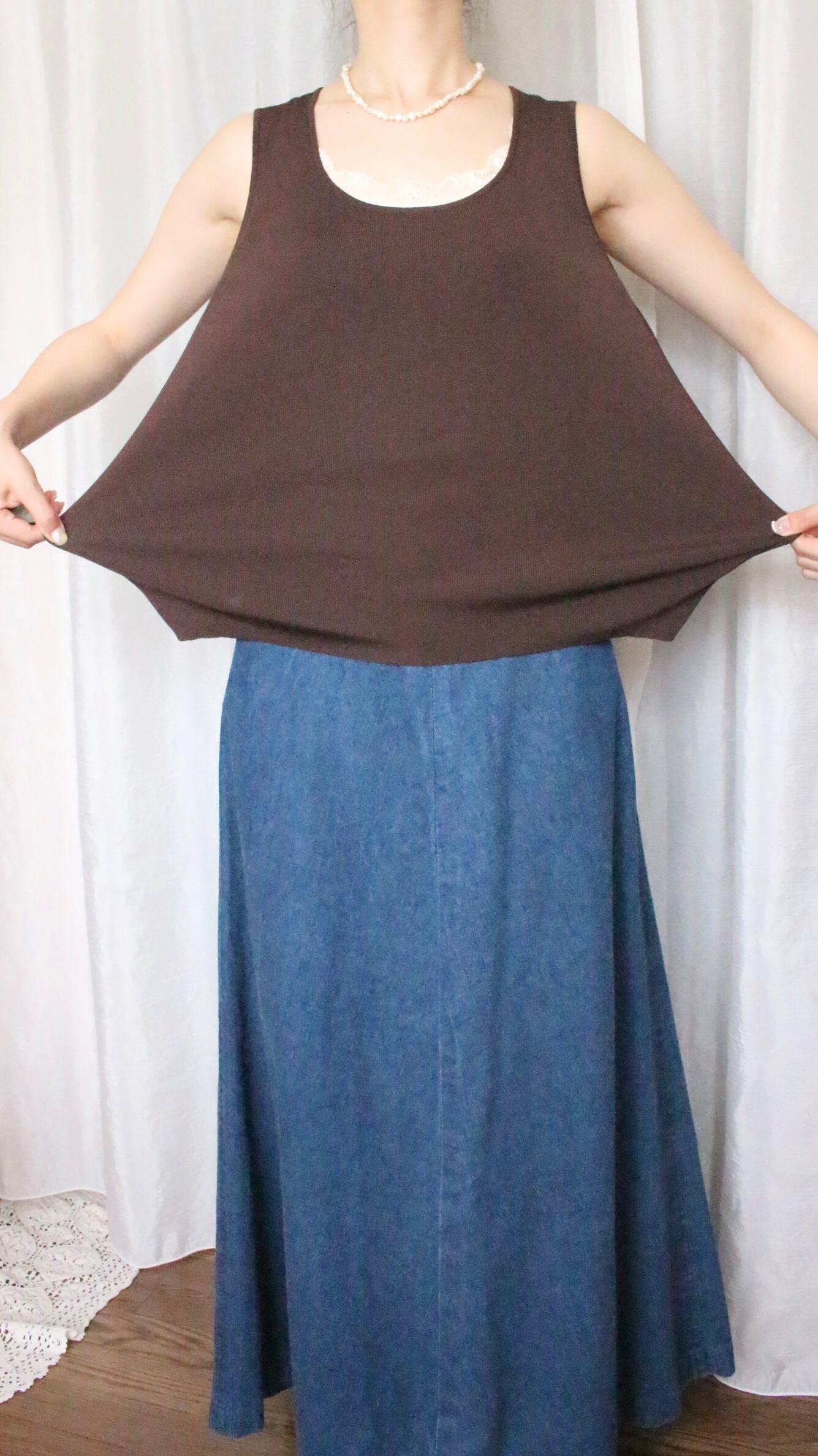 スタイリングのベージュのニットキャミソールとの相性がとっても良く、セットでのご購入もおすすめいたします。