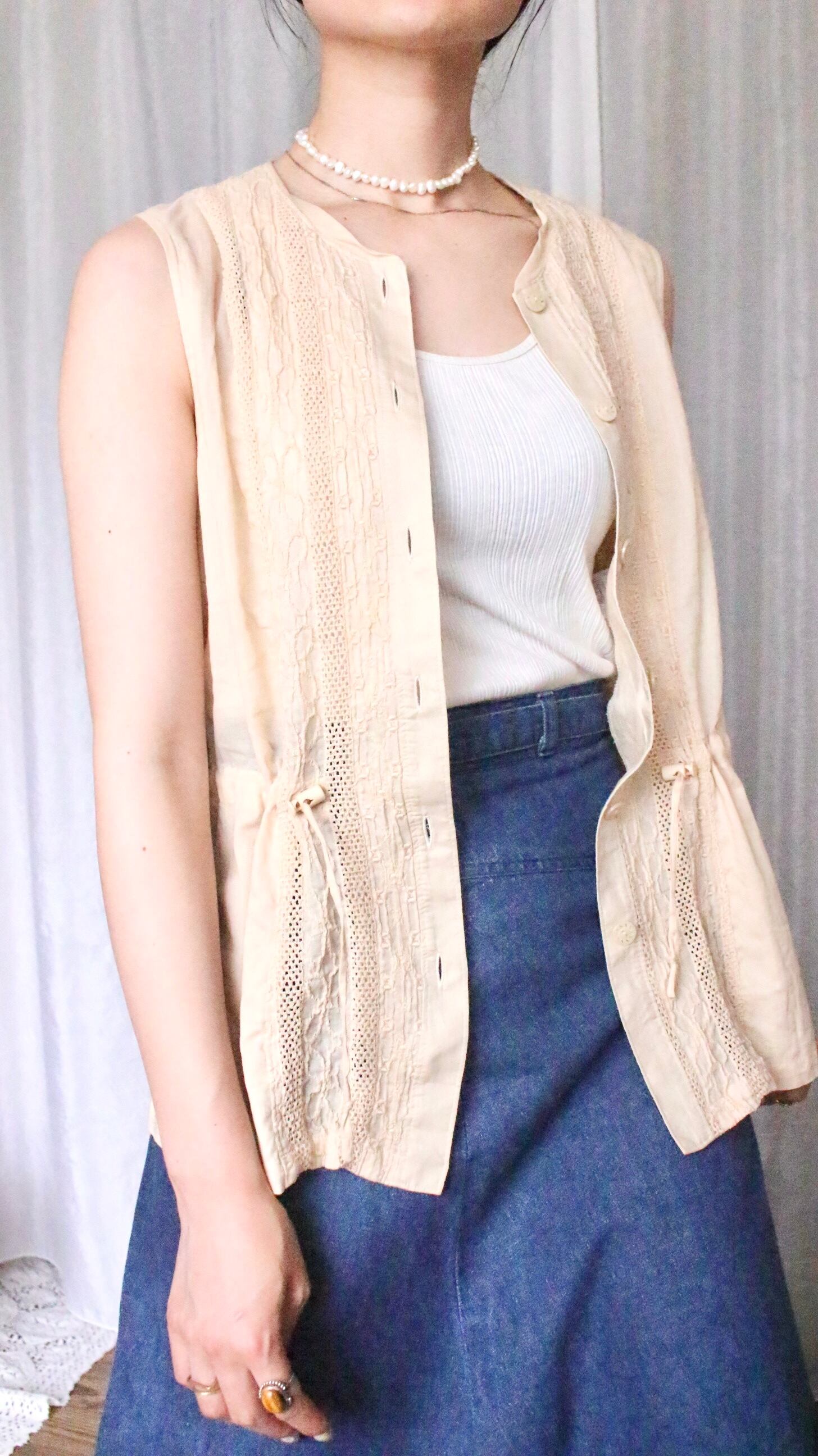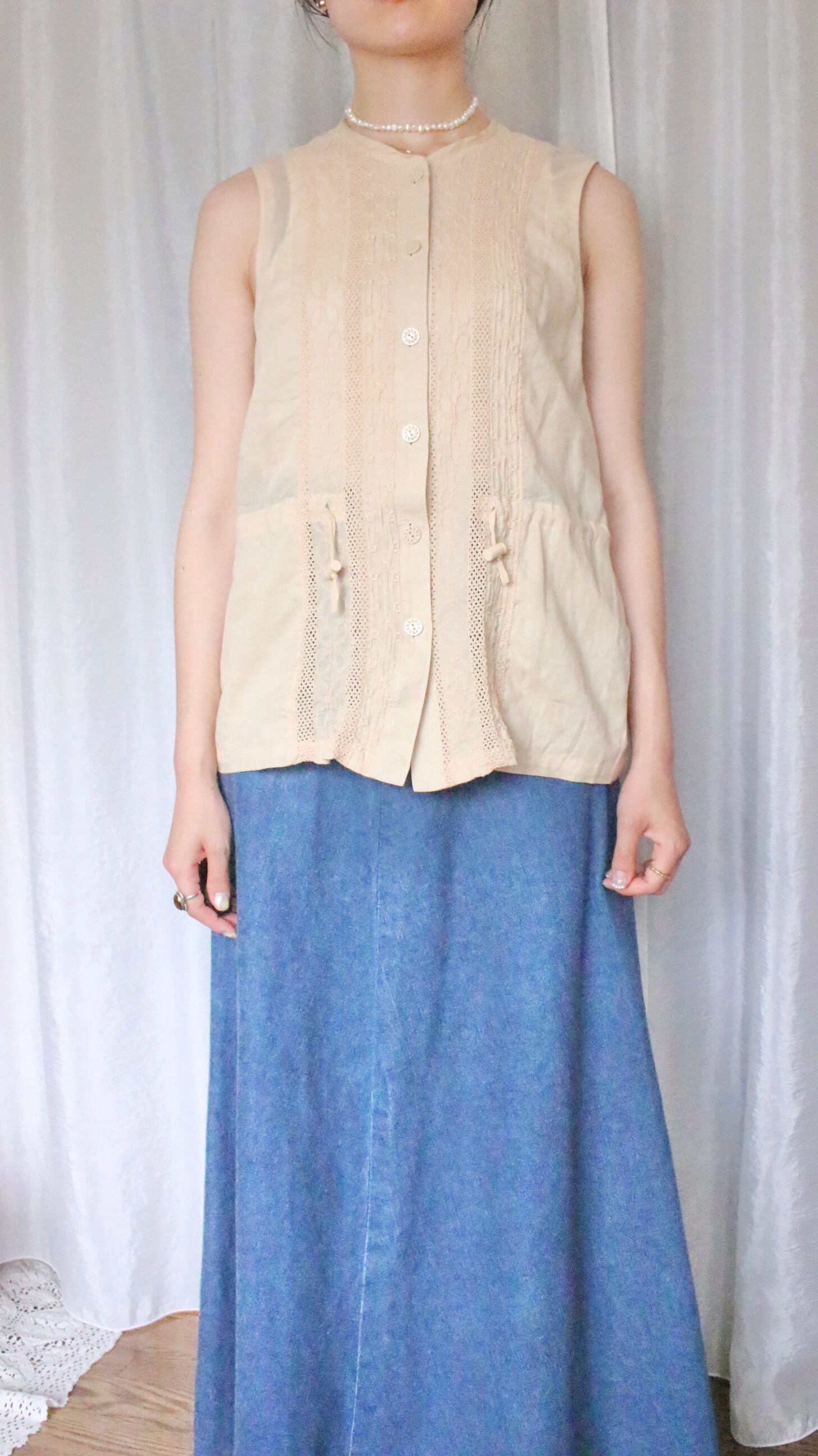 二の腕をカバーしたい方は、シアー素材の長袖トップスやキレイめ生地の半袖を下に重ねると上手くまとまります(色はホワイト、ブラウンなどがおすすめ)