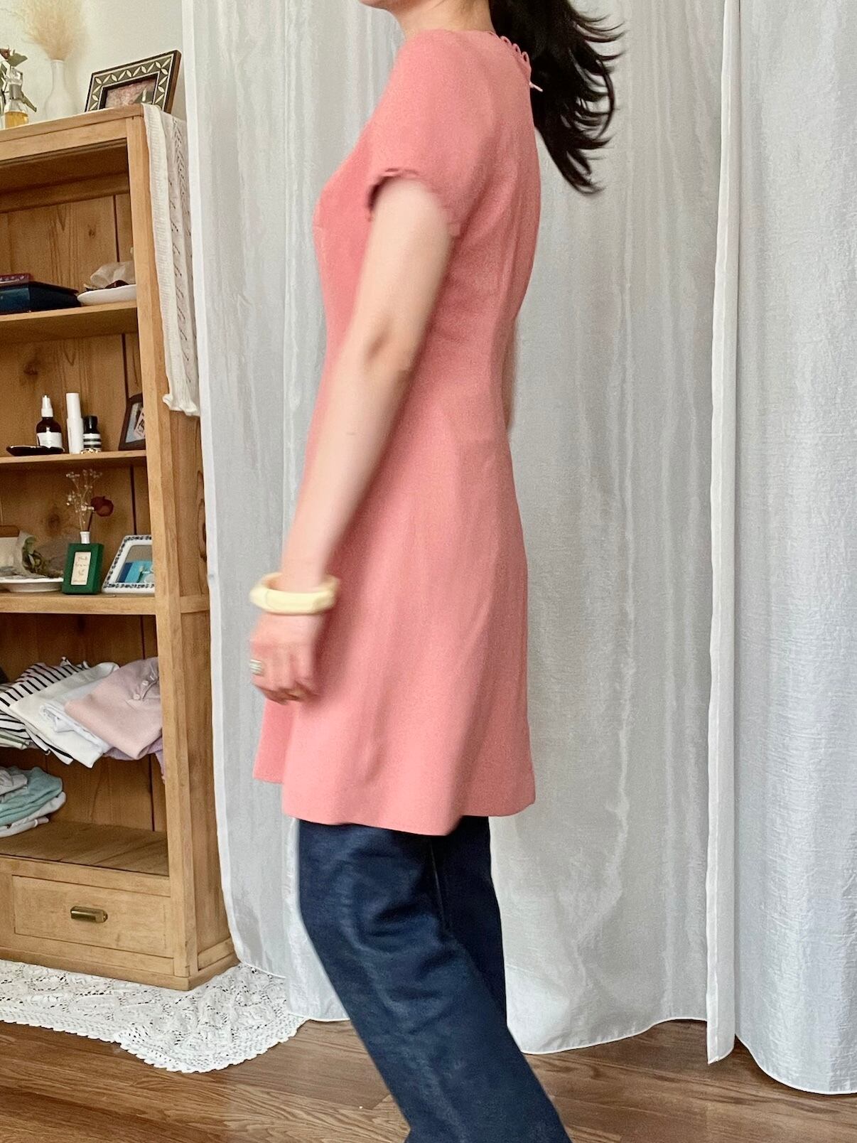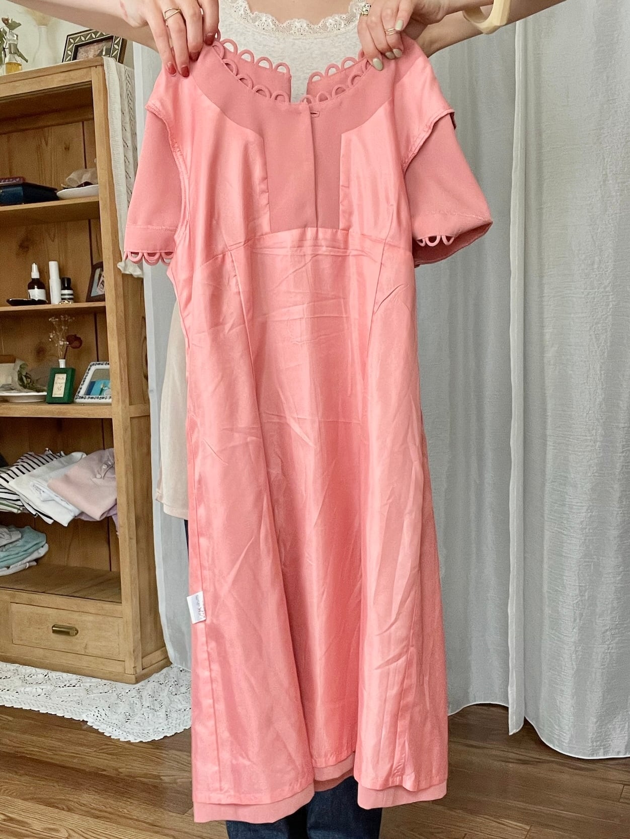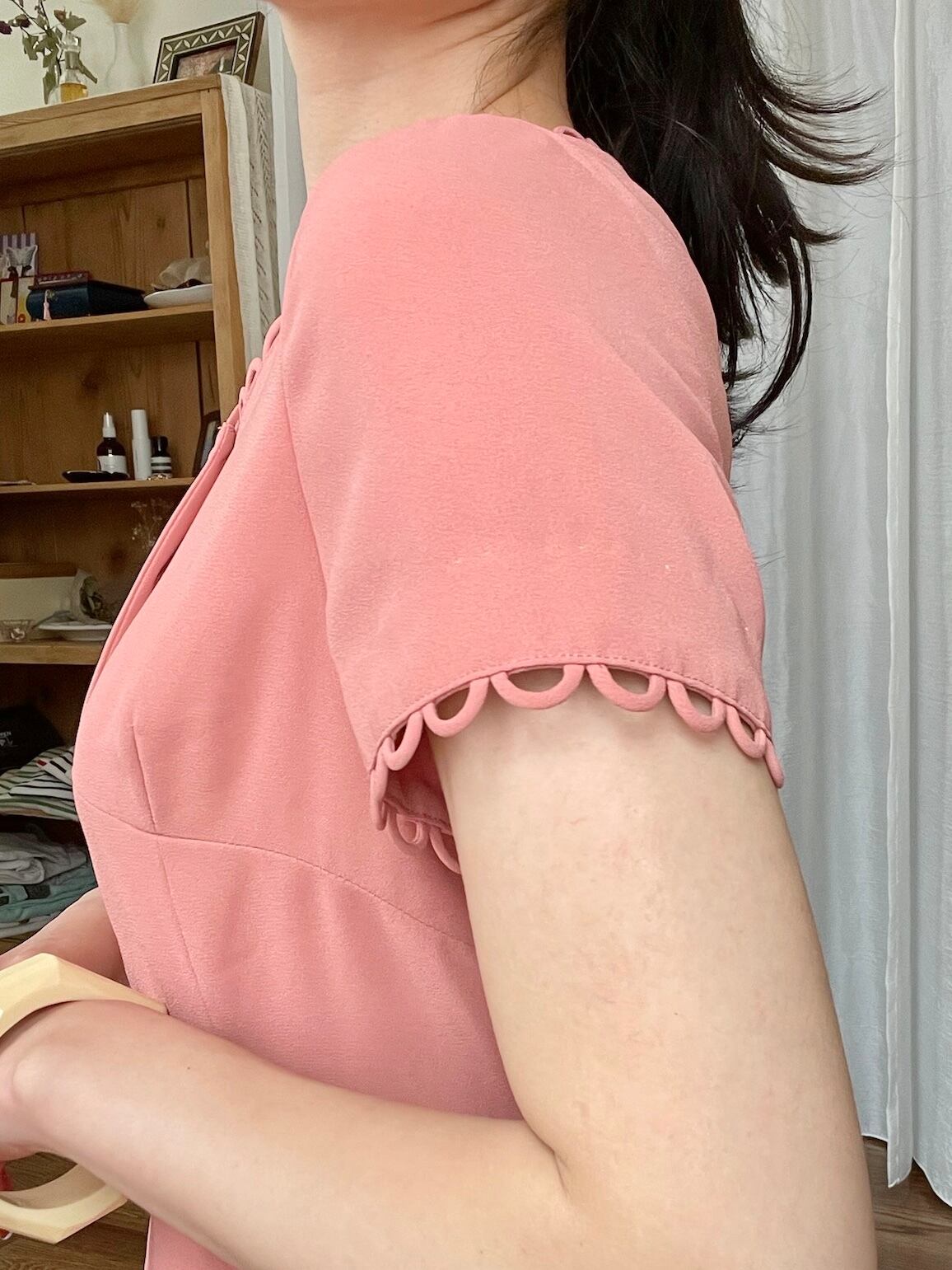 温かみのあるサーモンピンクカラーで気分が明るくなるワンピース。