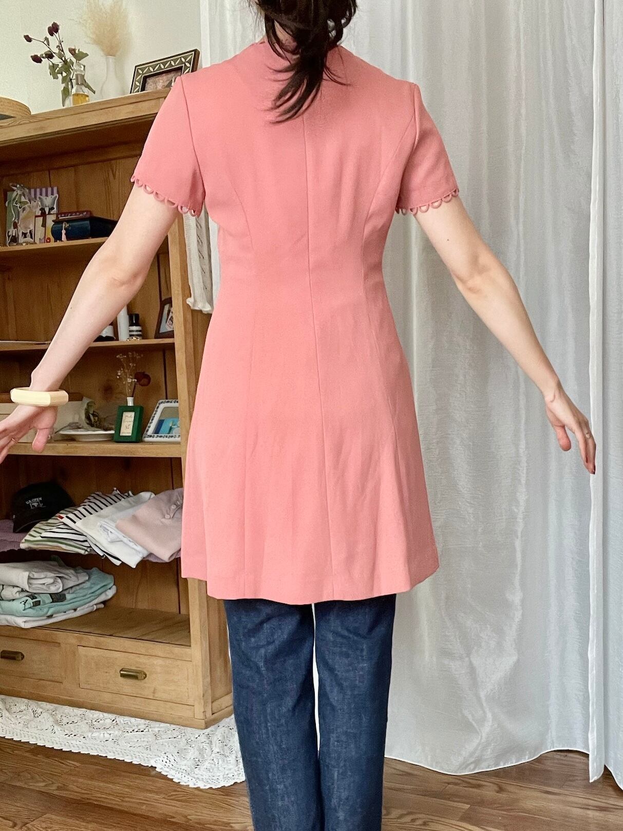 丈が短く感じる場合は、長めのチュニックのような感覚でデニムパンツや透け感のあるニットパンツやシアー生地のパンツなどと合わせていただくのもとても可愛いと思います。