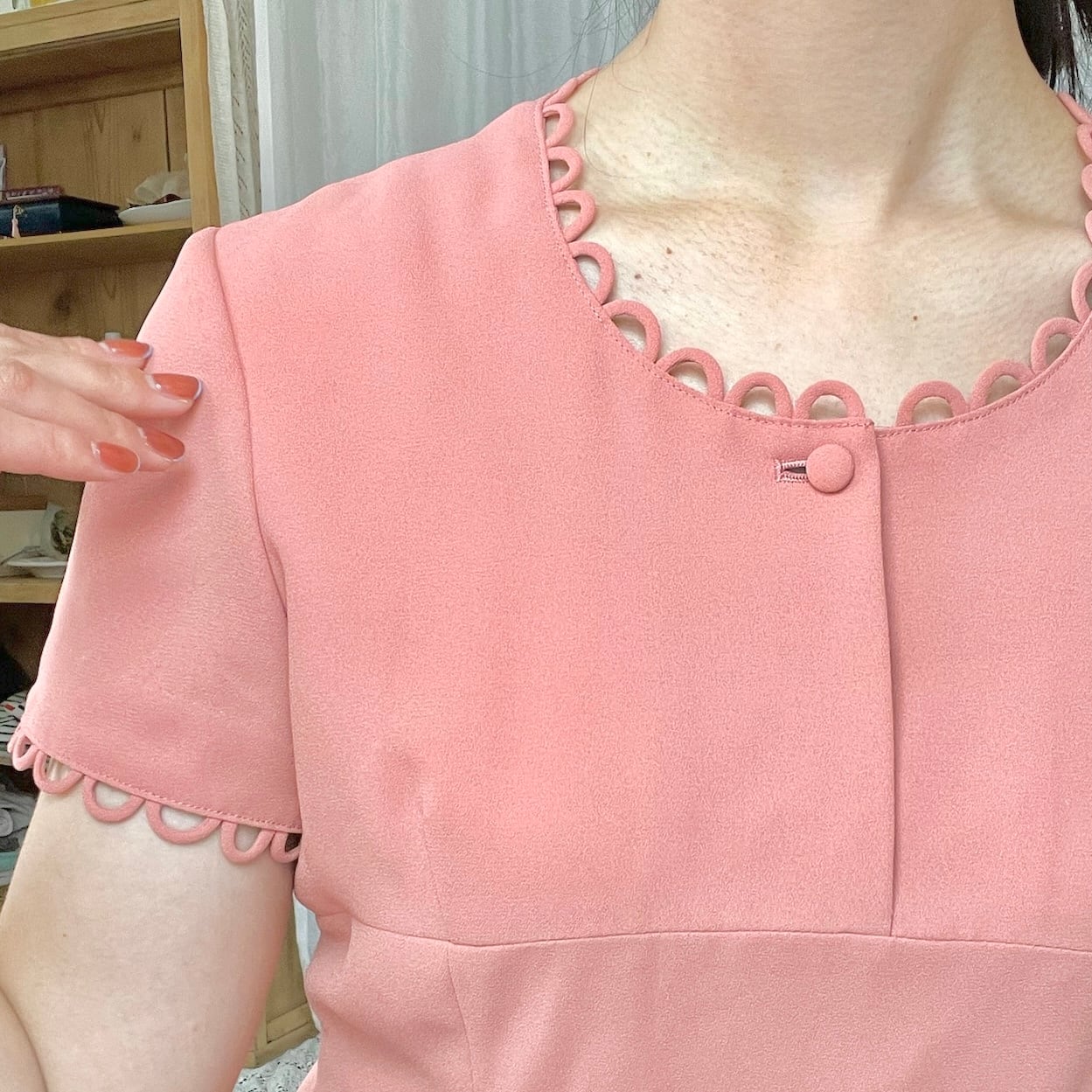 襟ぐりとお袖のデザインがとってもキュートで可愛らしい一着です。