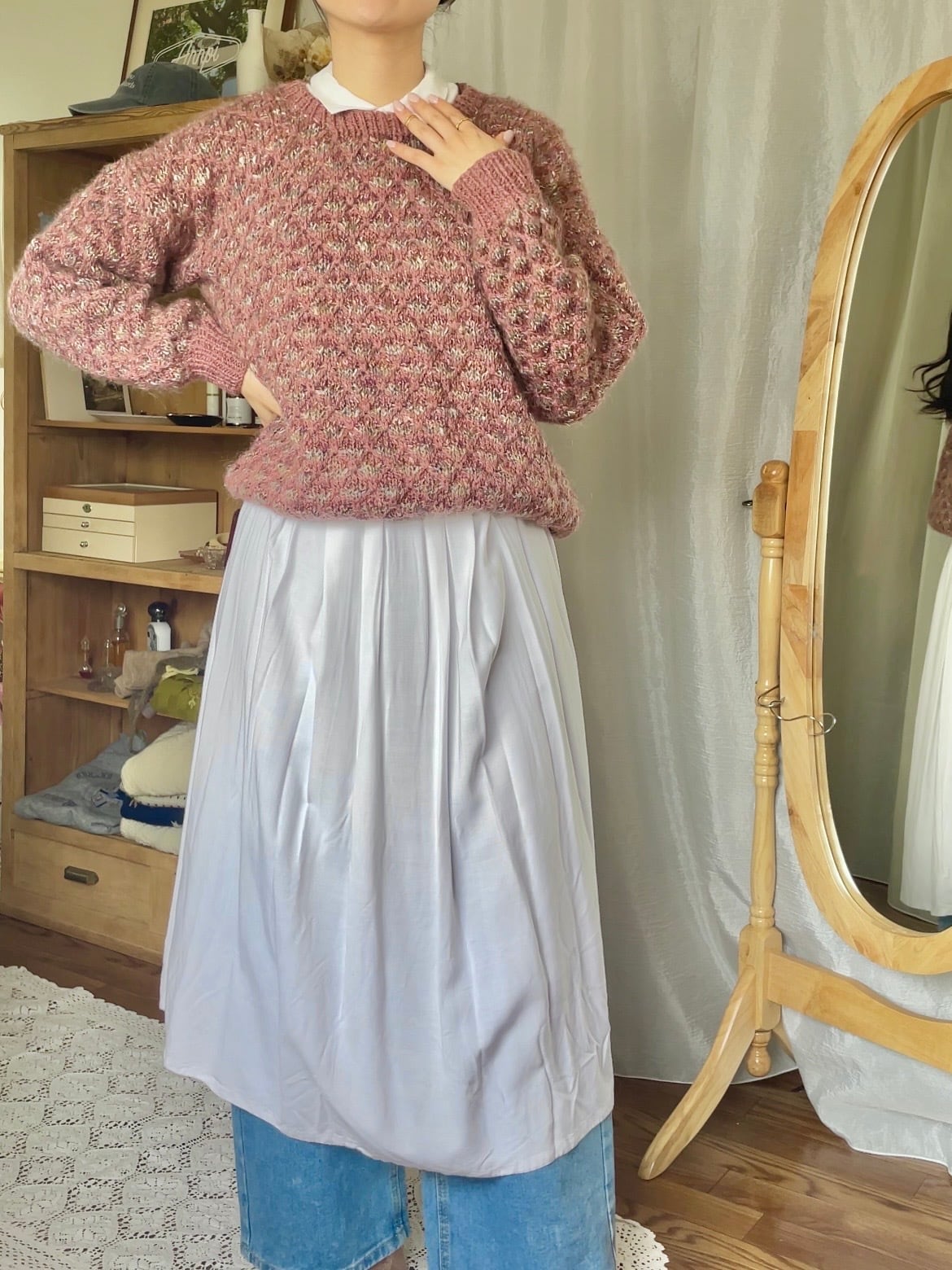 生地は透け感があるので、下には白いアンダーウェアとボトムスにはデニムなどを合わせてみてください。