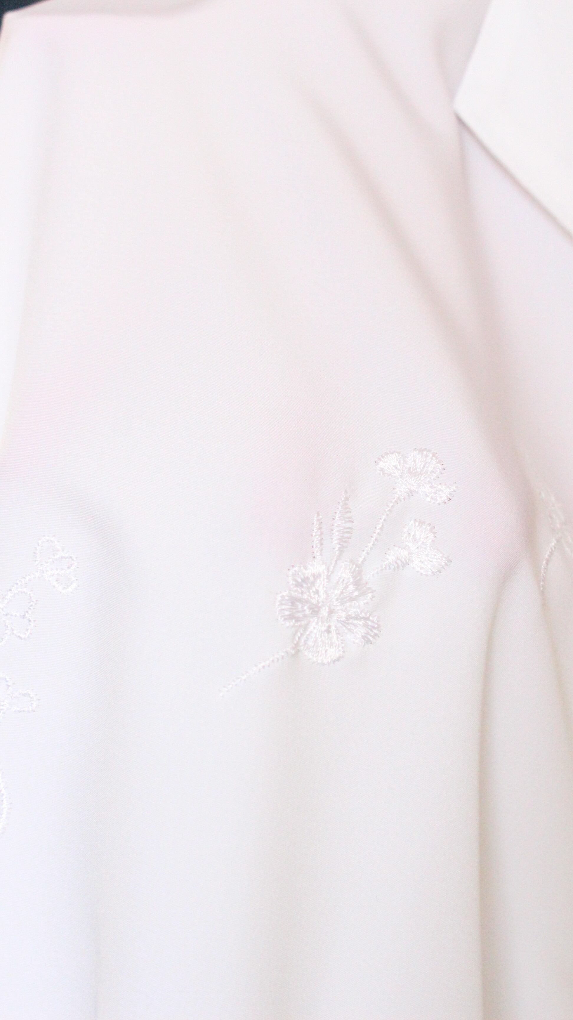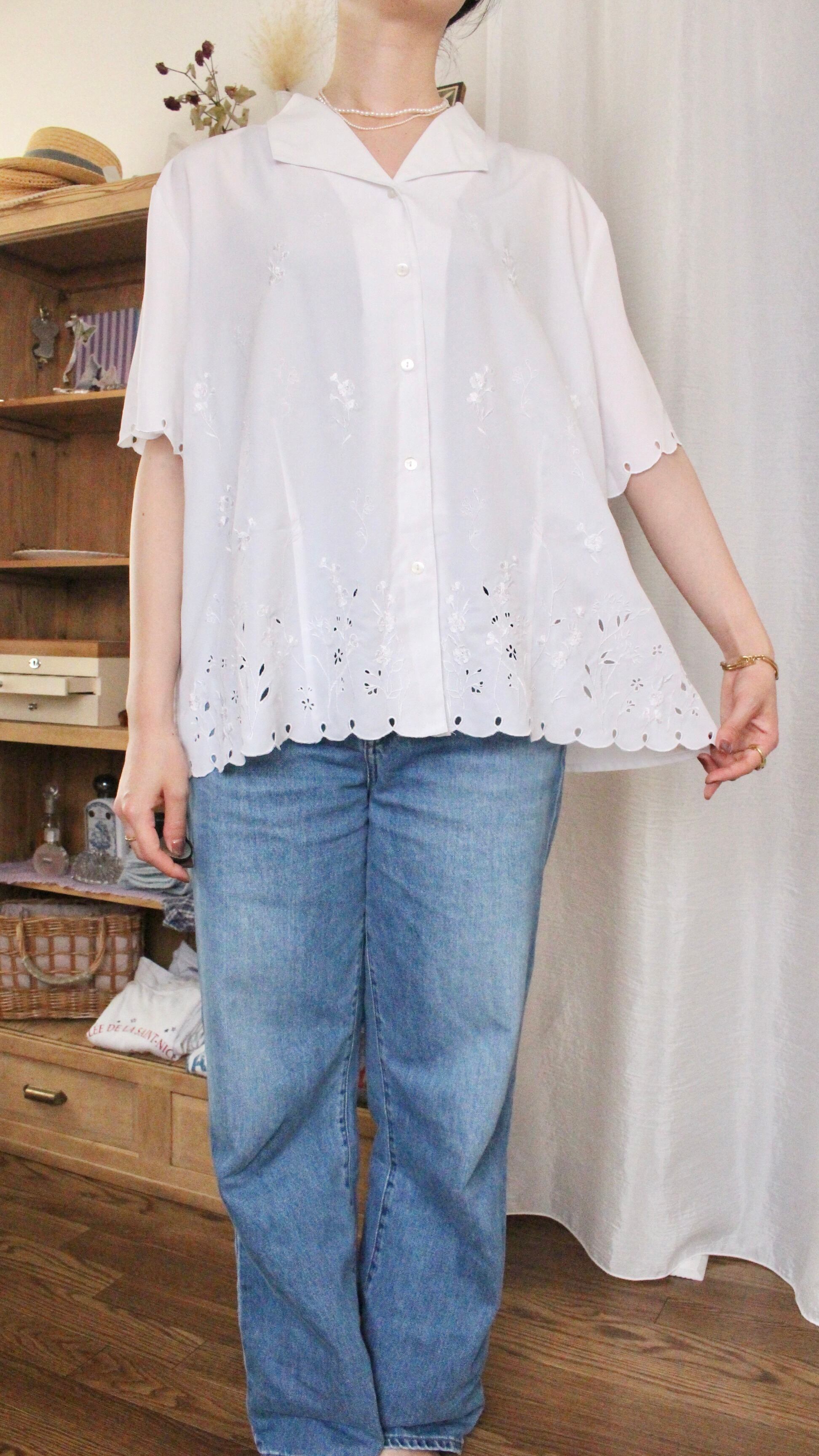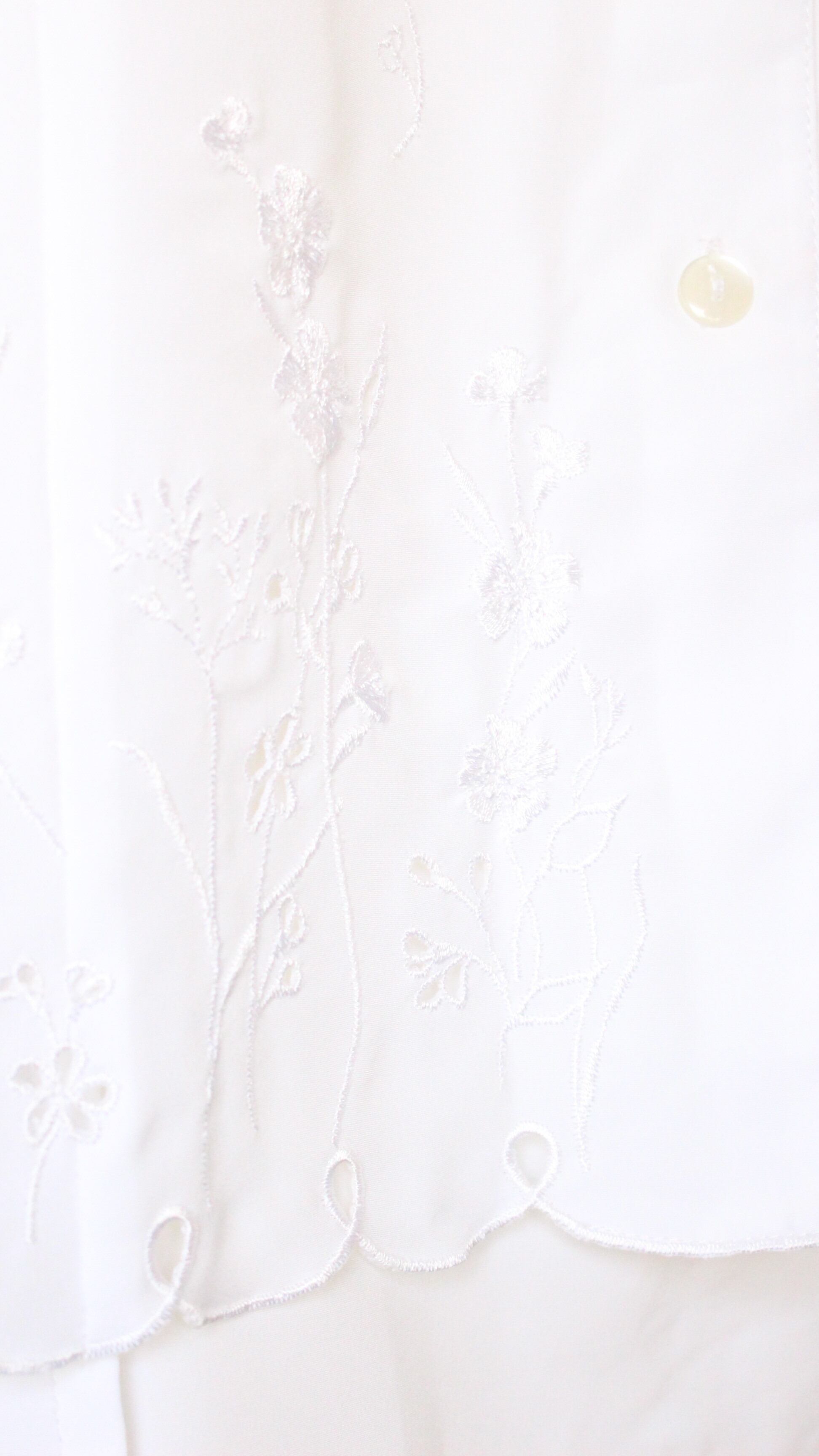 透け感のあるポリエステル生地が涼し気で、袖や裾のレースの透かしデザインがかわいらしい一着。
