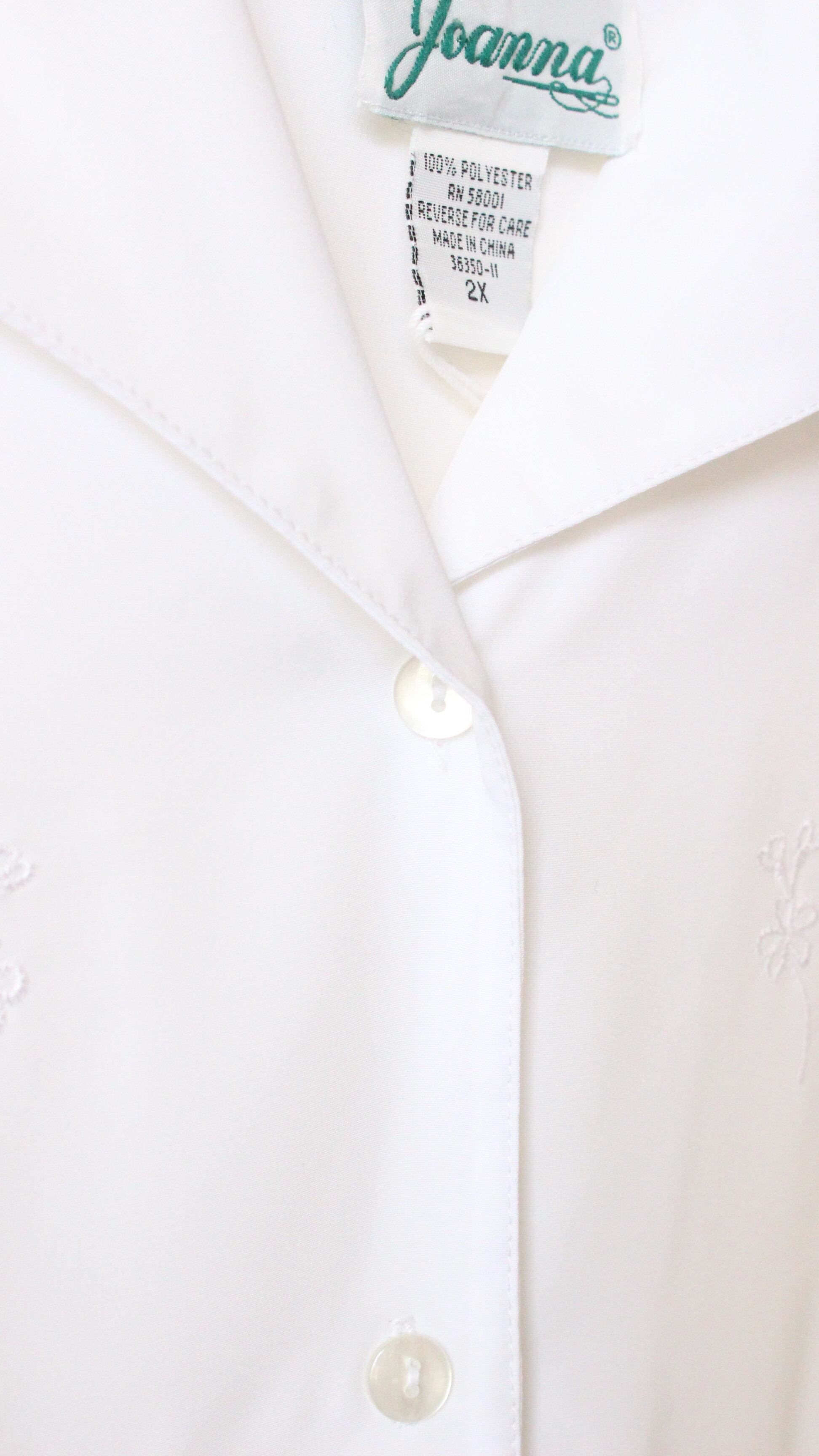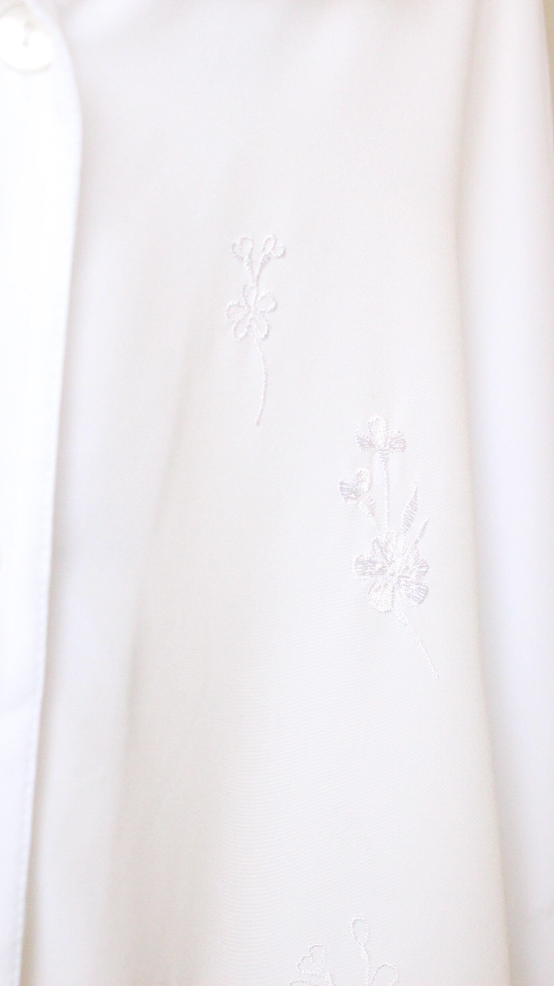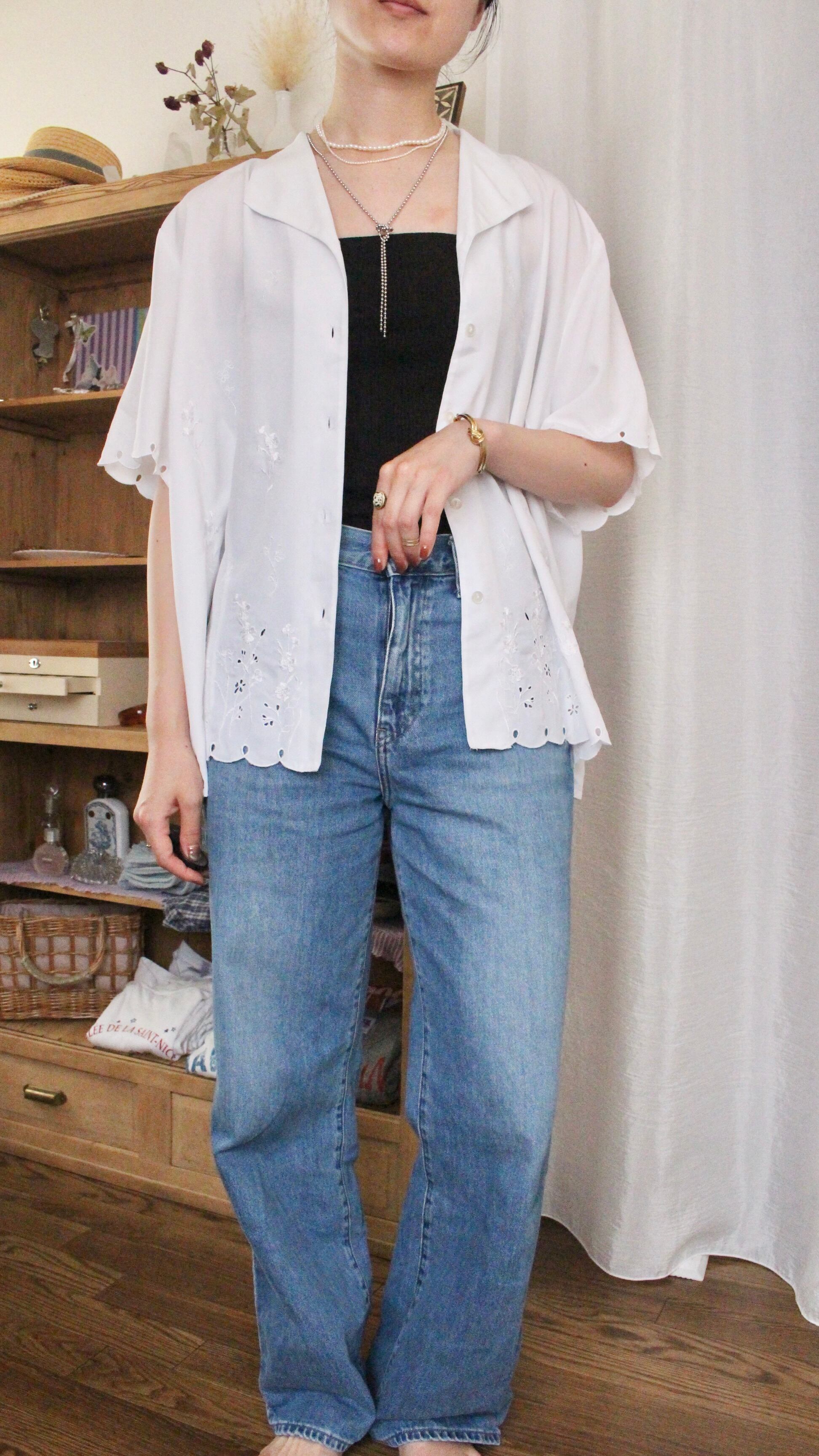 透け感のあるポリエステル生地が涼し気で、袖や裾のレースの透かしデザインがかわいらしい一着。