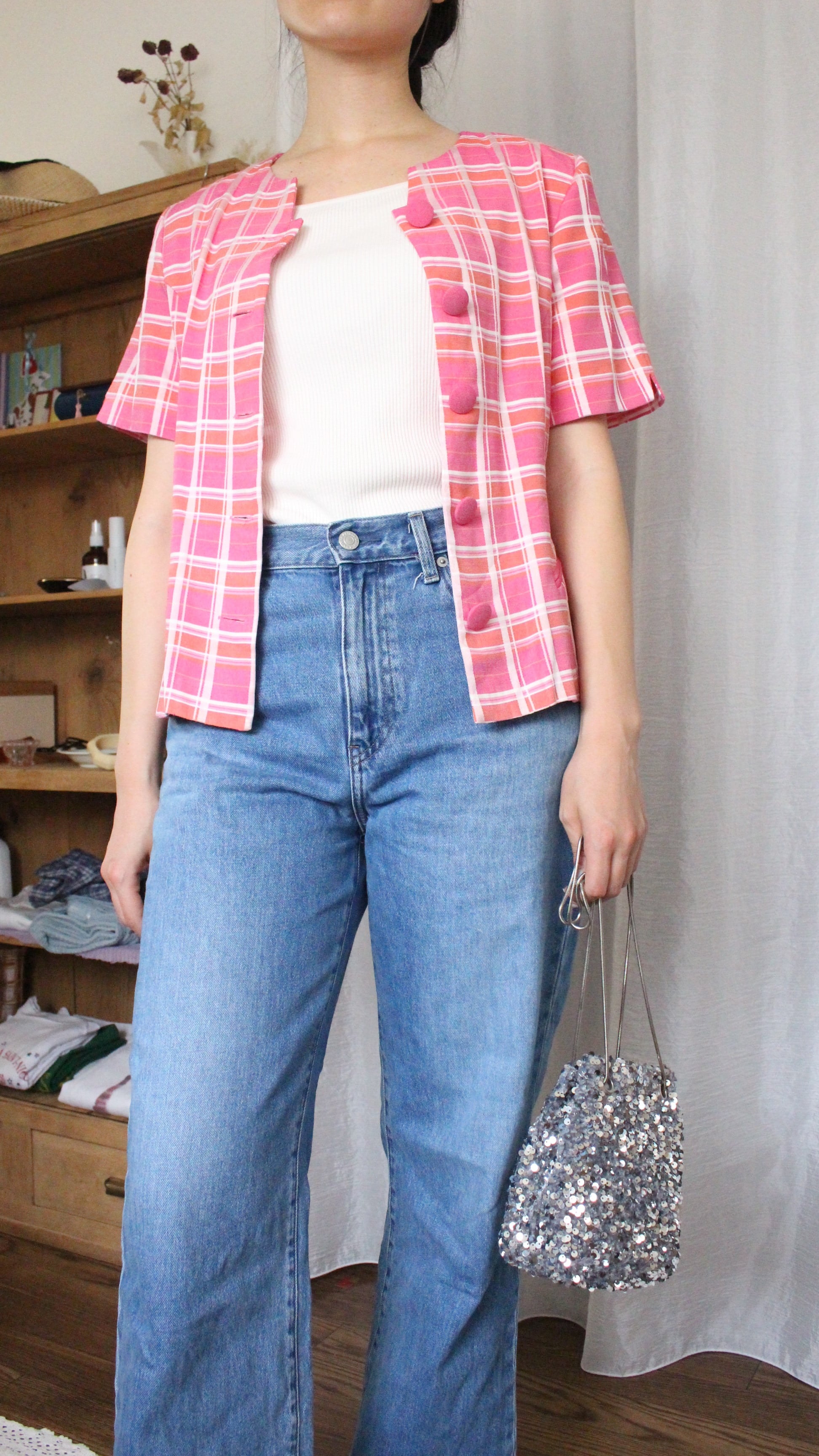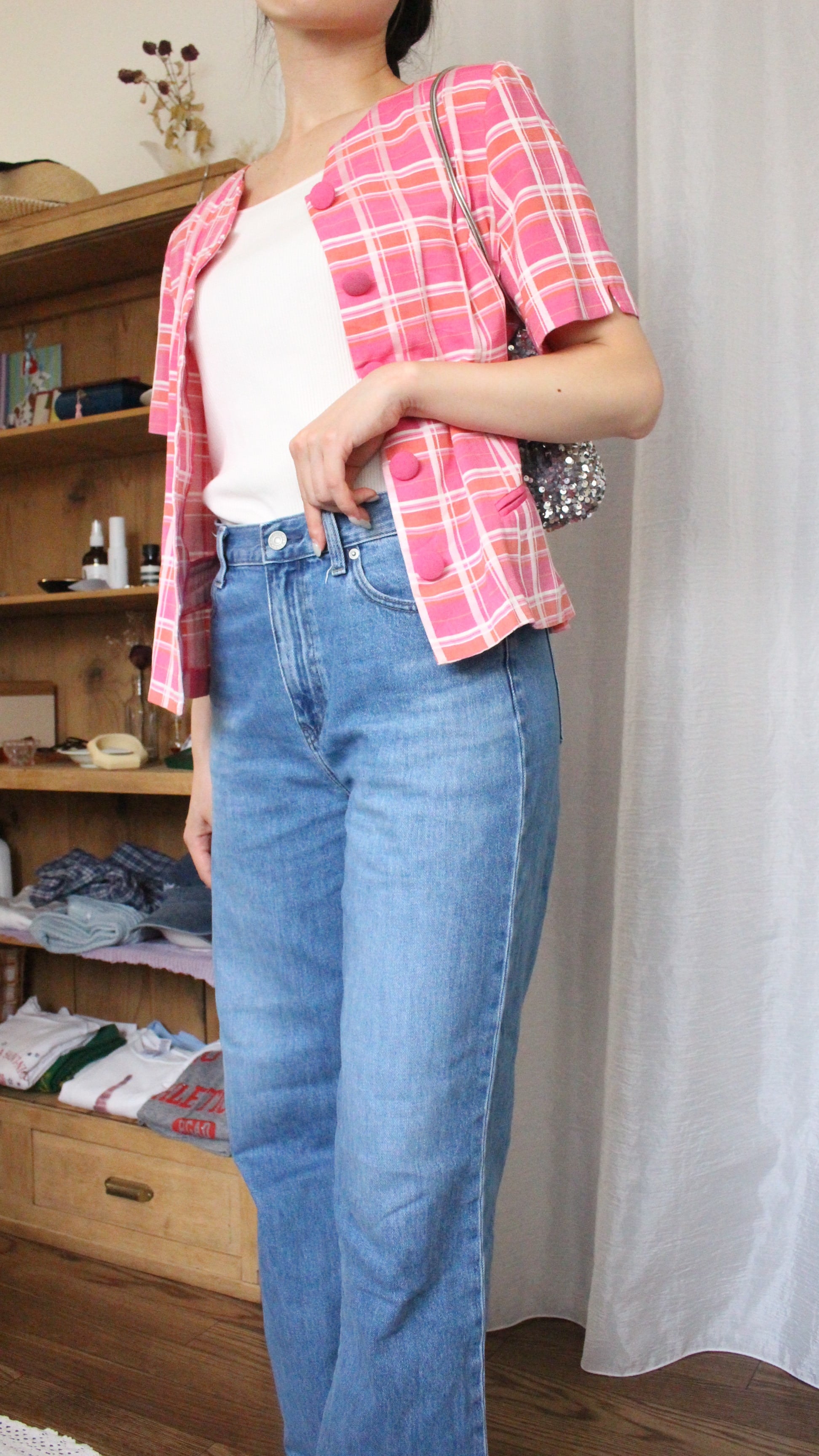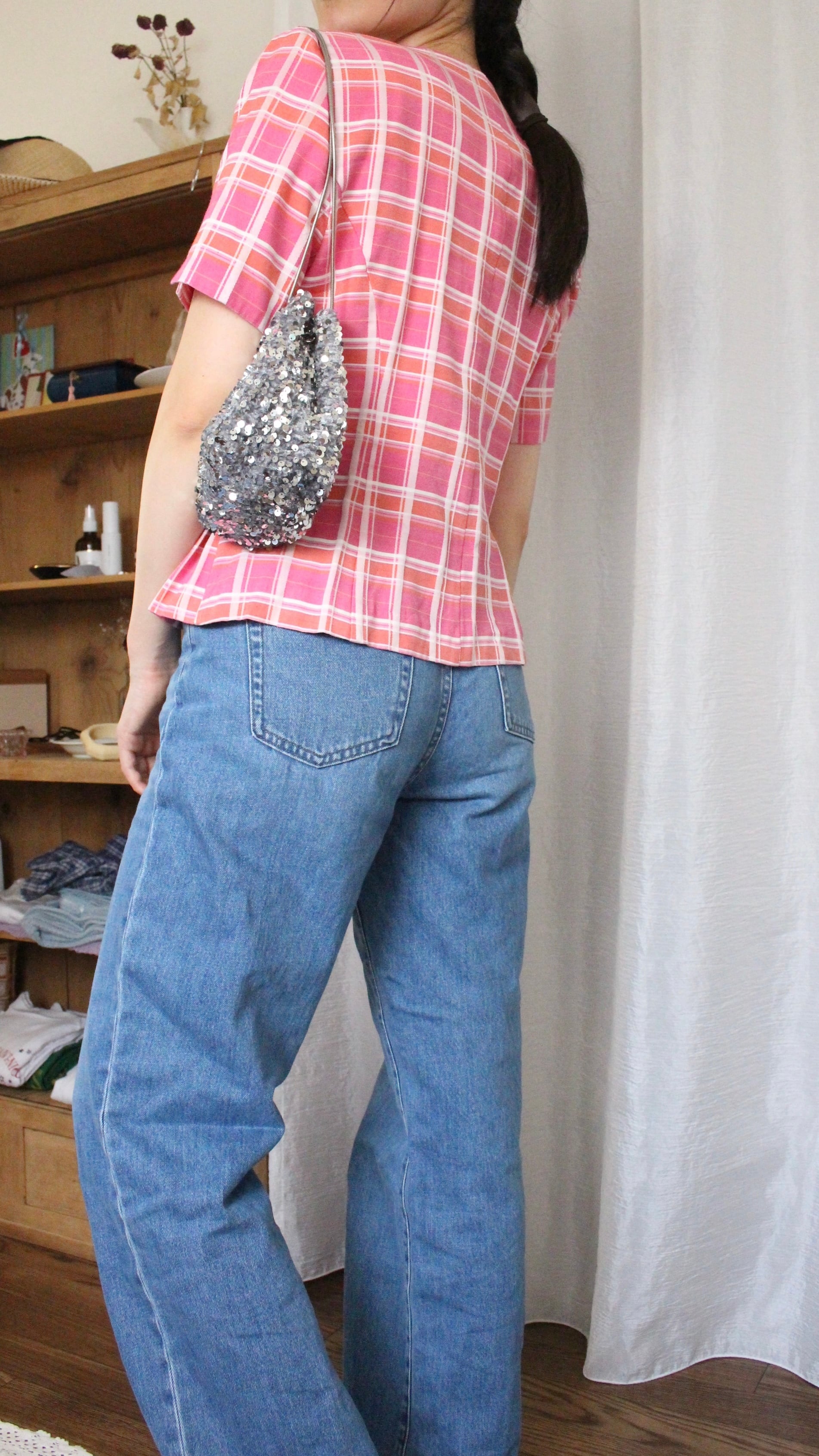 レトロチェックブラウス ピンク【】