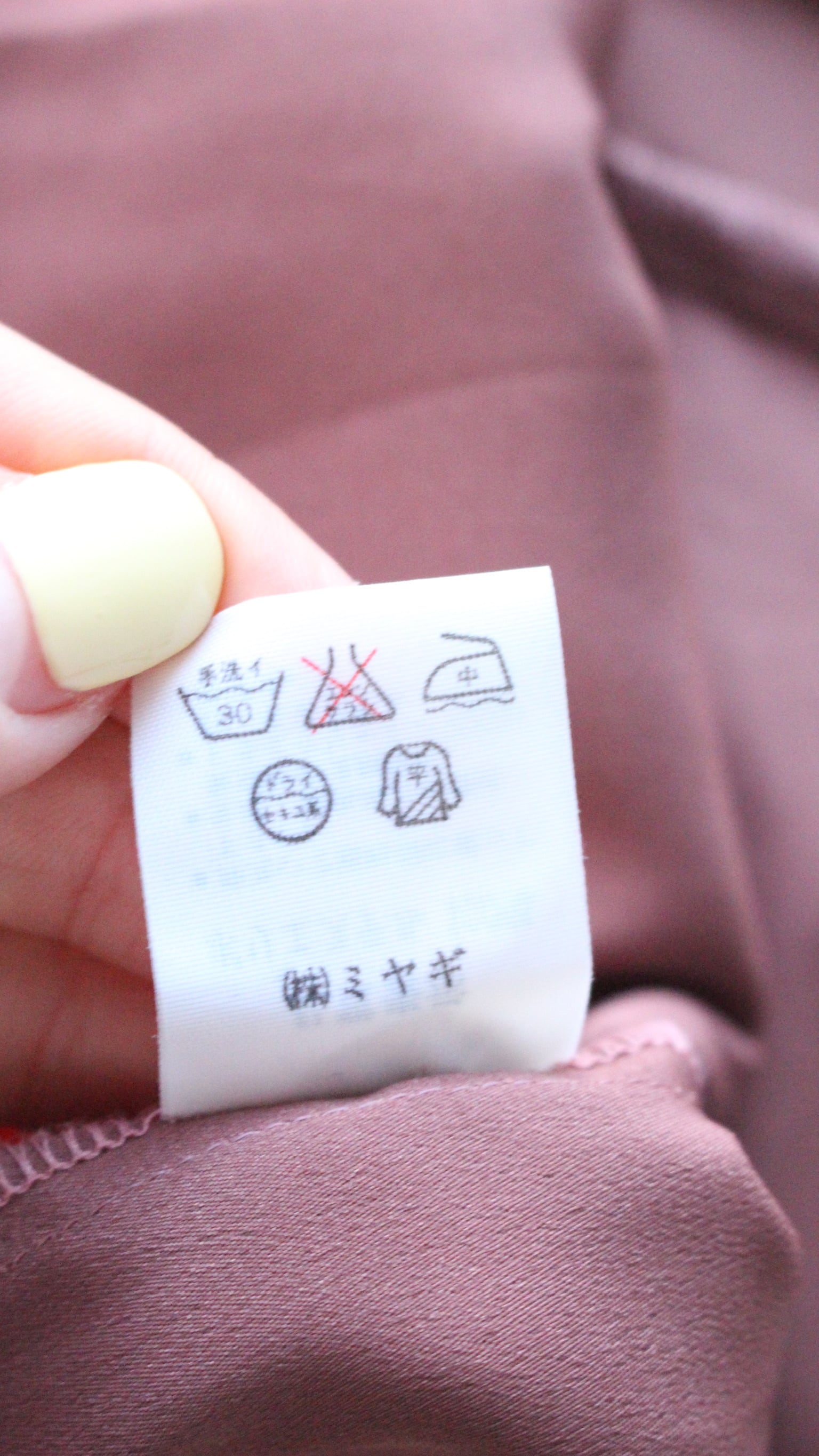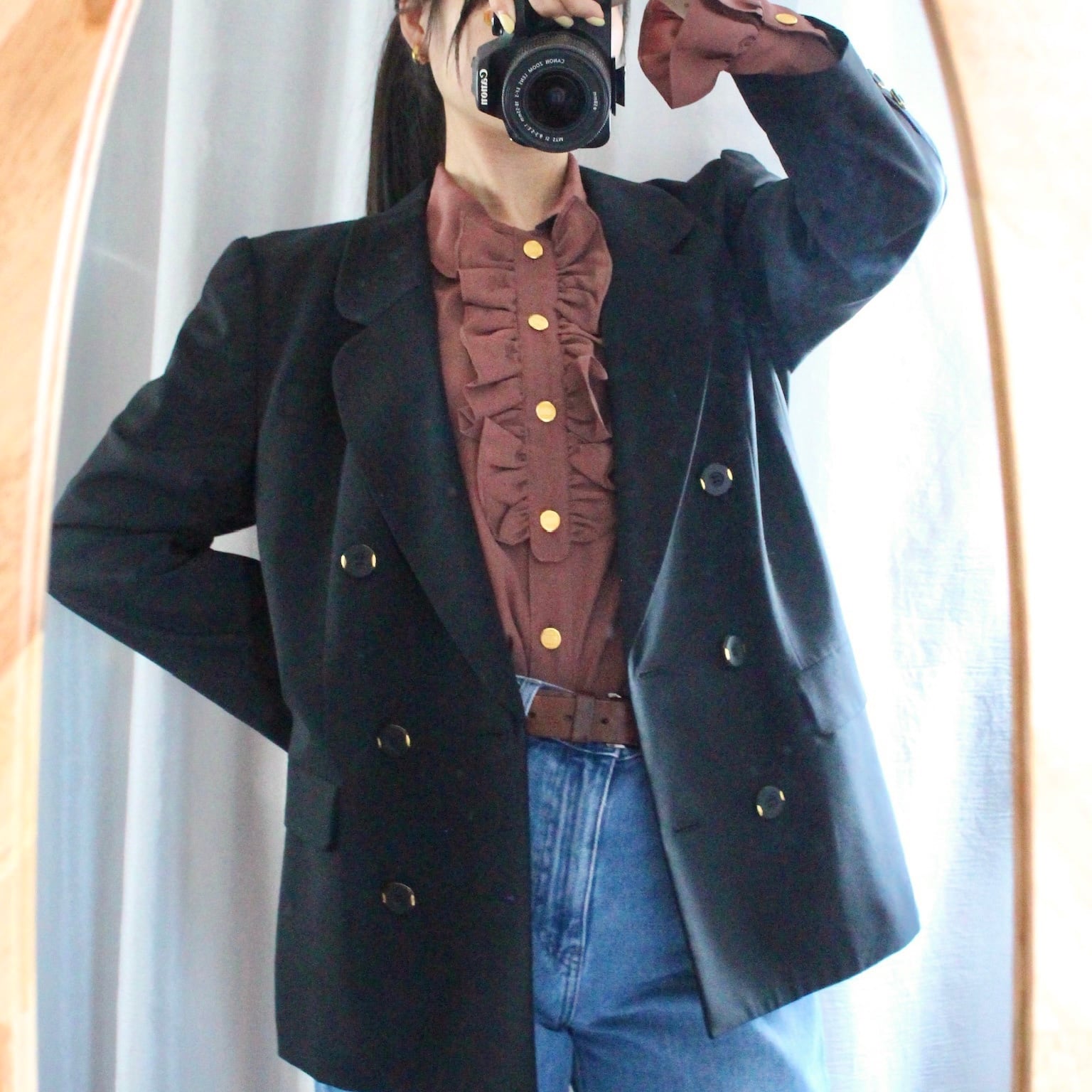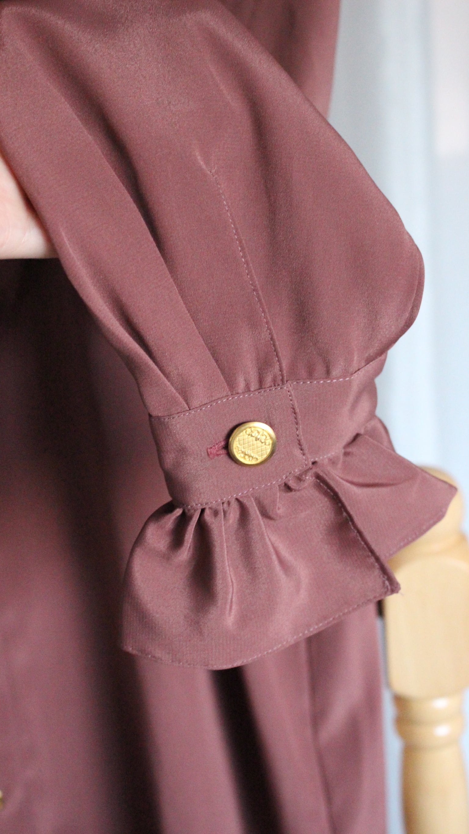 襟元と袖下のフリルが華やかで、鮮やかすぎない控えめなピンクとゴールドのボタンが相まって大人かわいい雰囲気の一着。