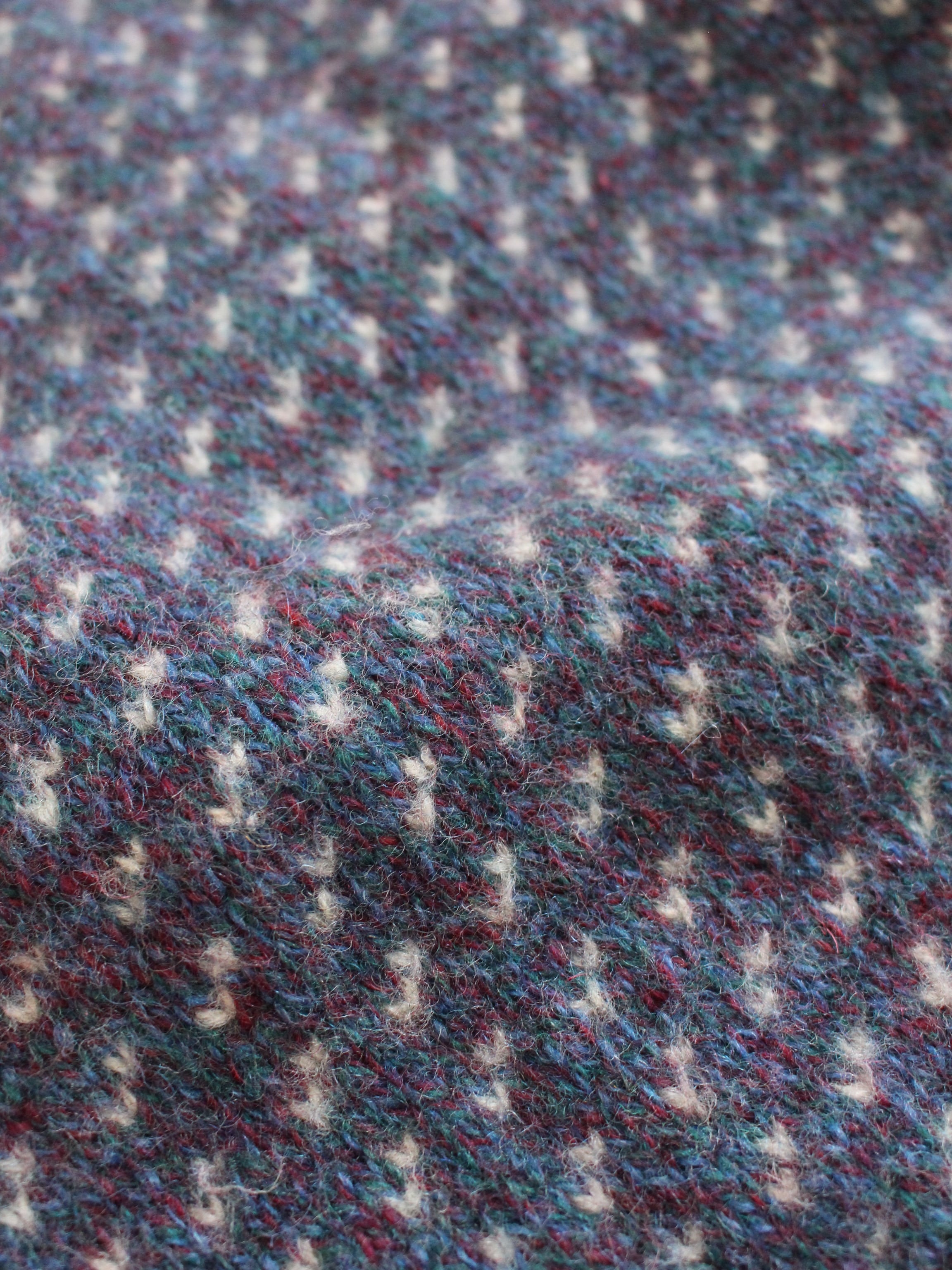 合わせる色はニットに入っているブルー、緑、パープル、白はもちろんのこと深いブルーと対照的なパステルのイエローピンクなども意外と新しい組み合わせでポップで可愛い雰囲気に仕上がるかと思います。