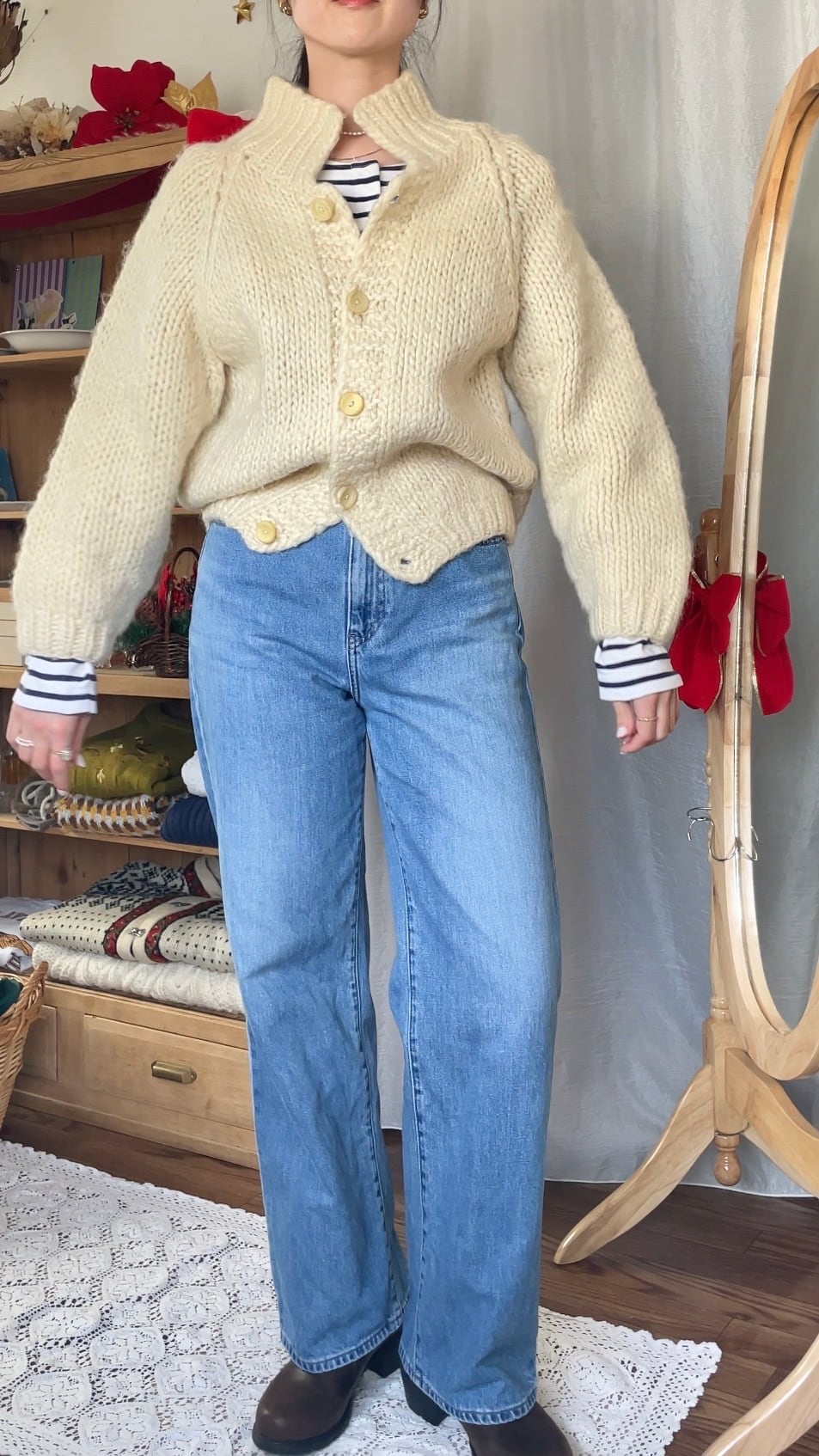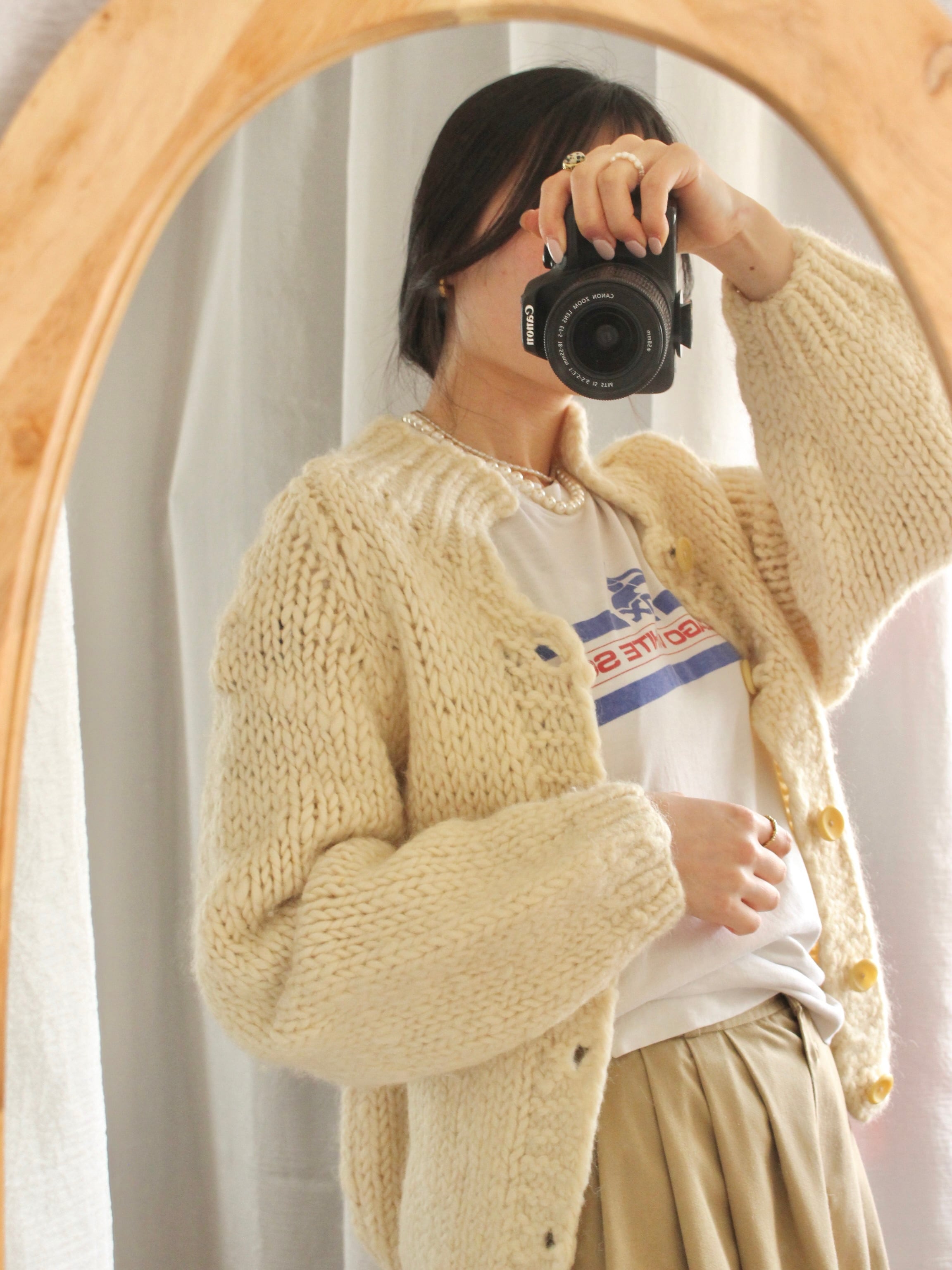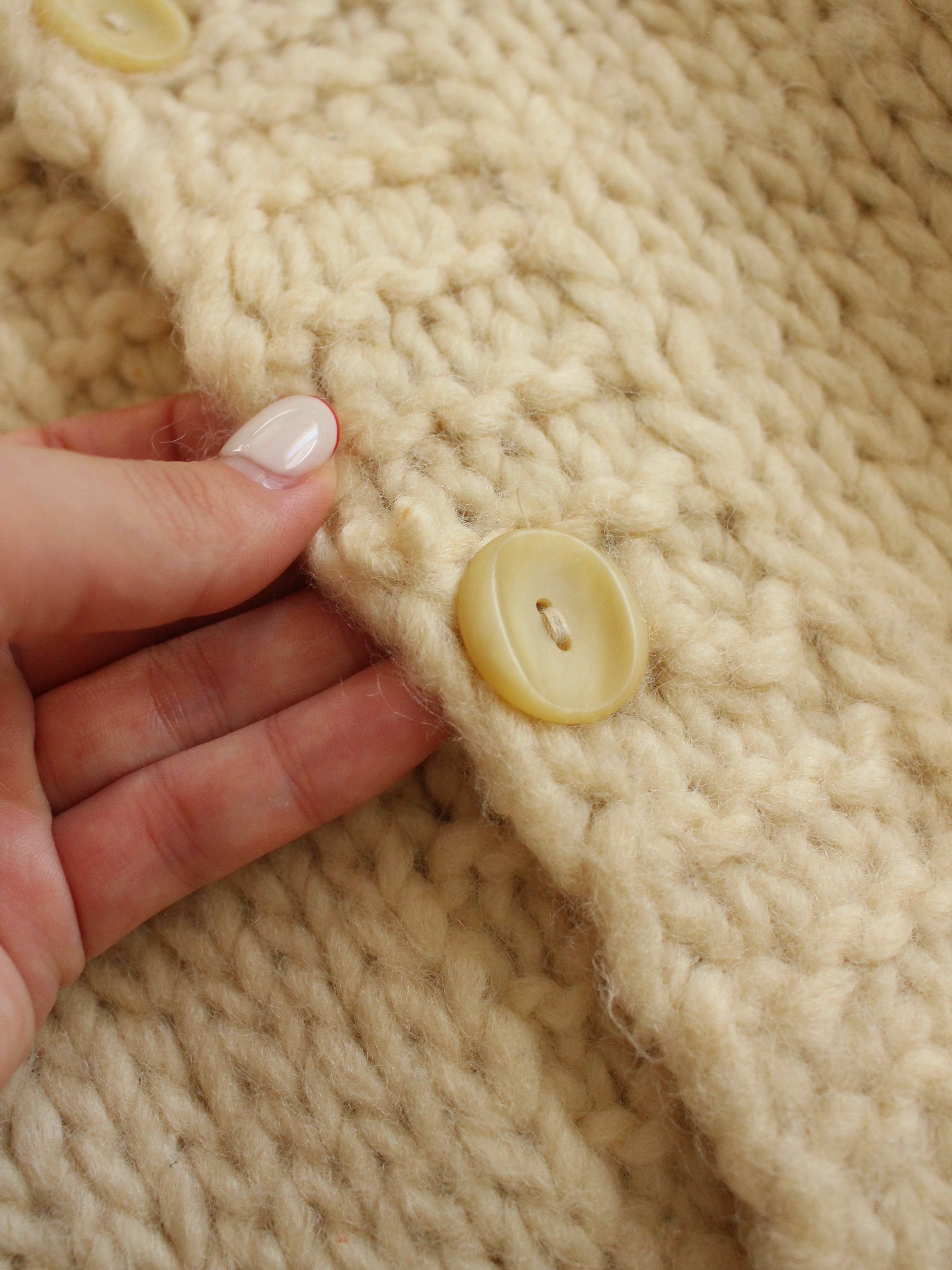 全体的に丸みのある形がとても可愛い厚手の暖かいニットカーディガン。