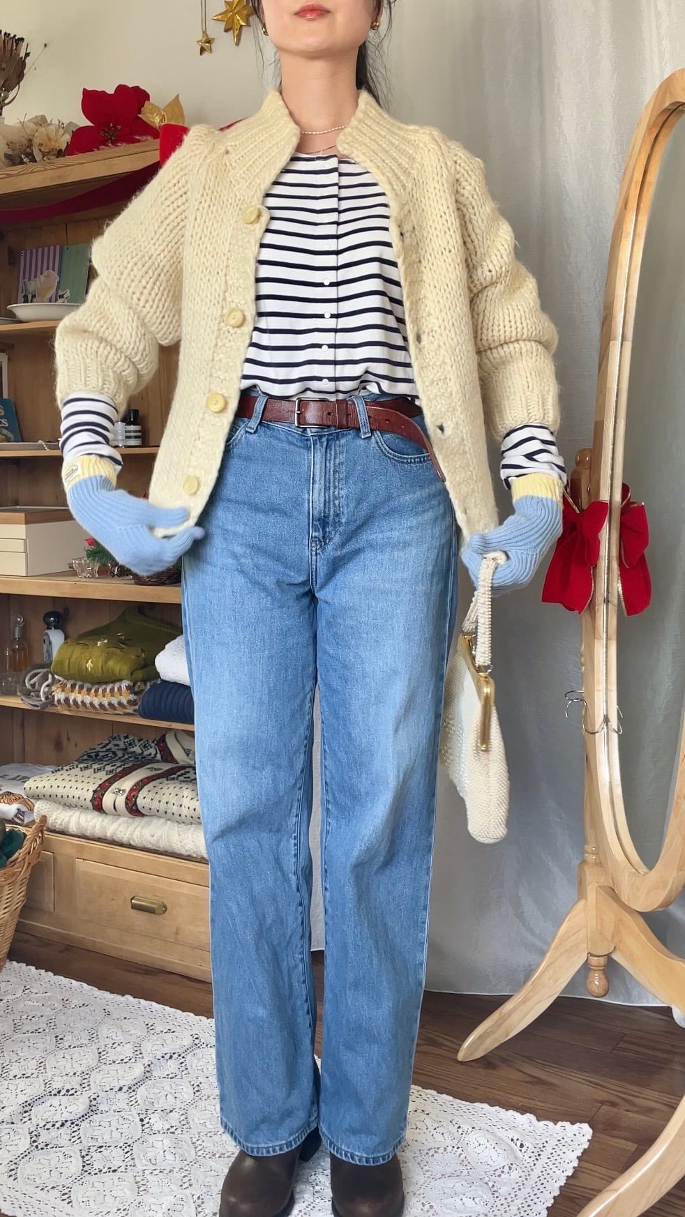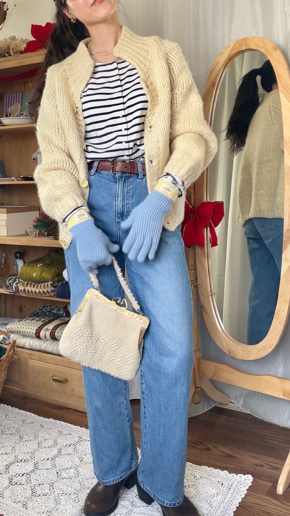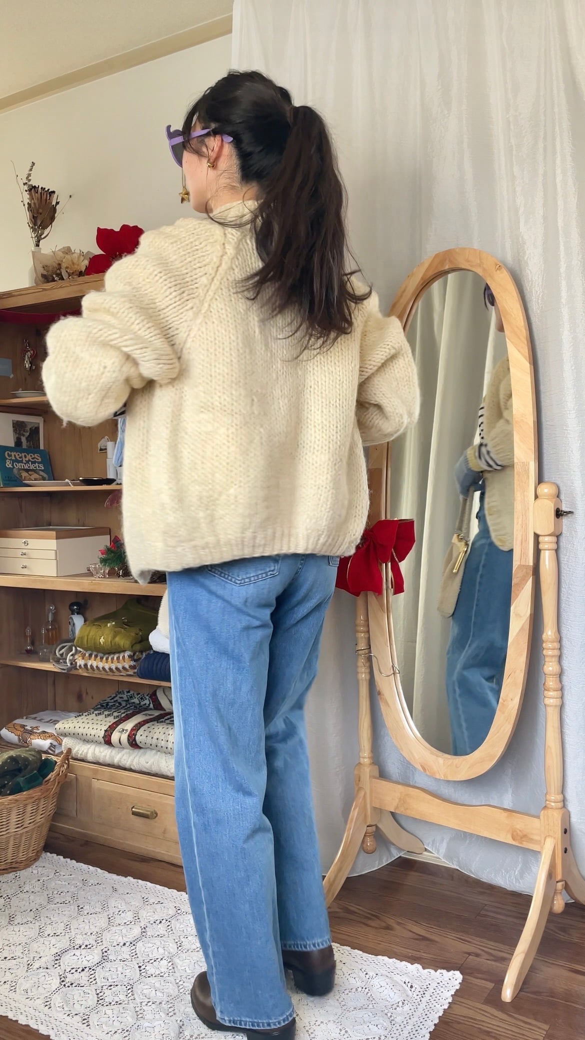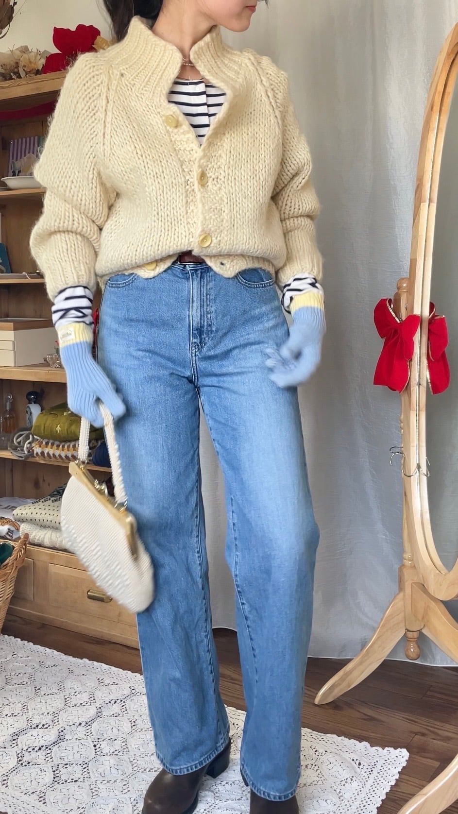 全体的に丸みのある形がとても可愛い厚手の暖かいニットカーディガン。