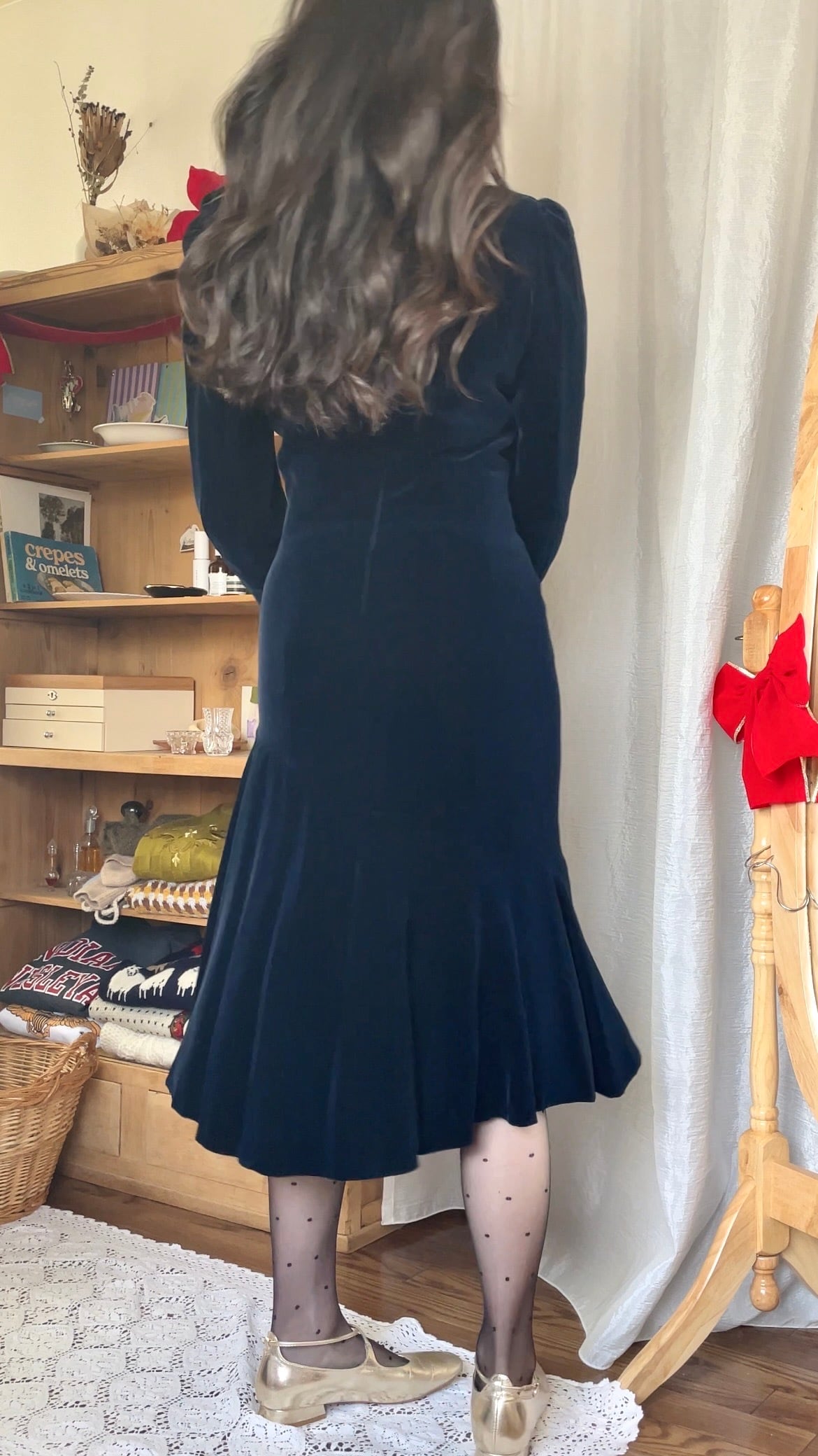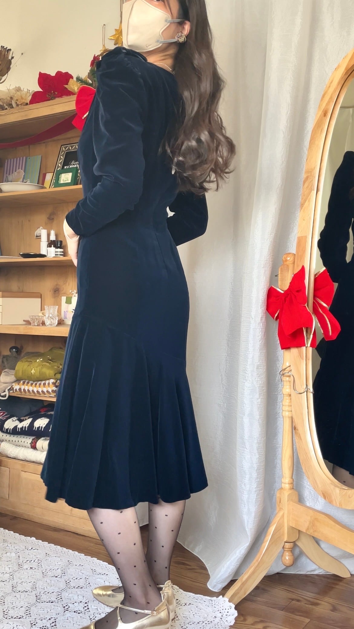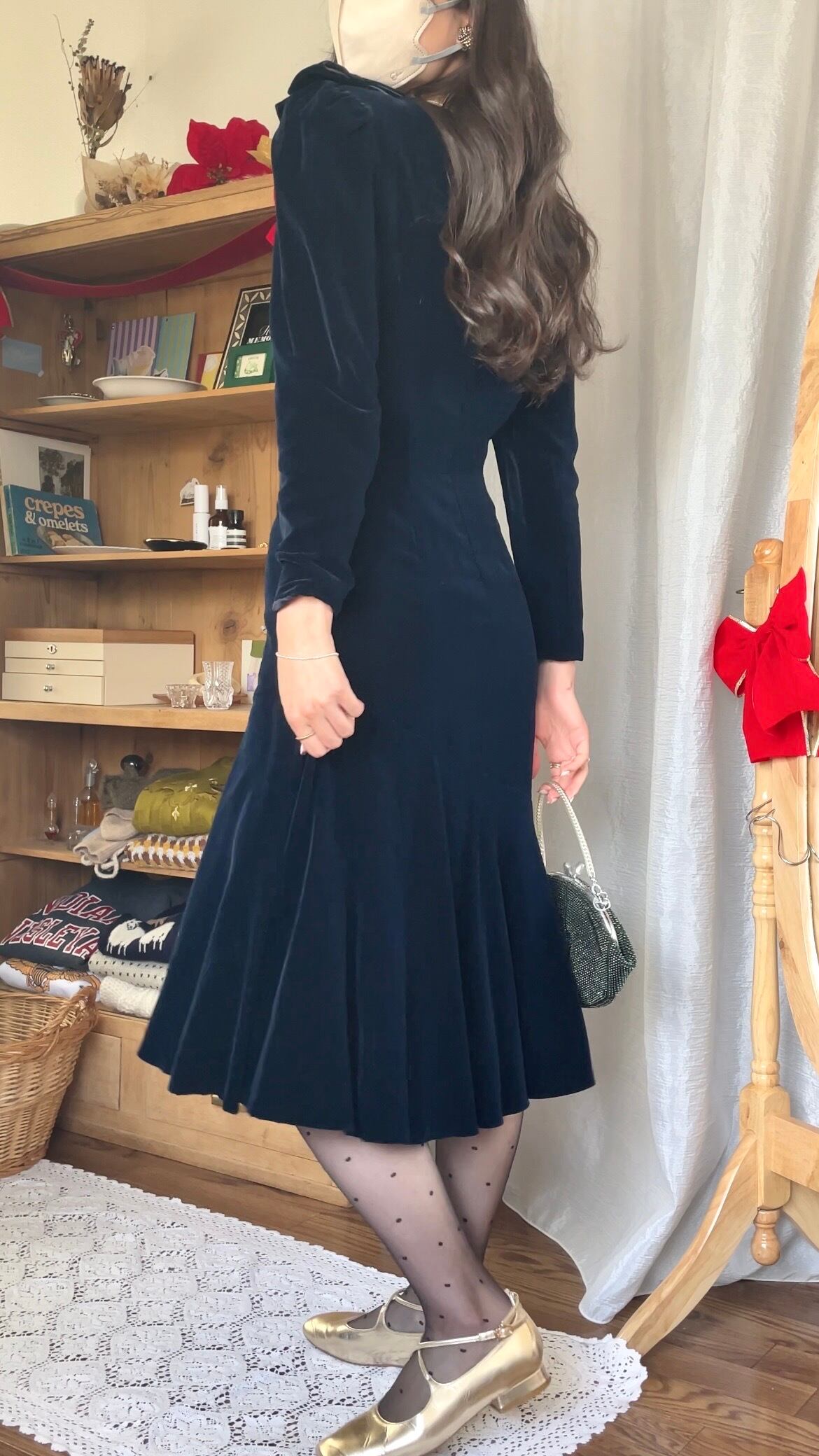 裾のフレアもアシンメトリーで、歩くたびに優雅にゆらゆらと揺れるシルエットがとてもきれいです。