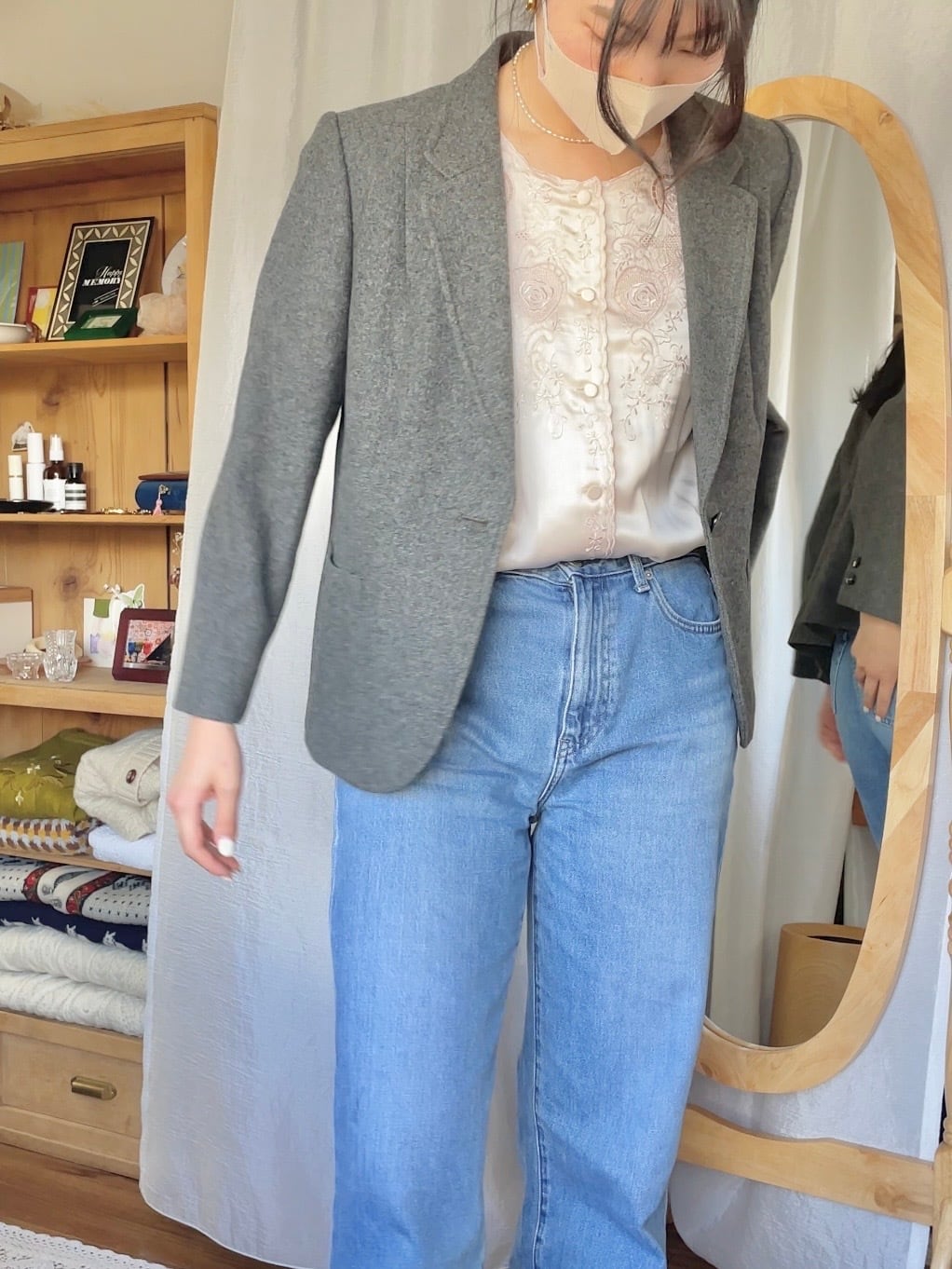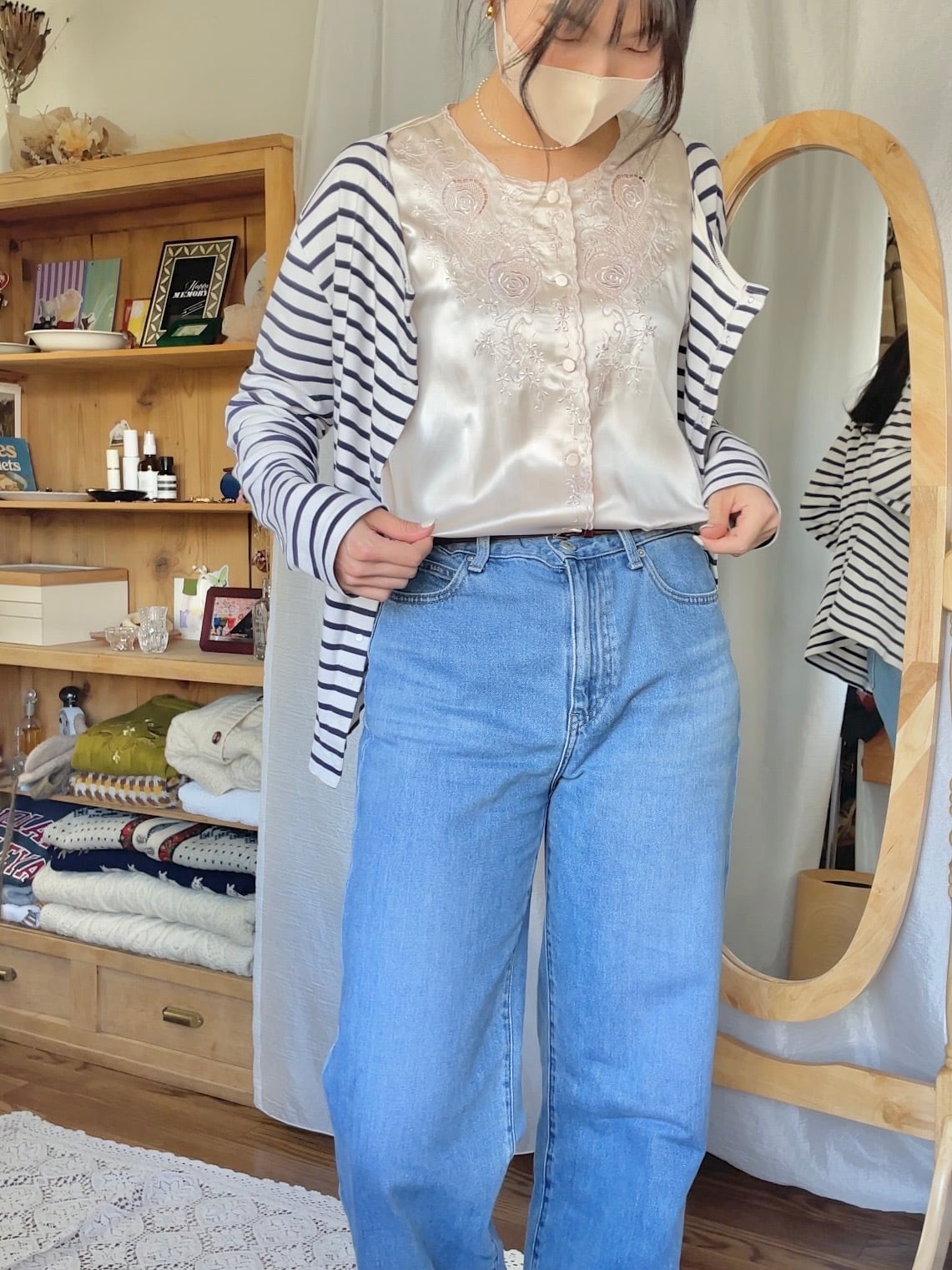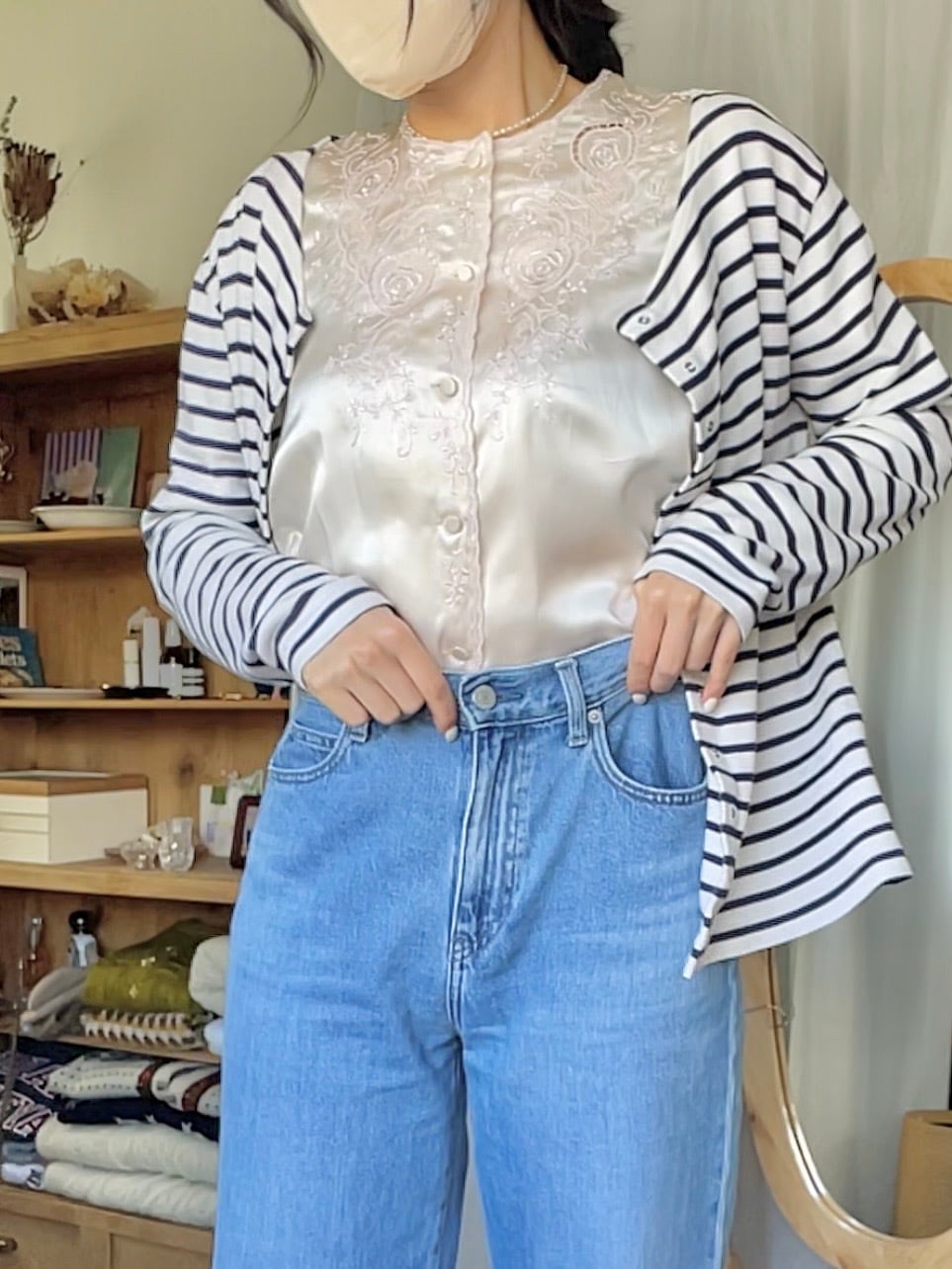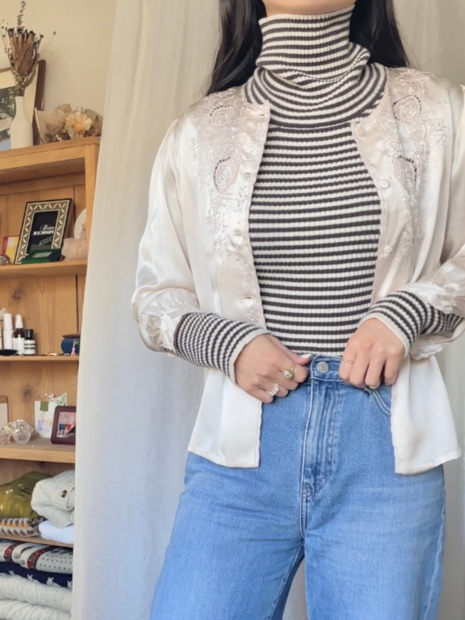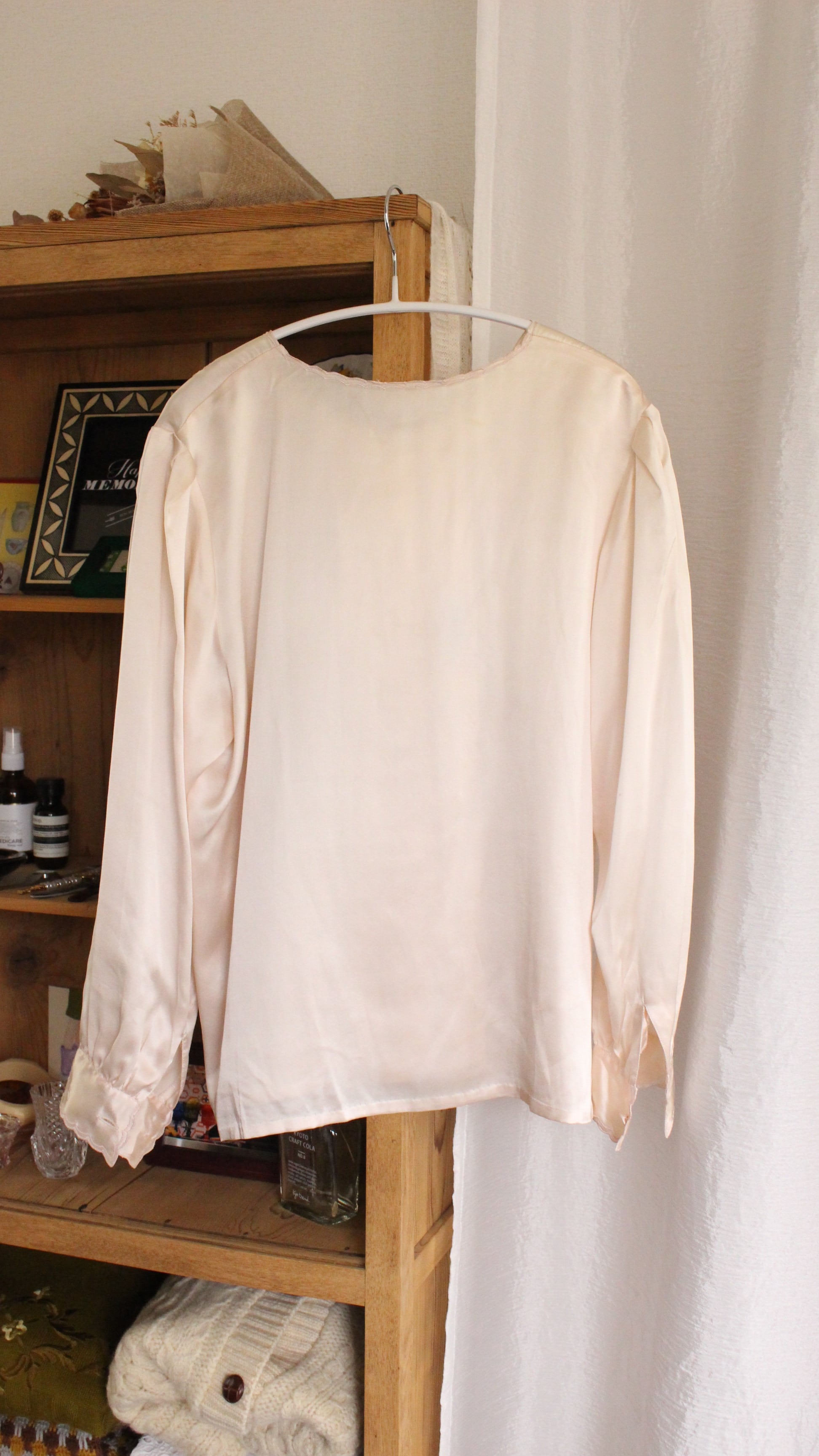 また、こういうレトロなシルクトップスには珍しく前開きになっているので、シンプルなロンTなどの上に羽織ったりするミックススタイルもかわいいかと思います。