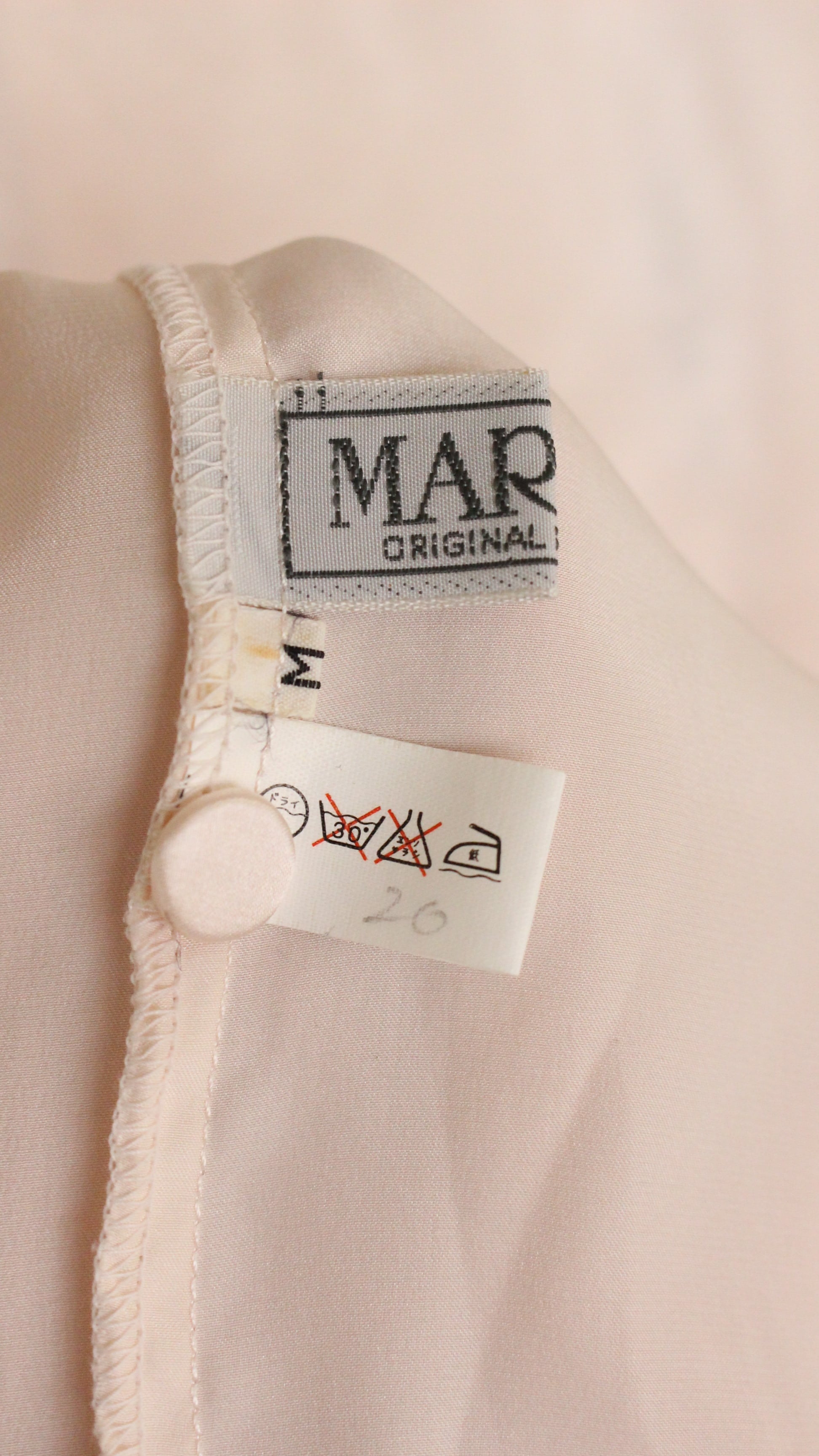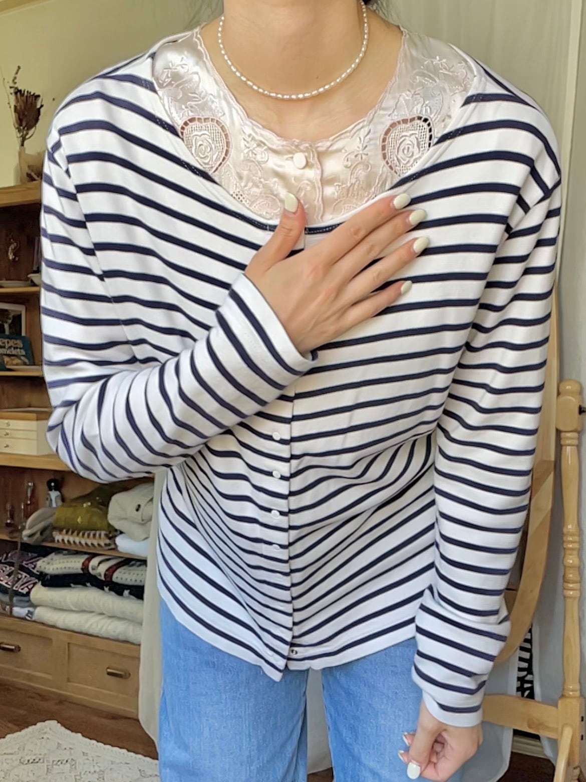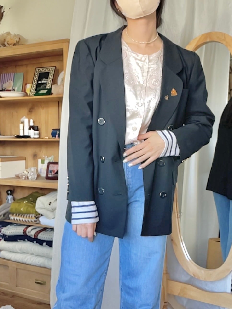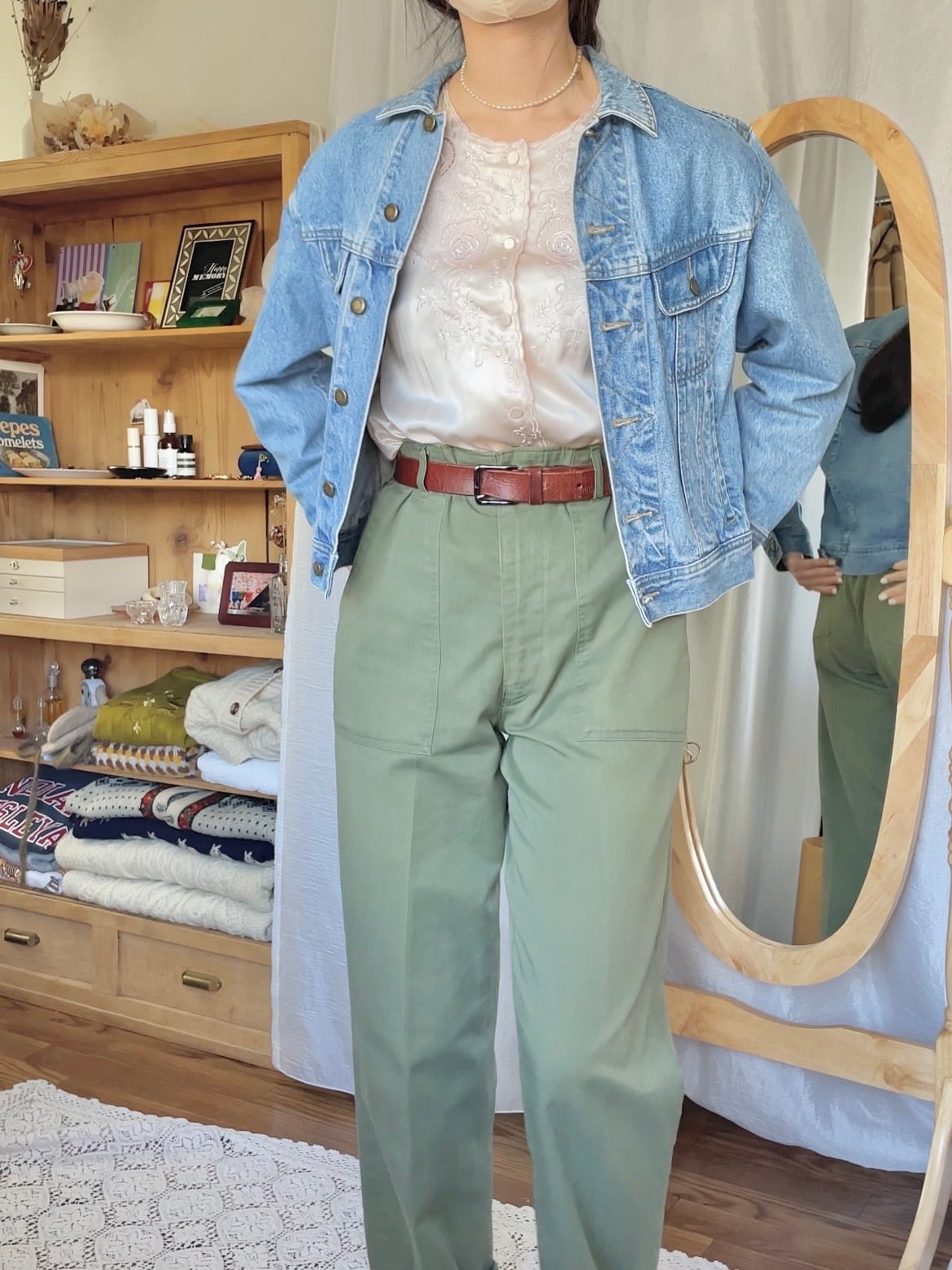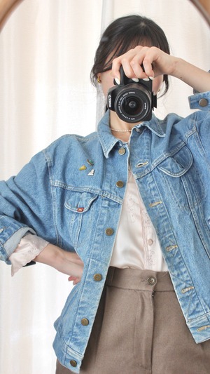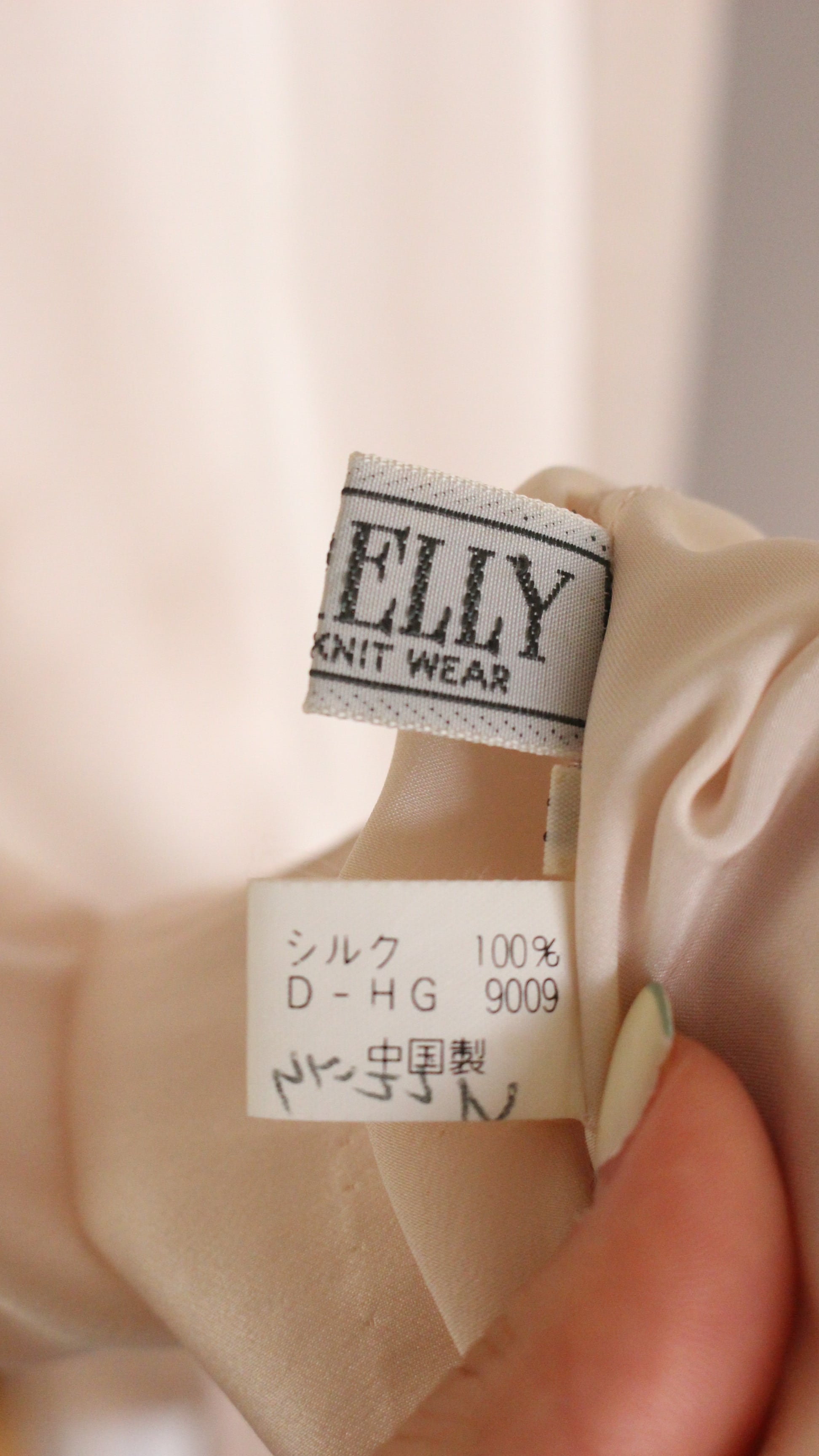 また、こういうレトロなシルクトップスには珍しく前開きになっているので、シンプルなロンTなどの上に羽織ったりするミックススタイルもかわいいかと思います。