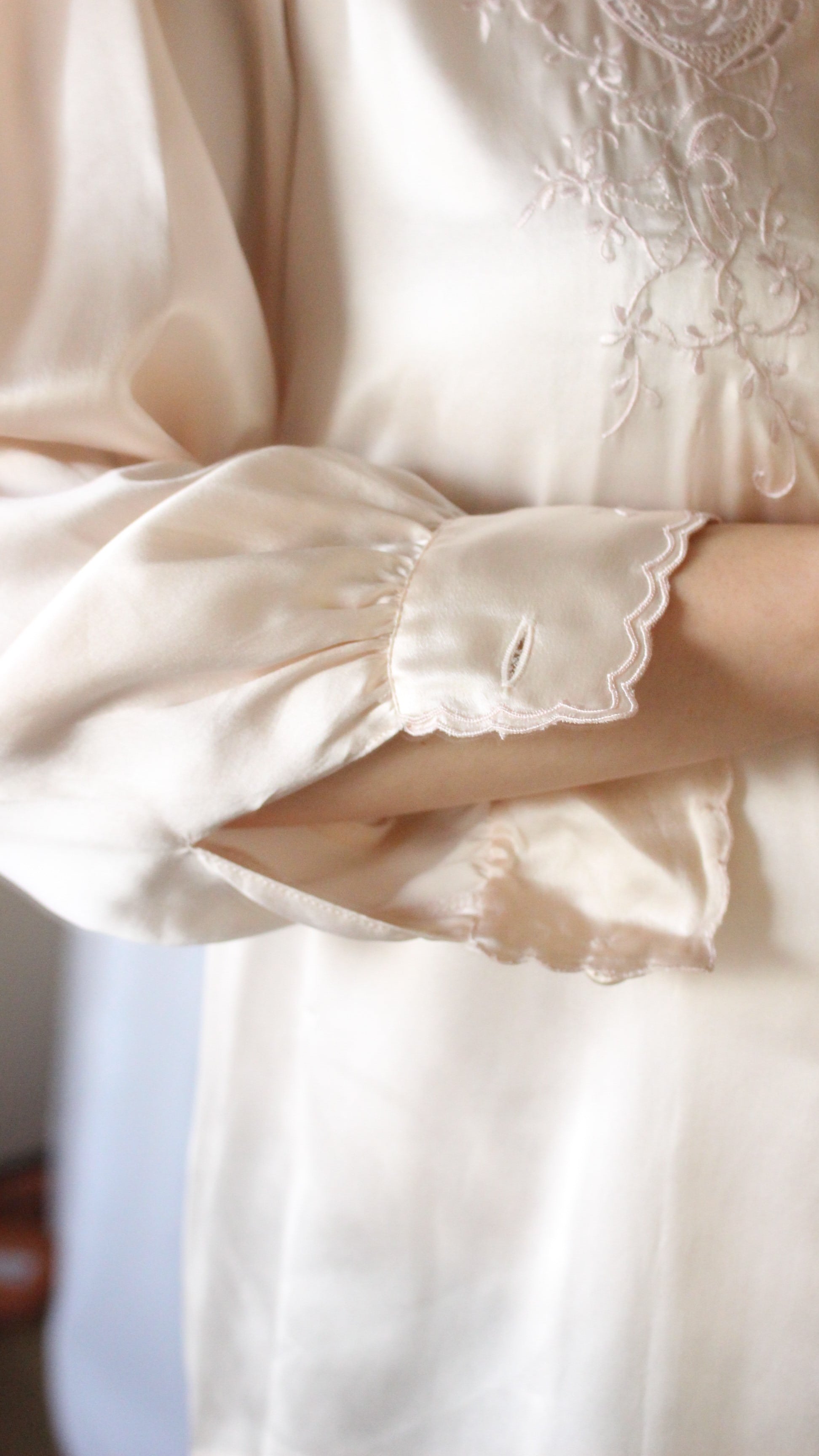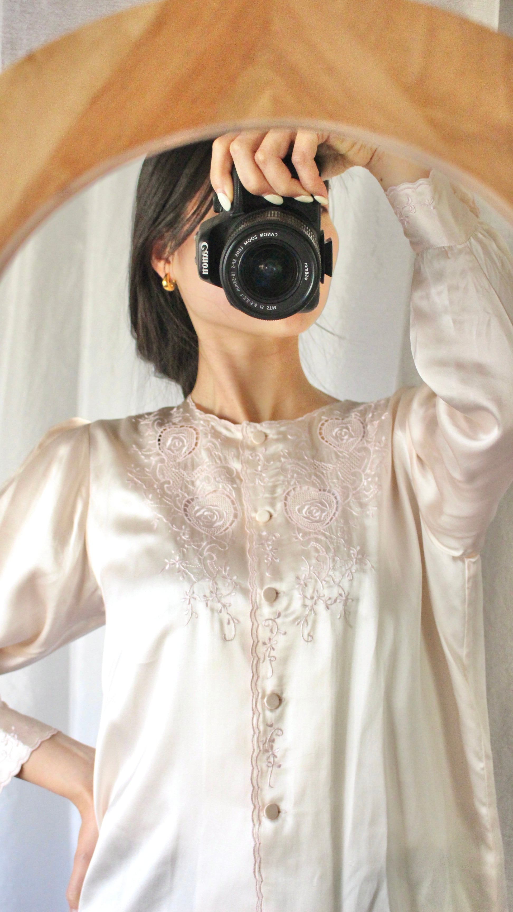 襟ぐりから胸元にかけての刺繍の模様がとても繊細で美しいシルクトップス。
