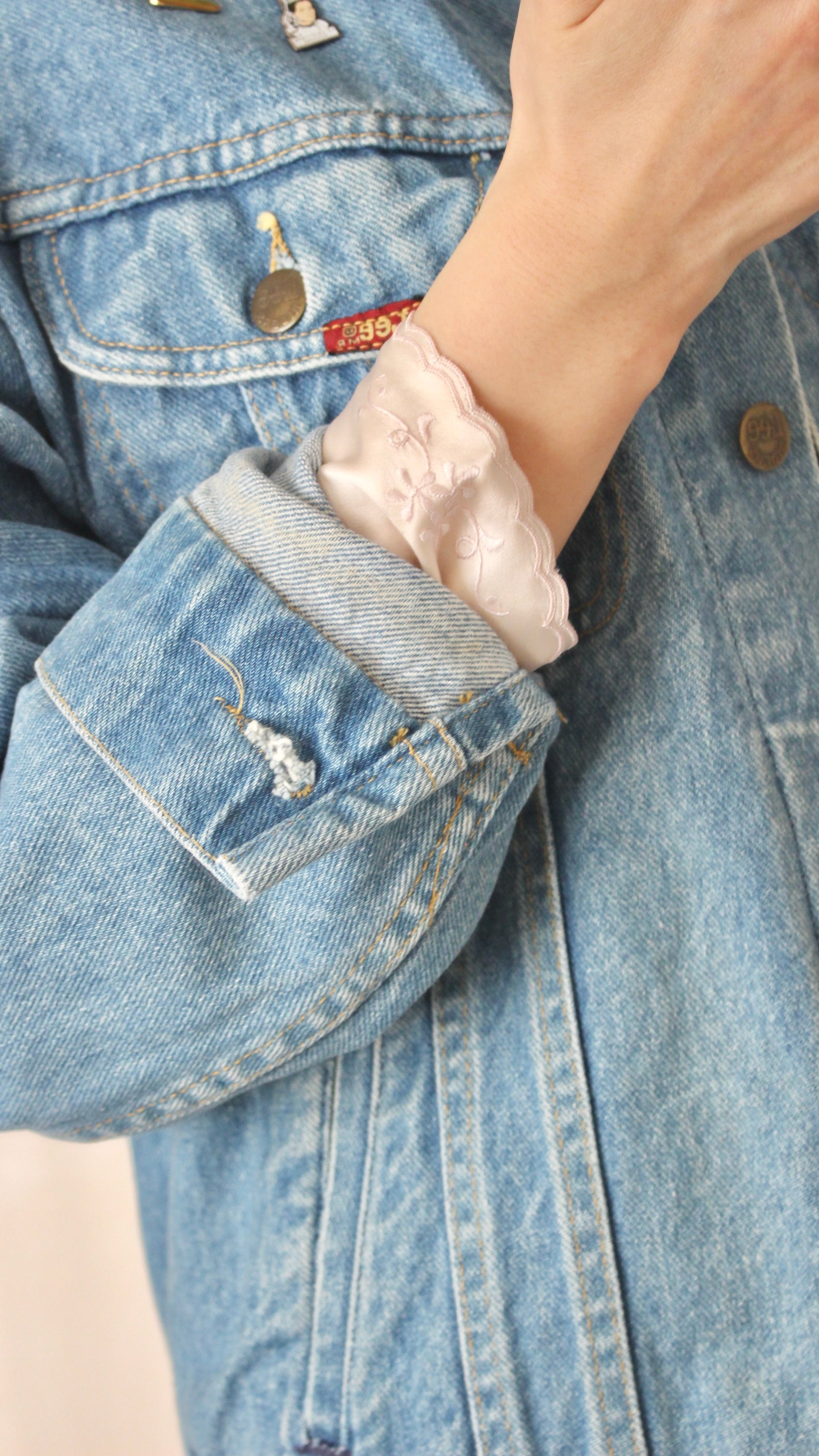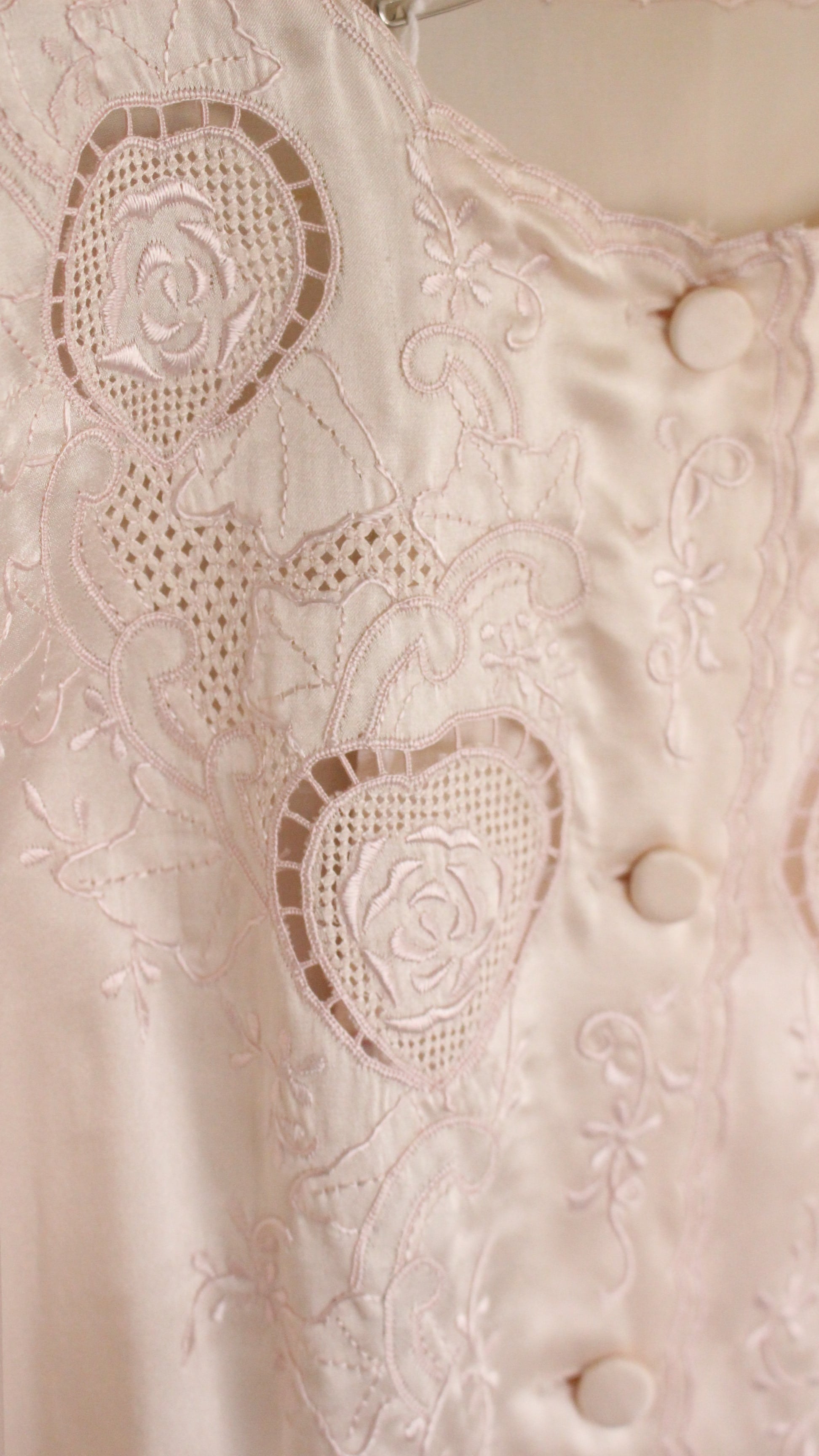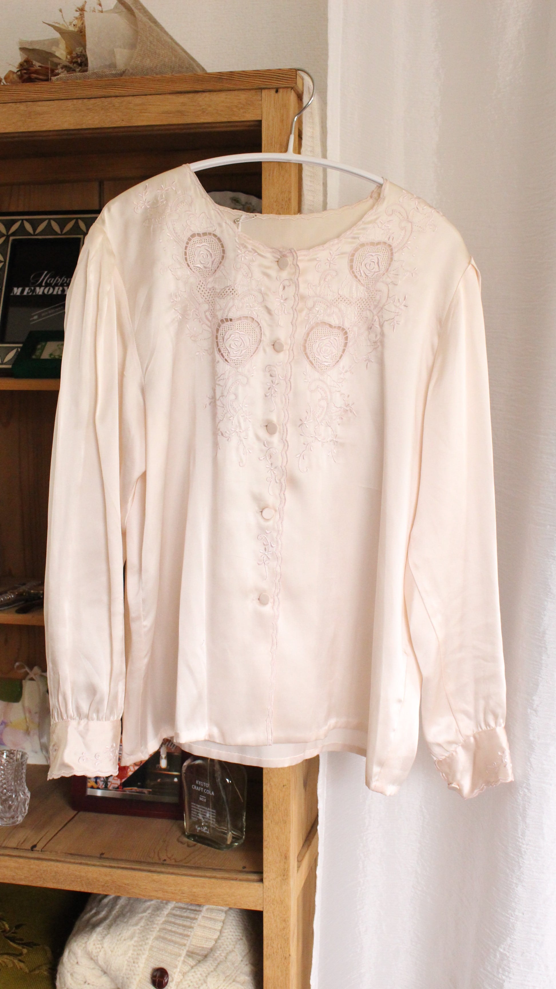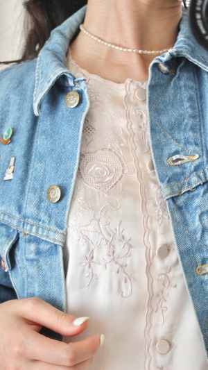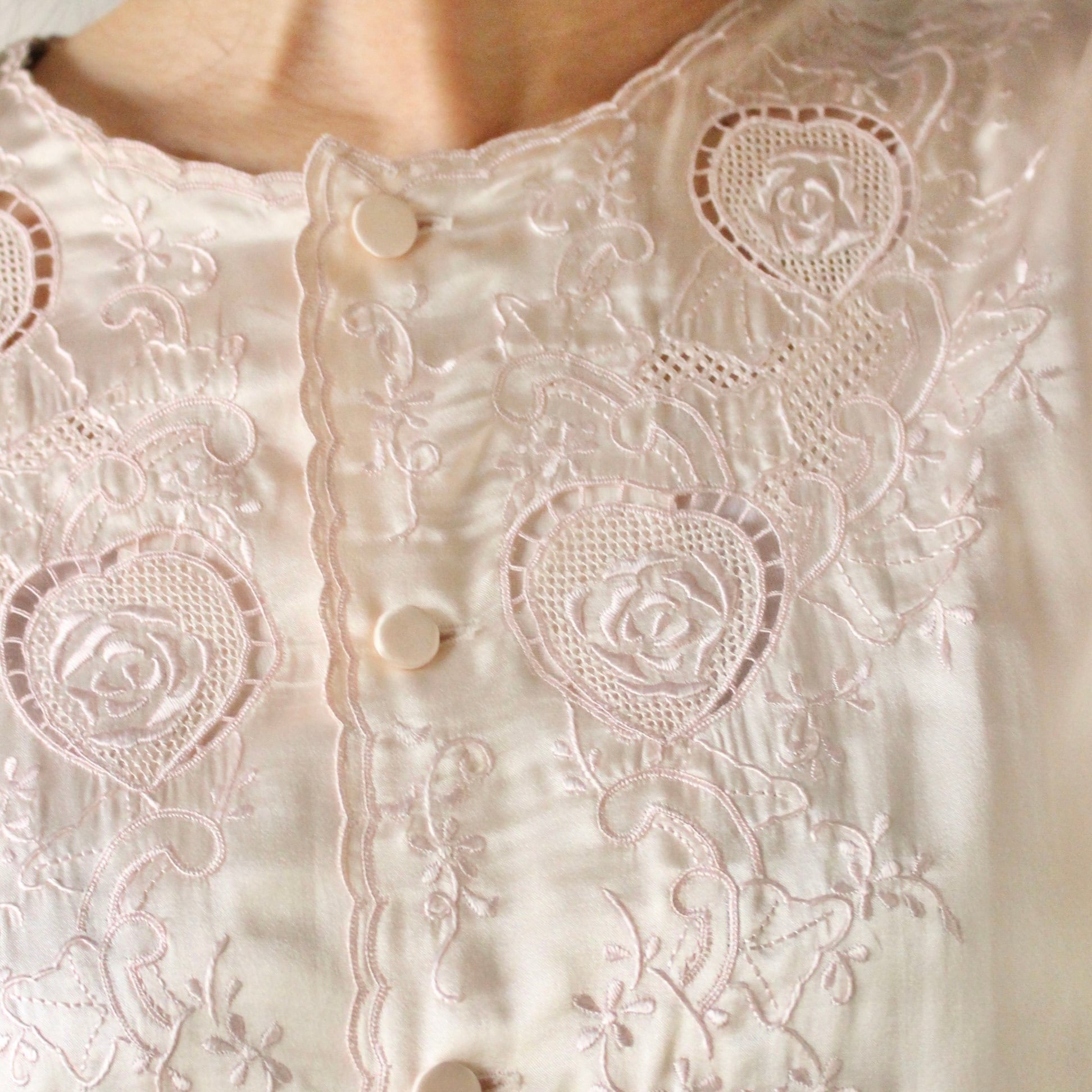 袖口にも刺繍のデザインが施されていて、ボタンはくるみボタン、胸元の模様には透かしデザイン。可愛らしさと上品さそしてどこか儚げ感じもある雰囲気のある1点です。