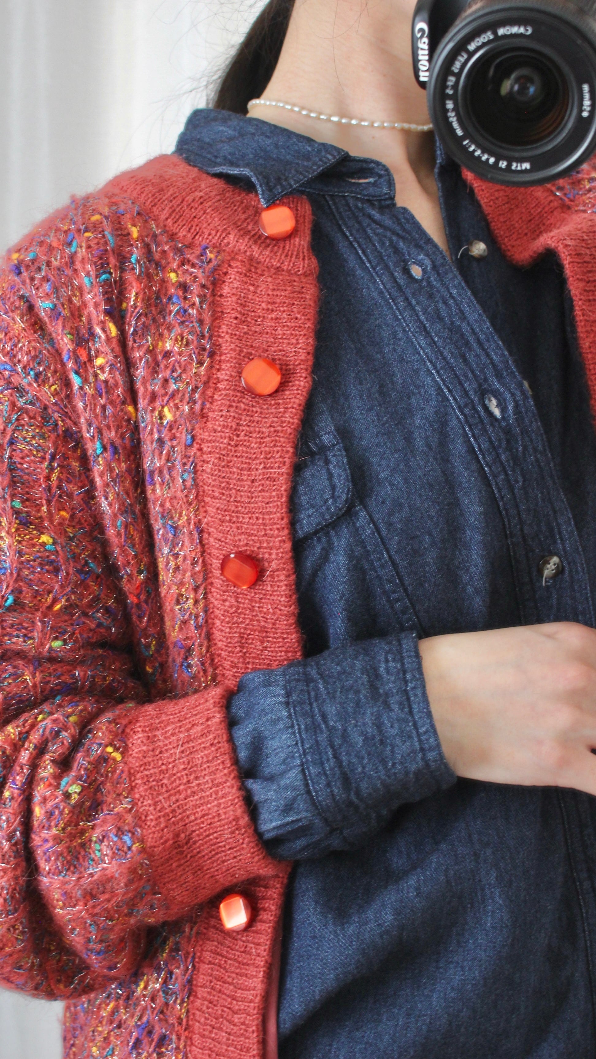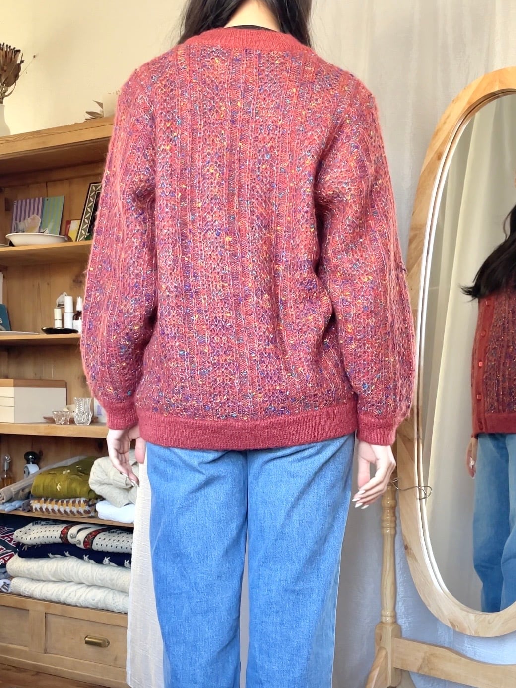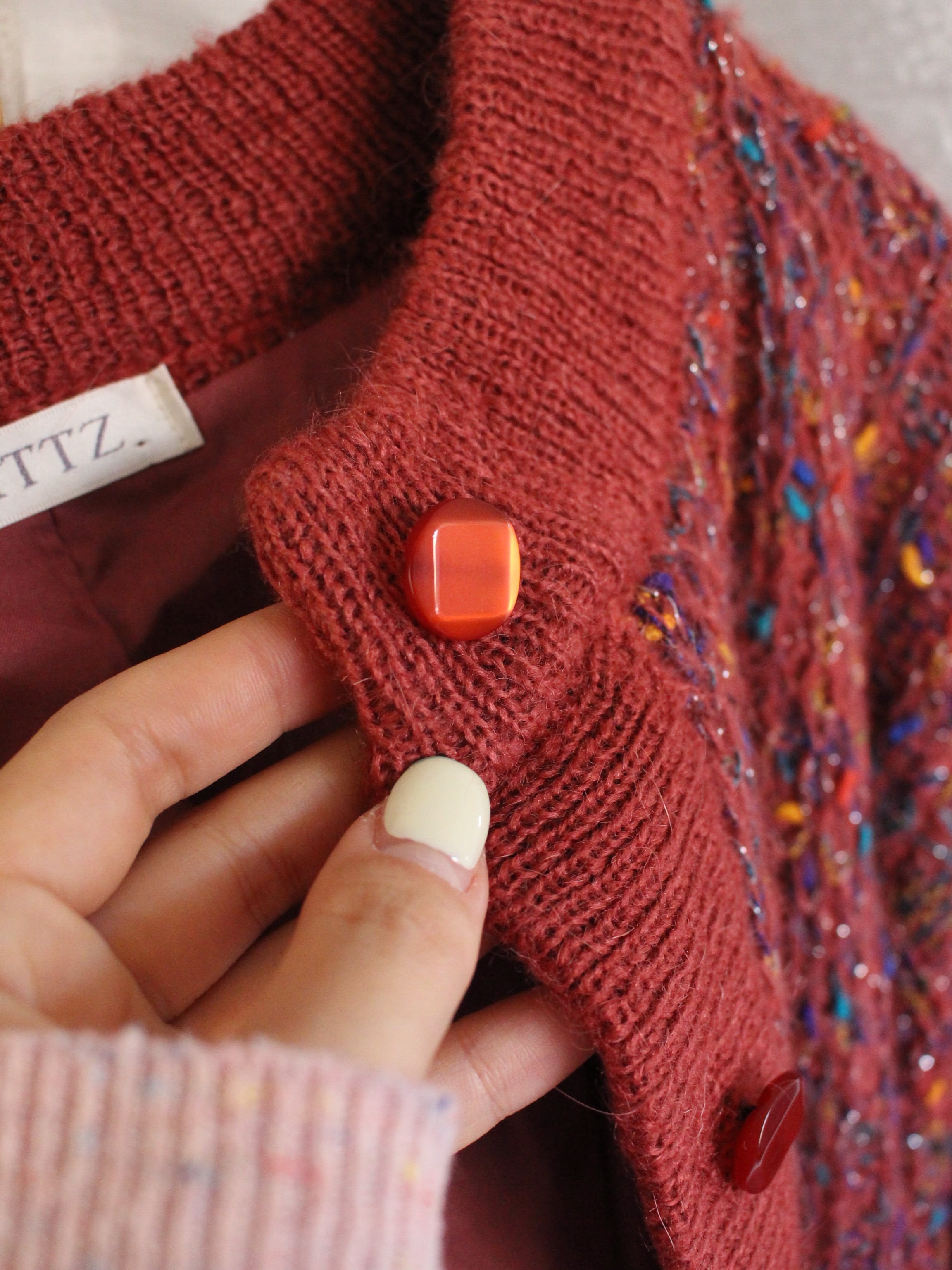 イエロー、オレンジ、ピンクグリーンなどの多色がミックスされたニットカーディガン。