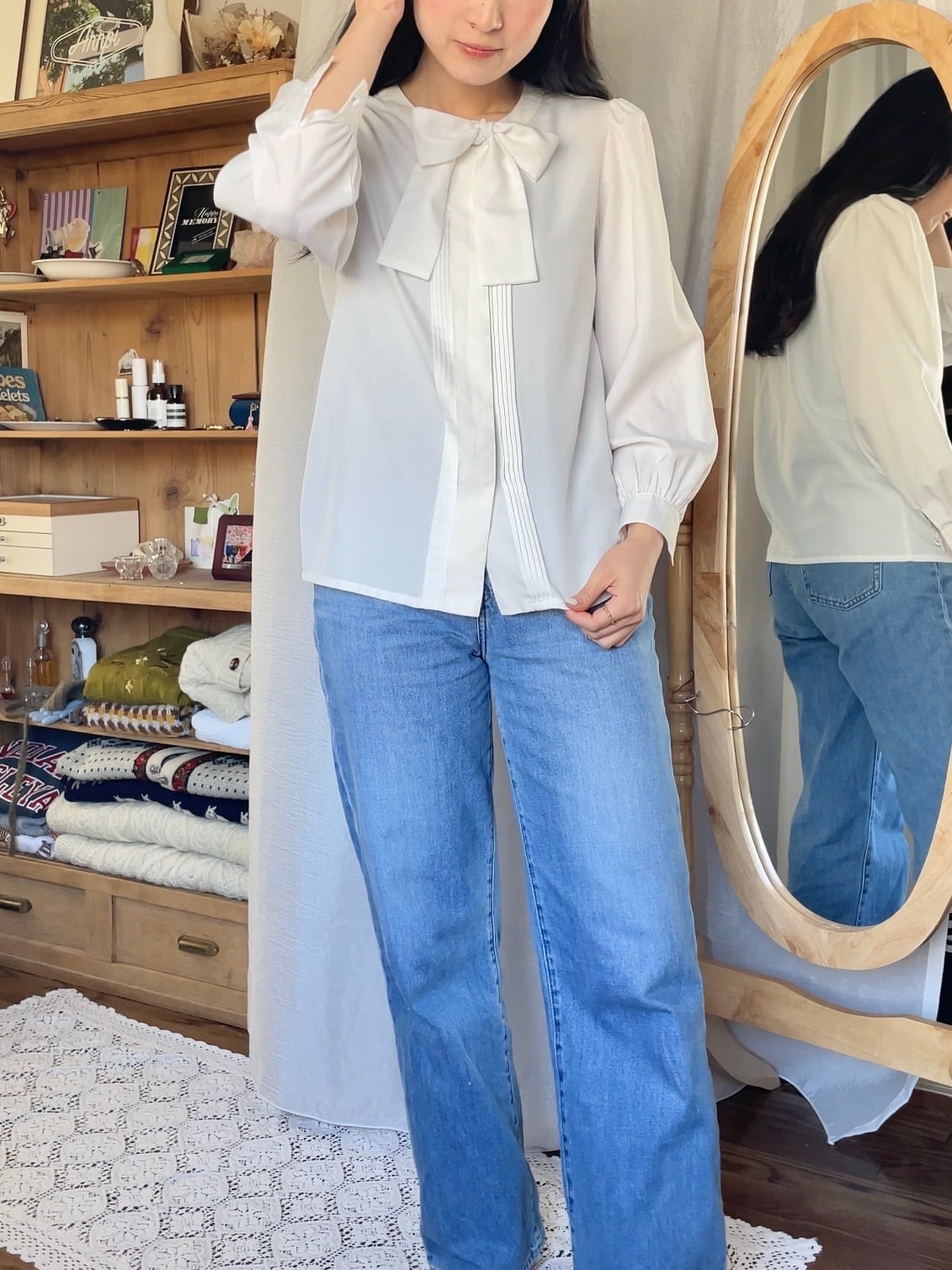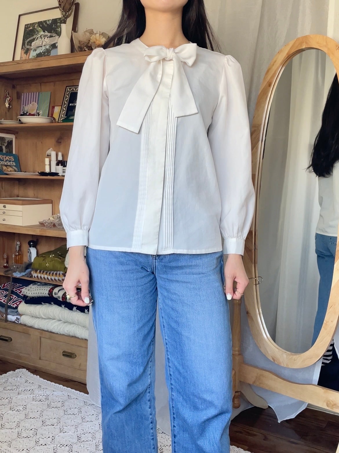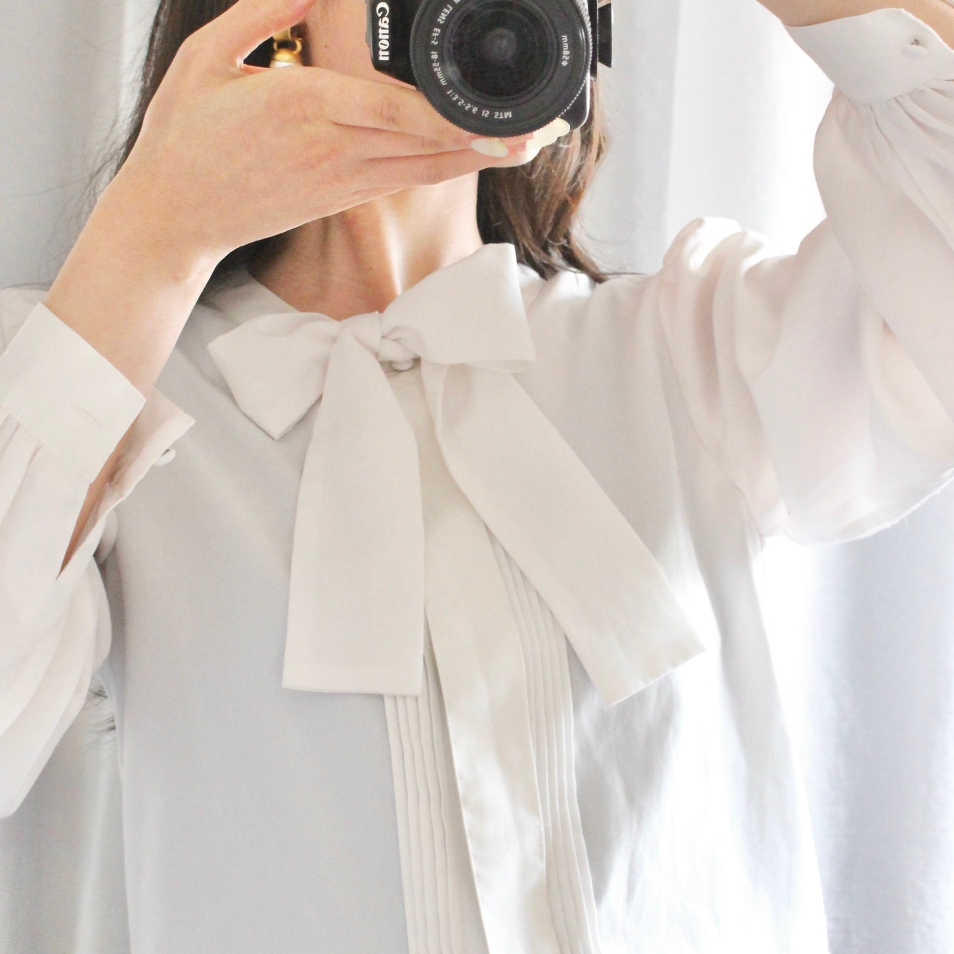 太めのリボンとふわっとした袖、ボタンサイドについている細かいプリーツ、すべてが気品ある雰囲気を出している春にぴったりのエレガントなブラウスです。