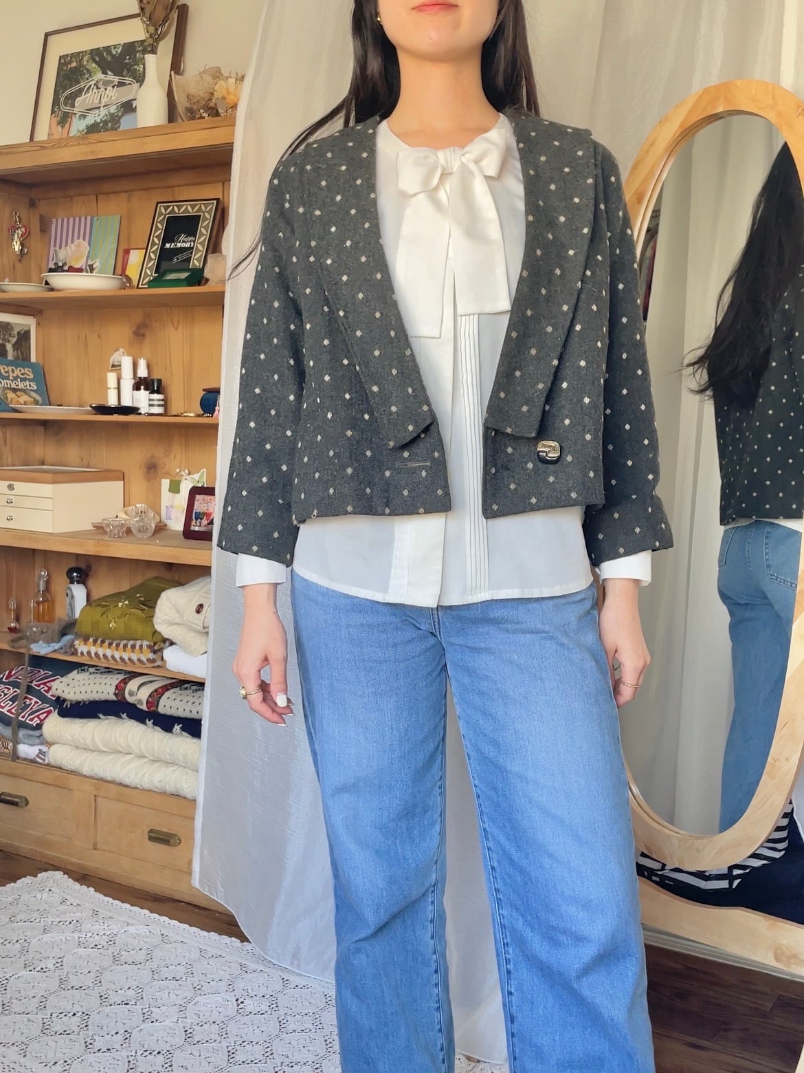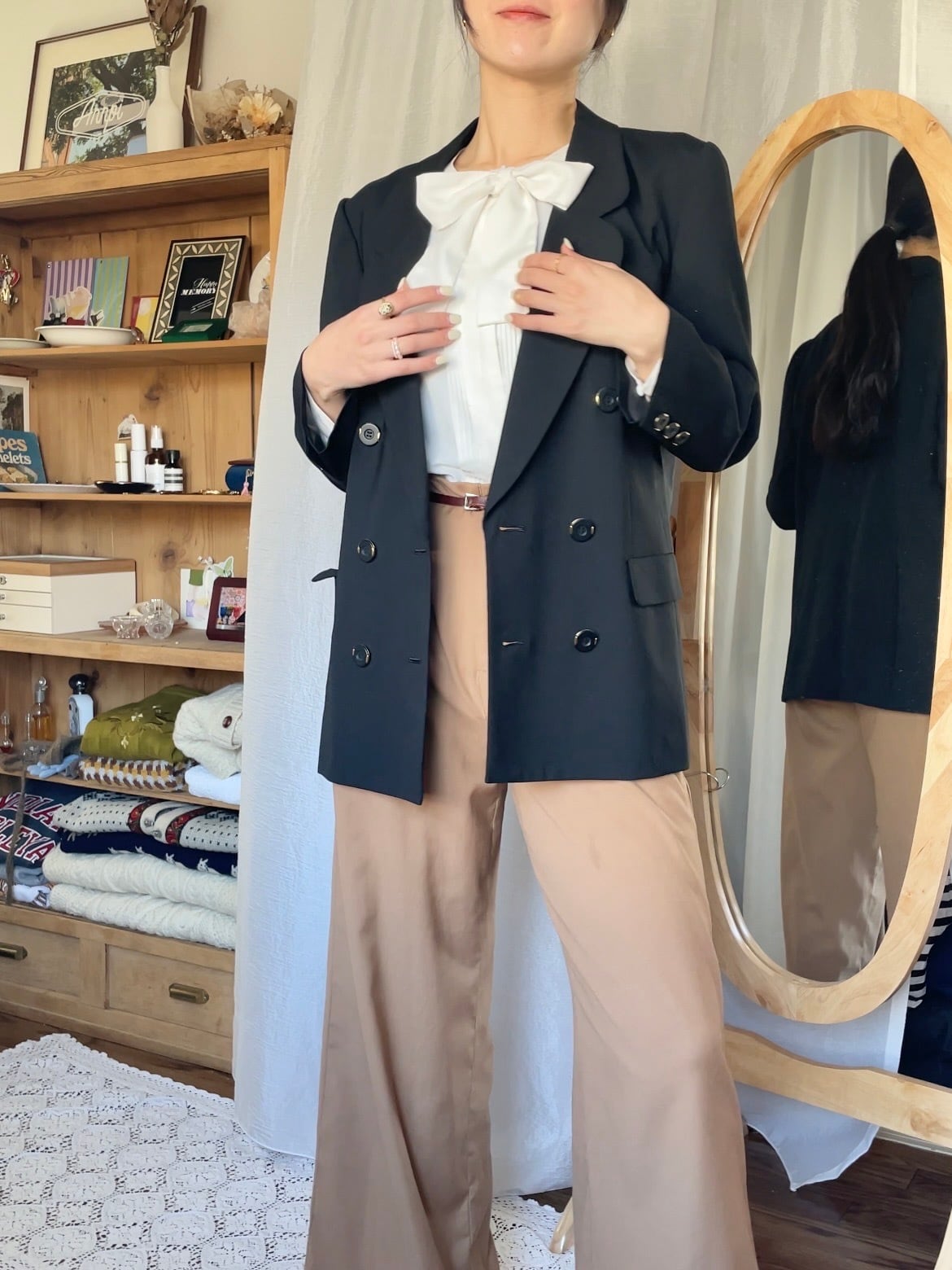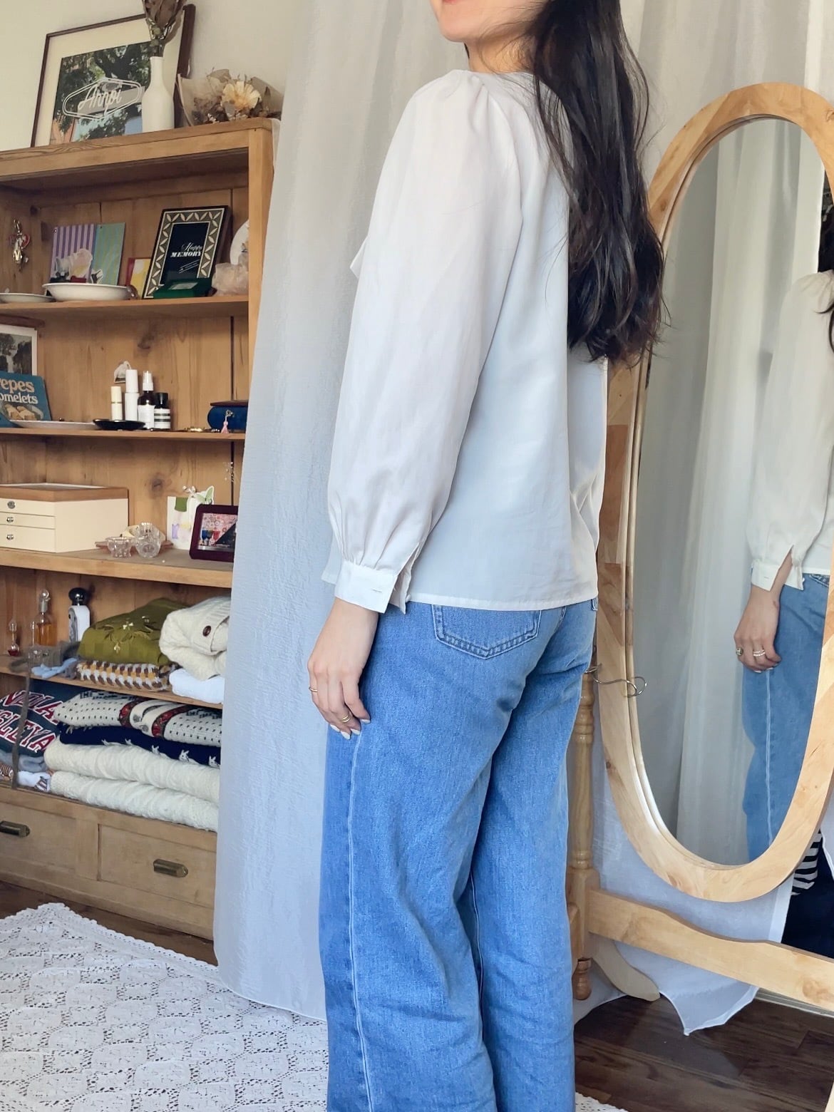 太めのリボンとふわっとした袖、ボタンサイドについている細かいプリーツ、すべてが気品ある雰囲気を出している春にぴったりのエレガントなブラウスです。