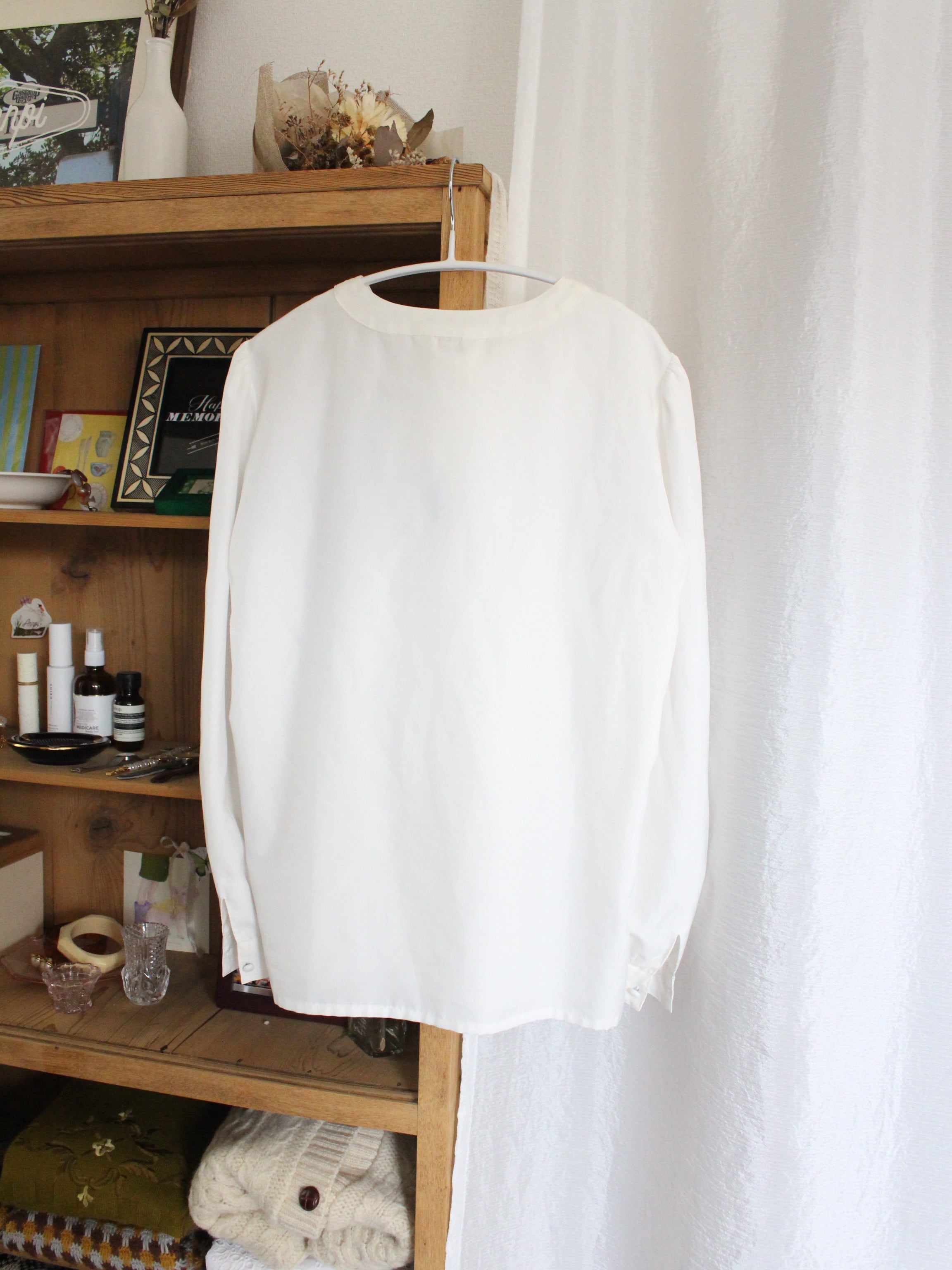 着用画像のようにVネックのニットやトレーナー、カーディガンなどの下に着たり、少し暖かくなってきたらベストと重ねてみたり、夏目前には1枚でさらっとデニムに合わせてシンプルにスタイリングしてみるのもお勧めです。