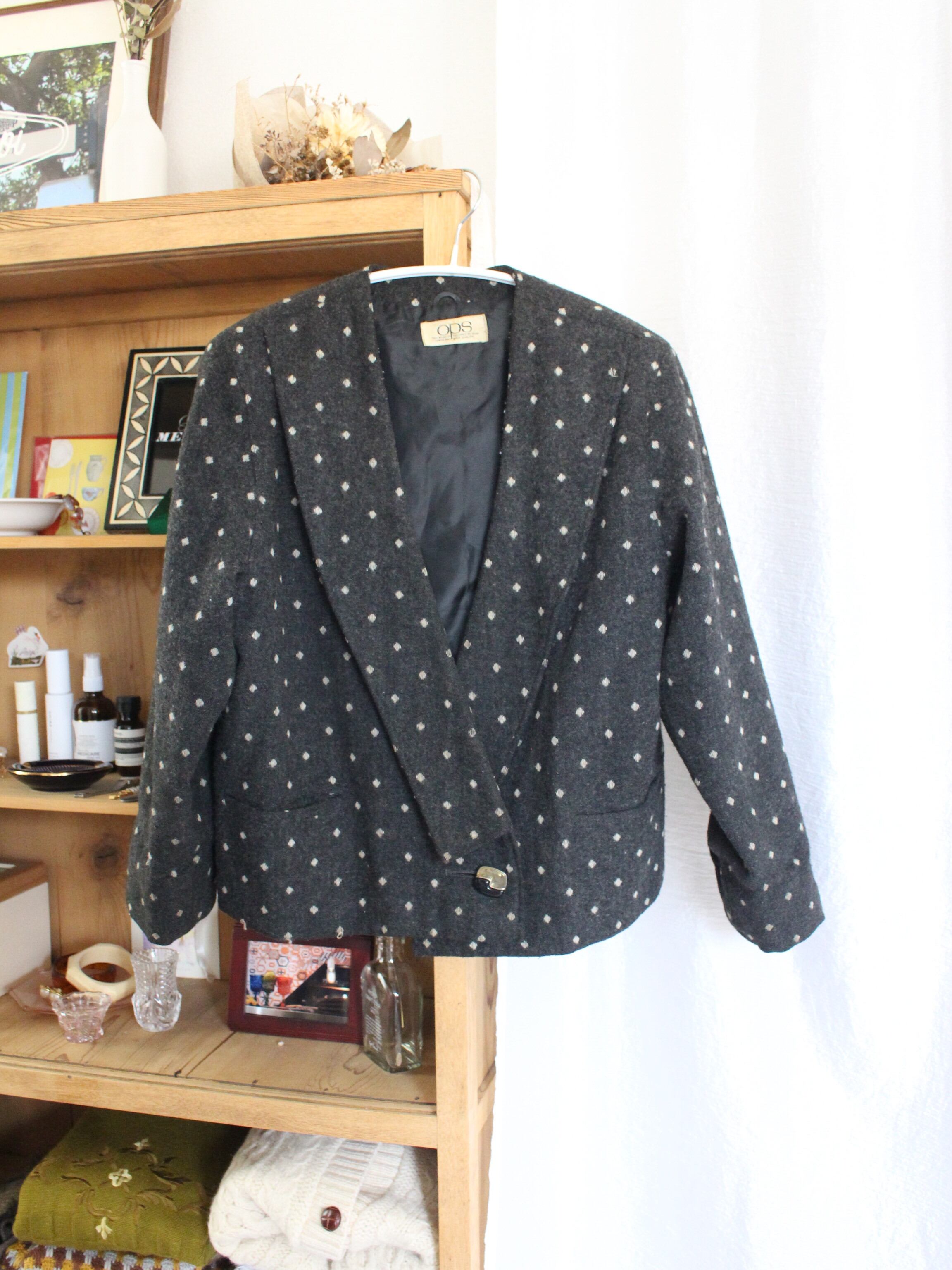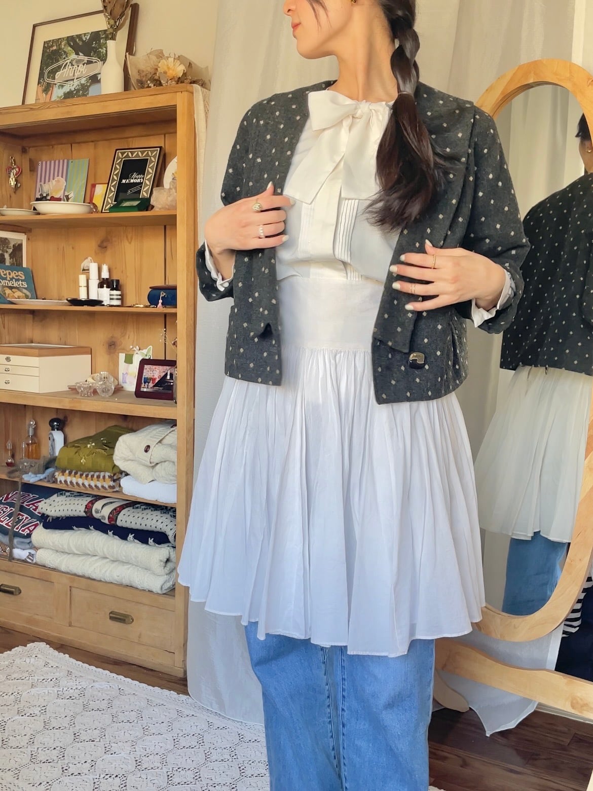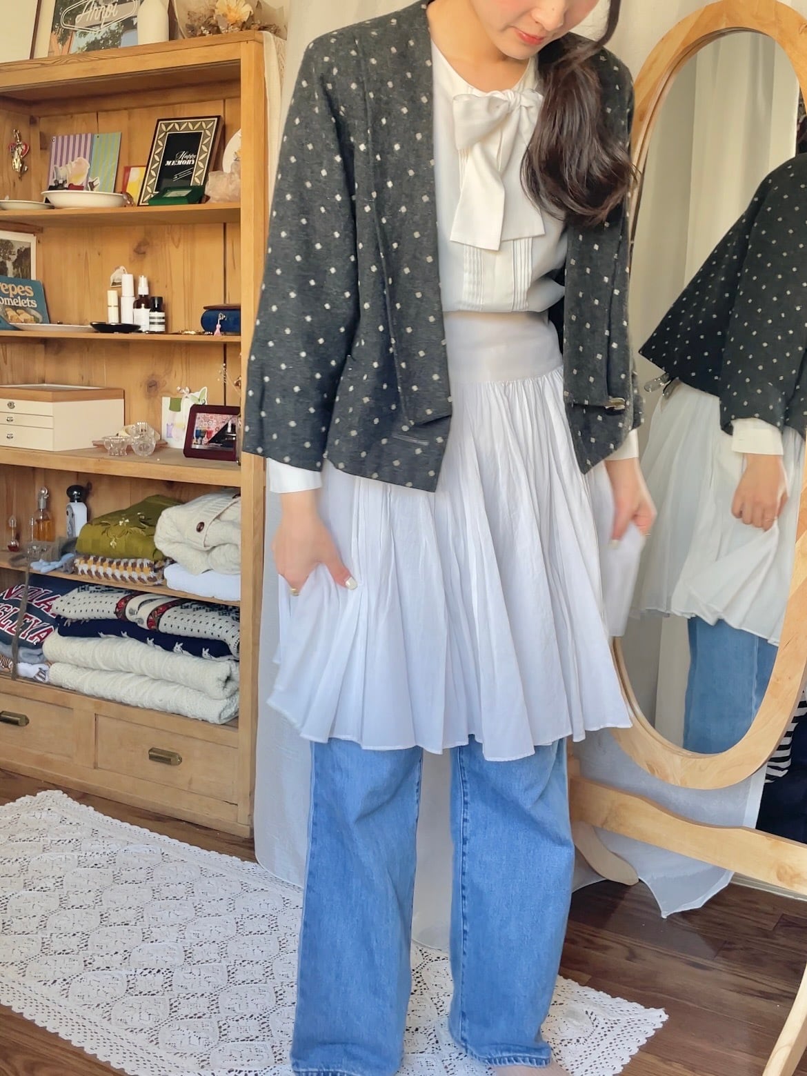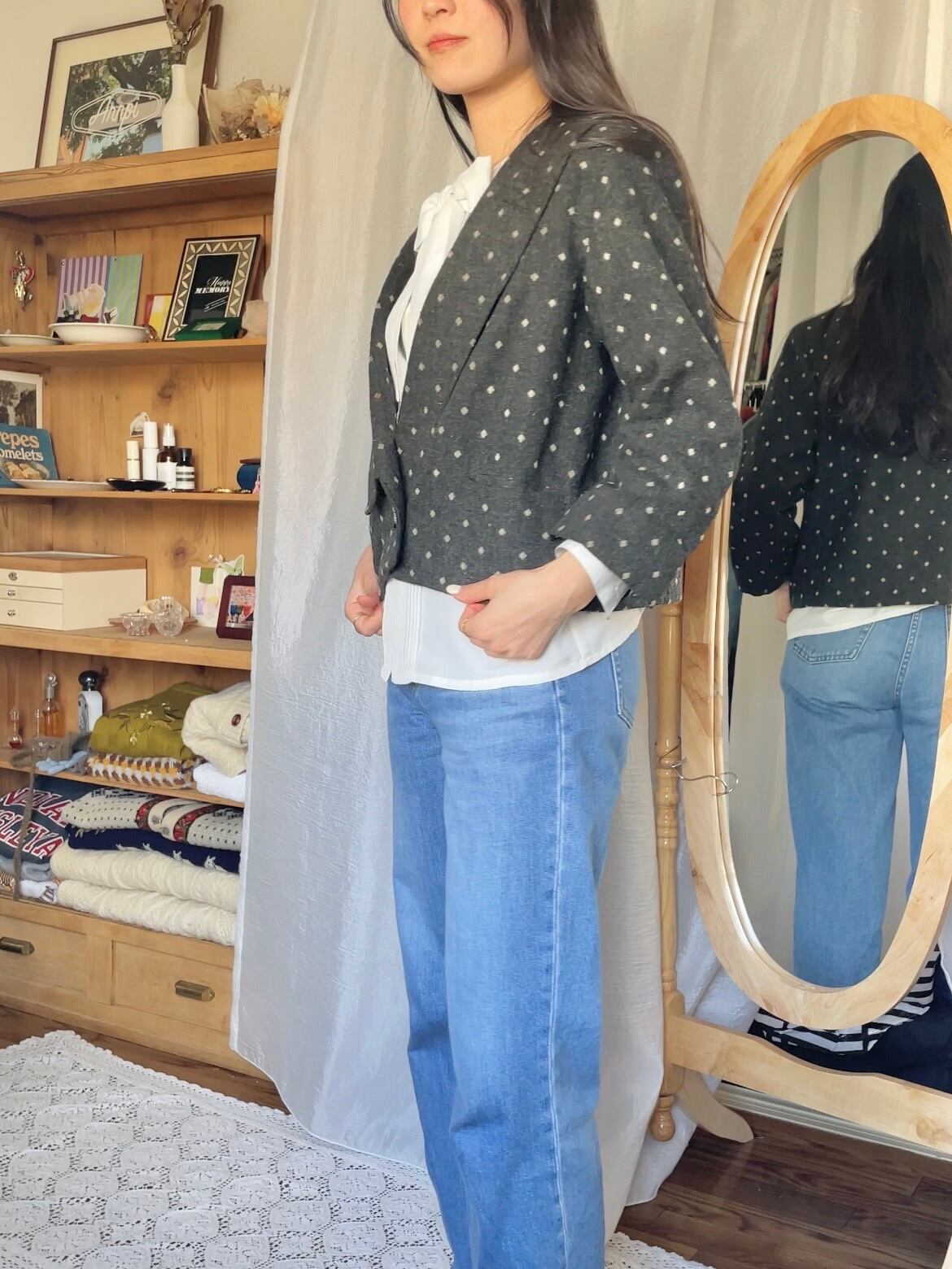 柄のジャケットと言うと派手で合わせる服を選びそうなイメージですが、細かいドット柄で主張が激しくなく柄物やロゴトレーナーなどにも馴染む1点。