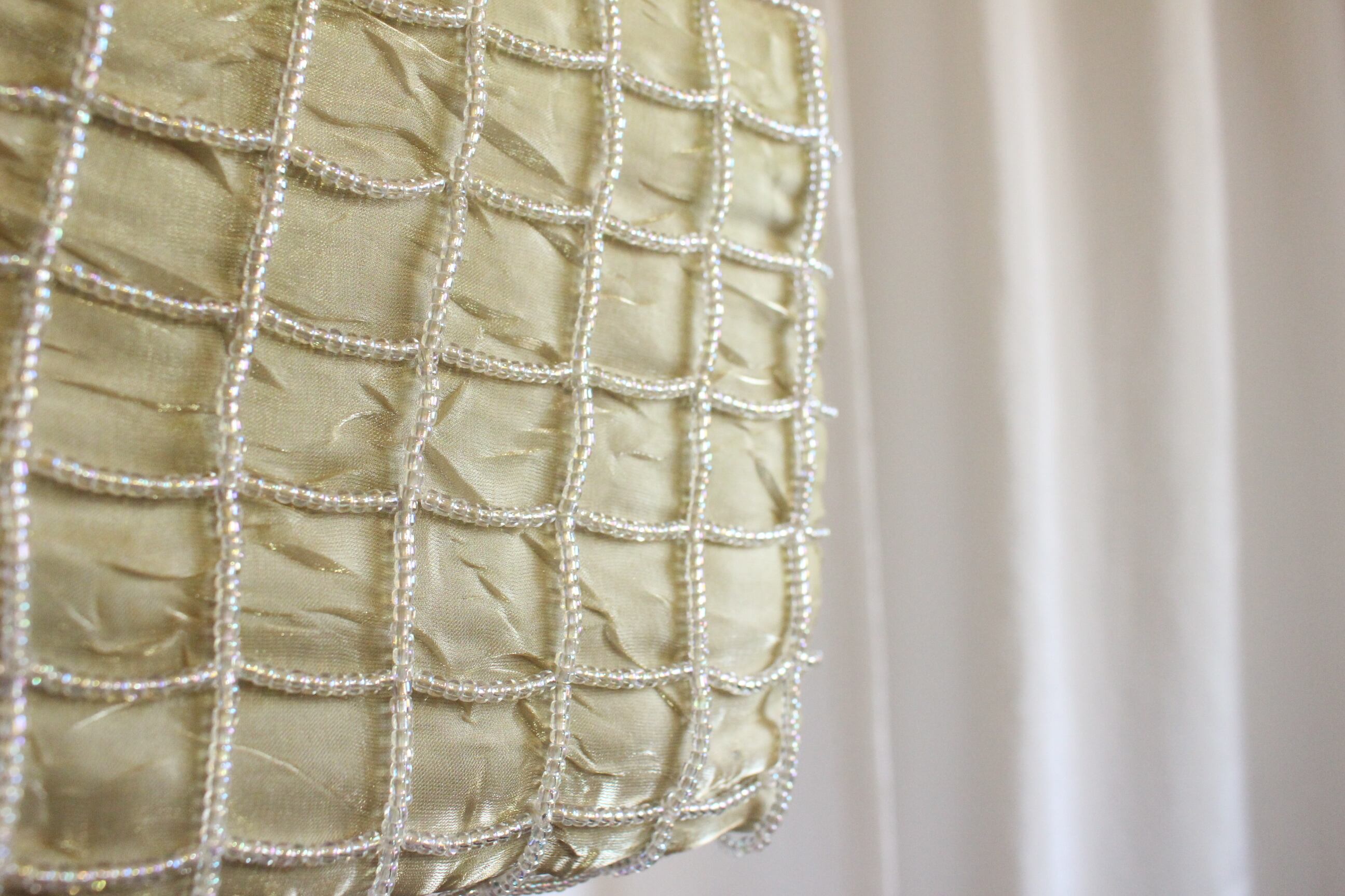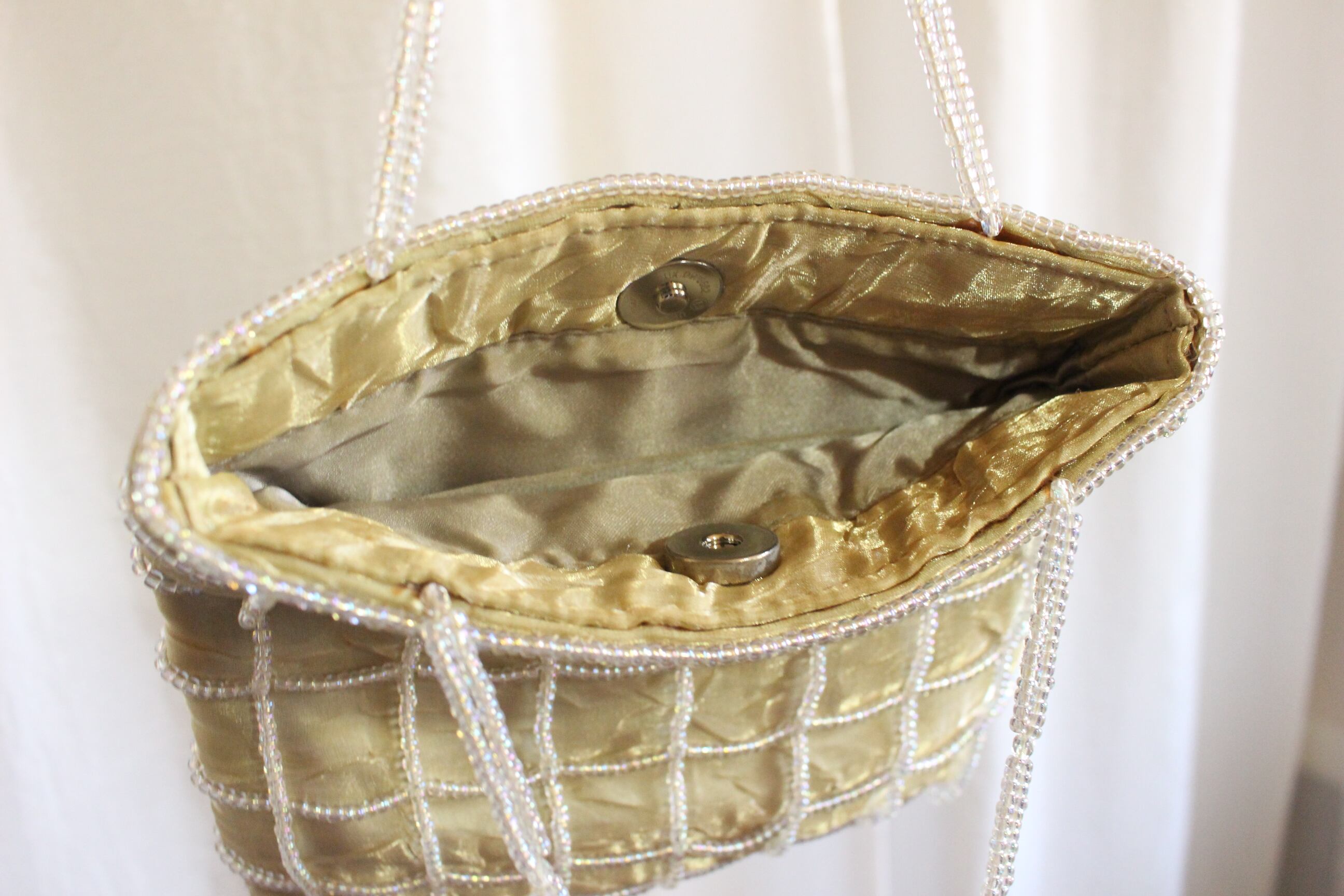 クリアなビーズがあしらわれたバッグ。
