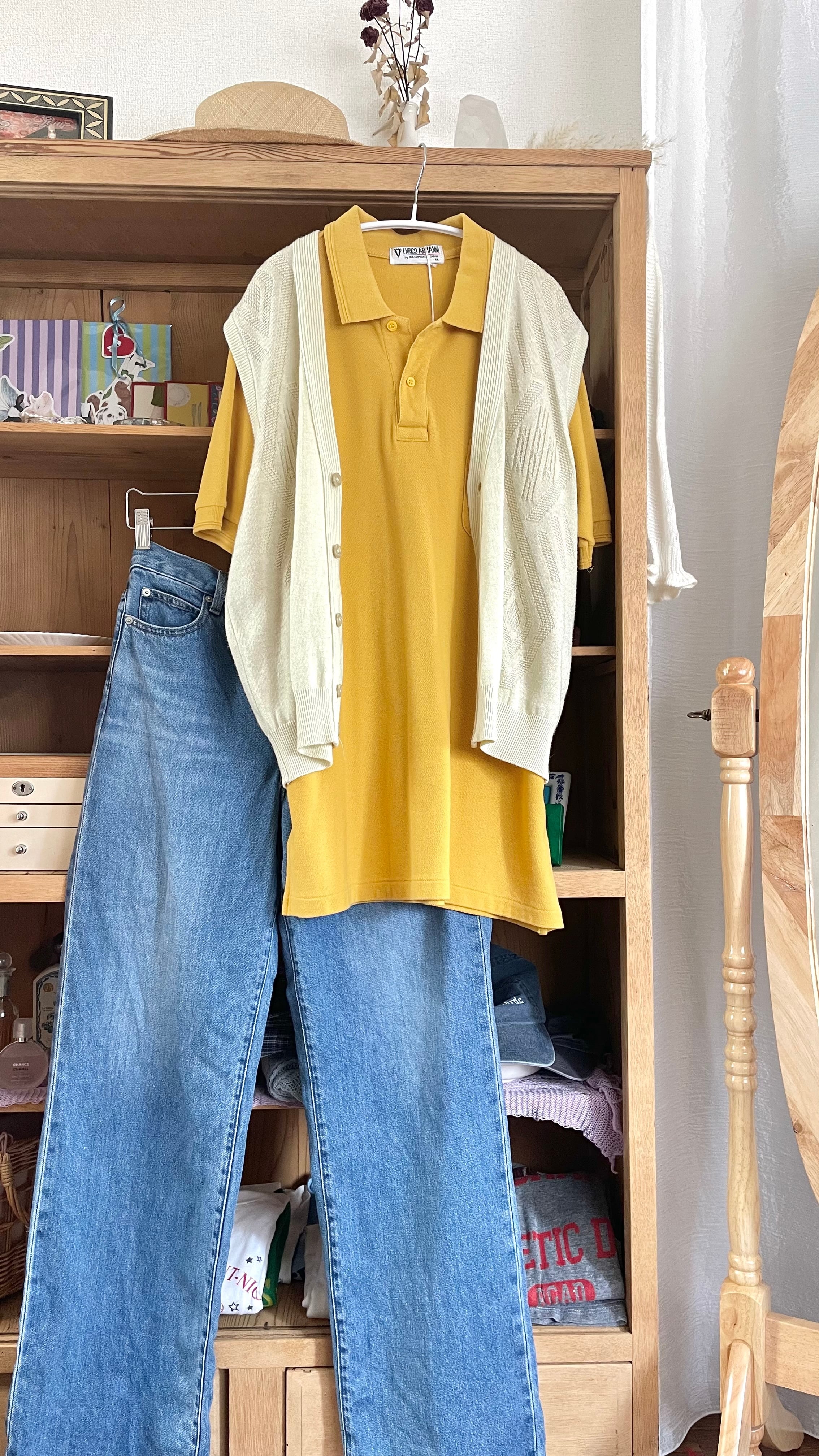 胸ポケットのネイビーのロゴとマスタードイエローがとってもマッチしていて、夏〜秋口まで着られそうな色味です。