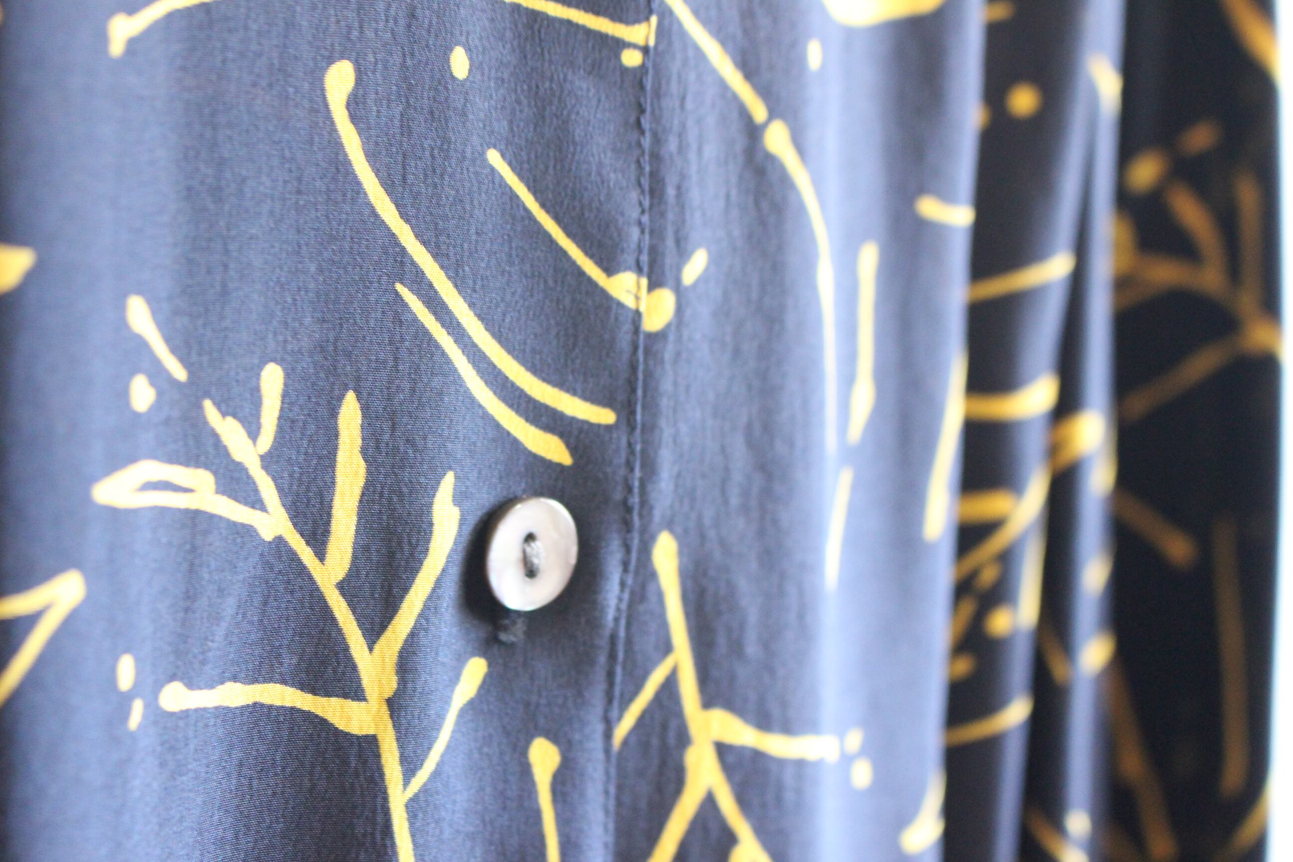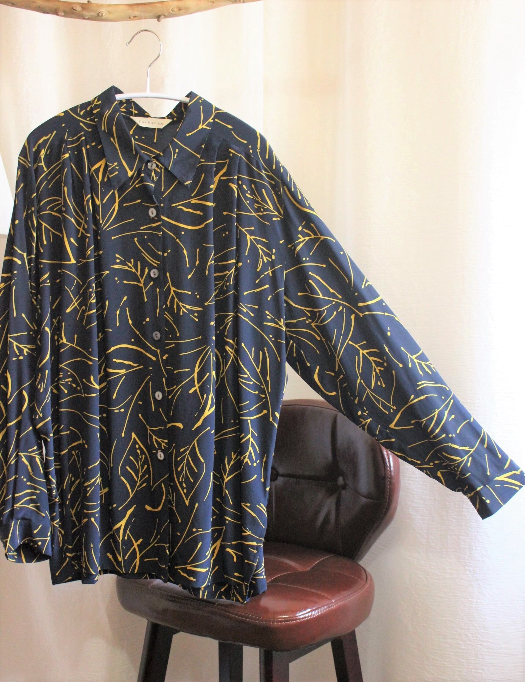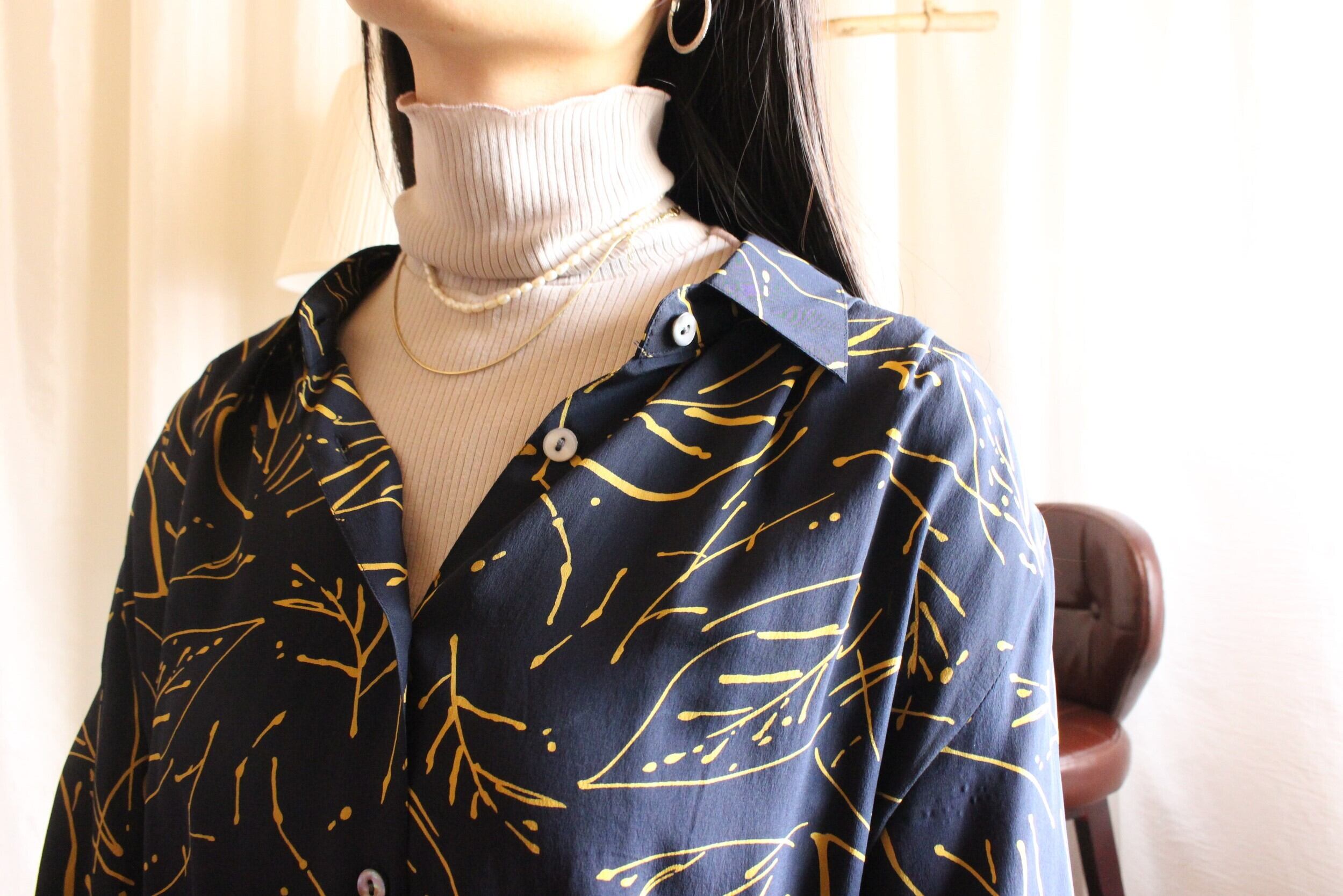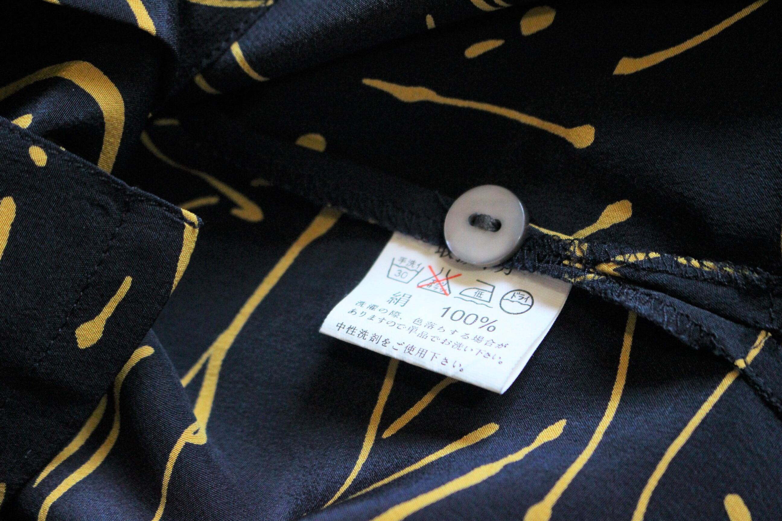 黒地に黄色コントラストが特徴的なシルク100%のシャツ。