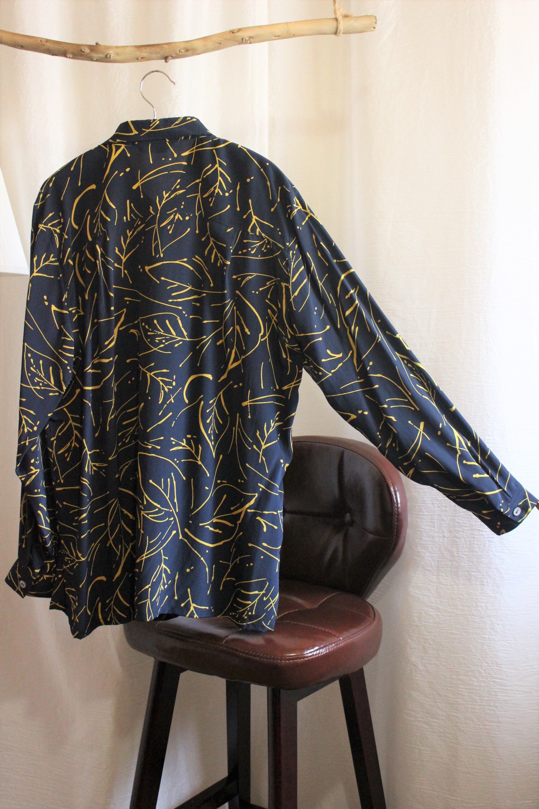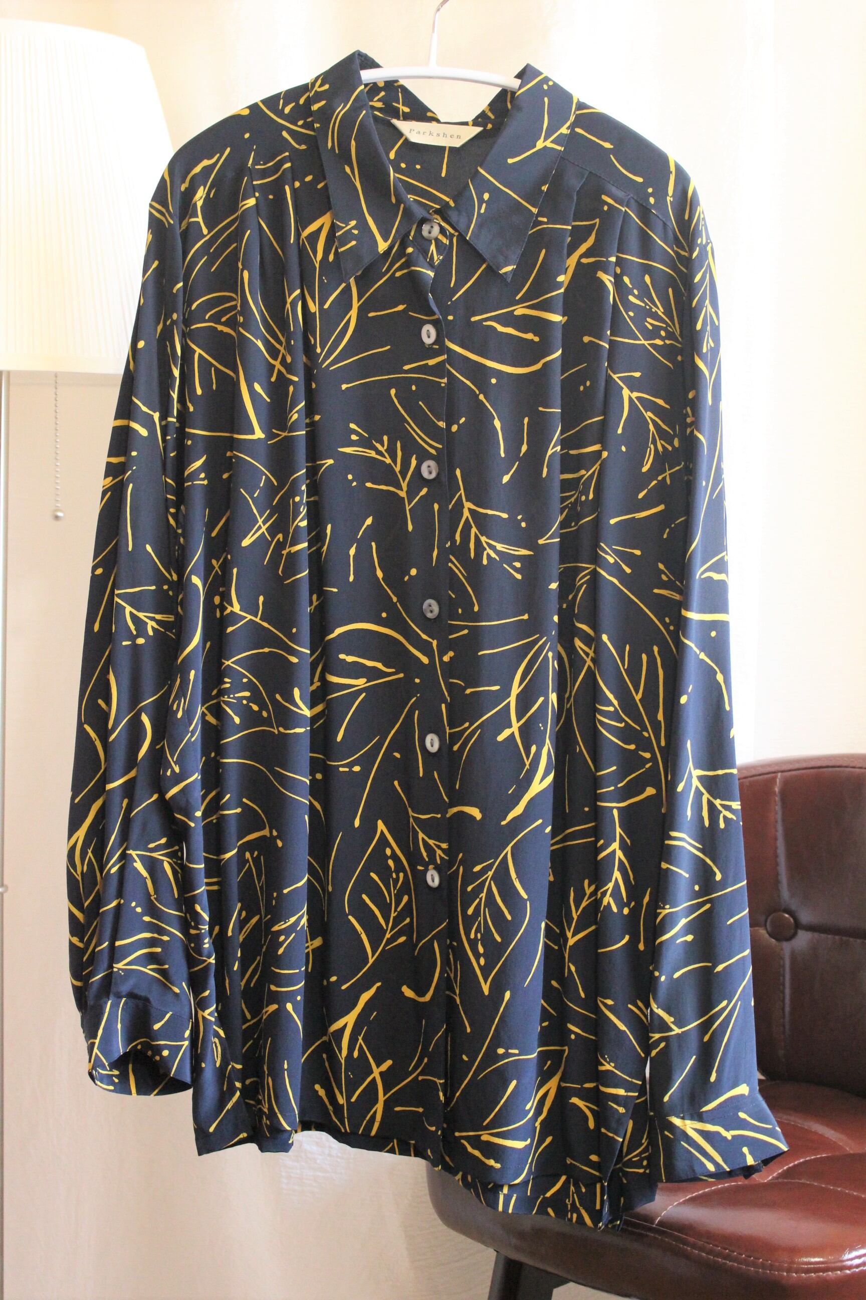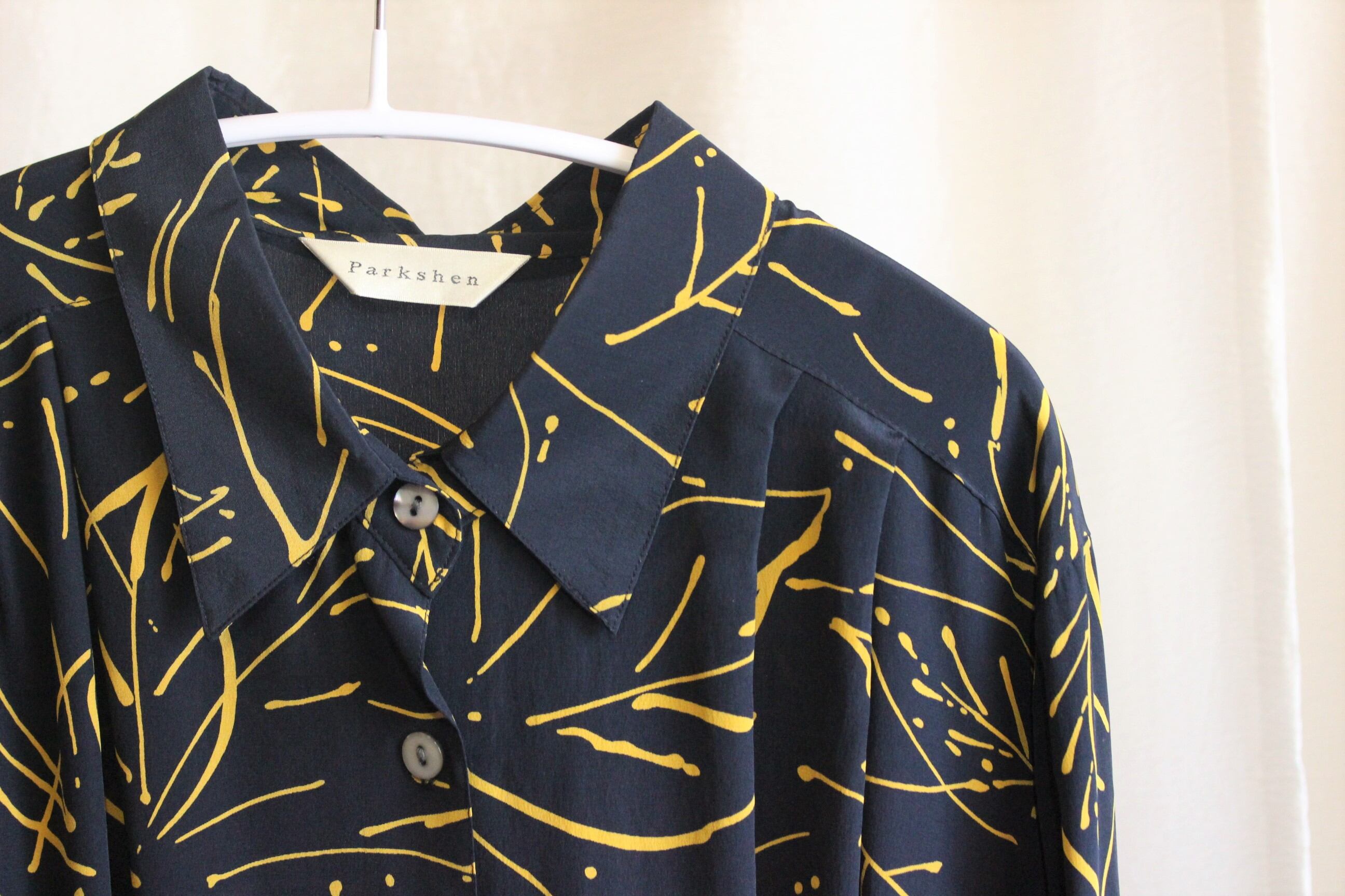 黒地に黄色コントラストが特徴的なシルク100%のシャツ。