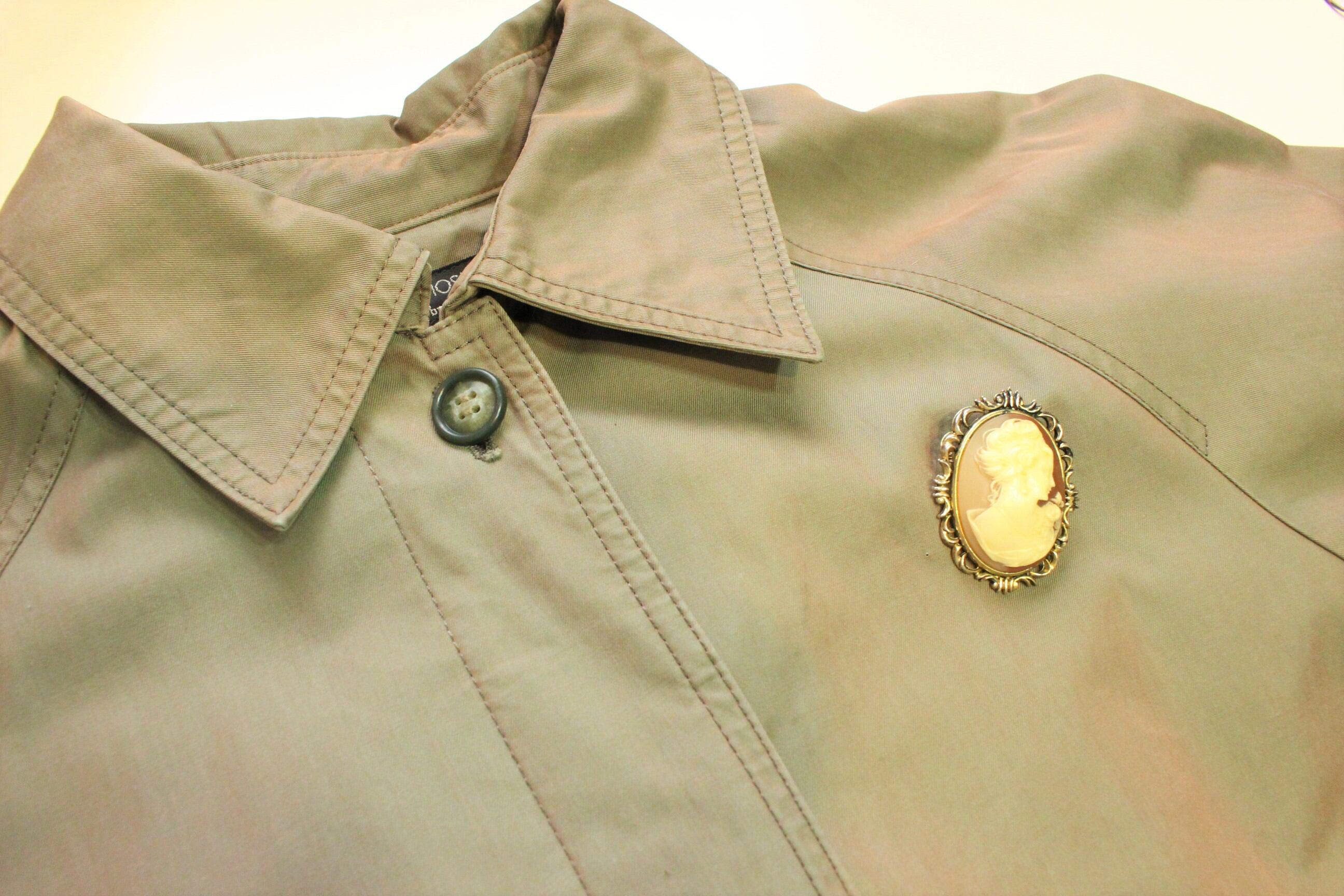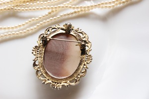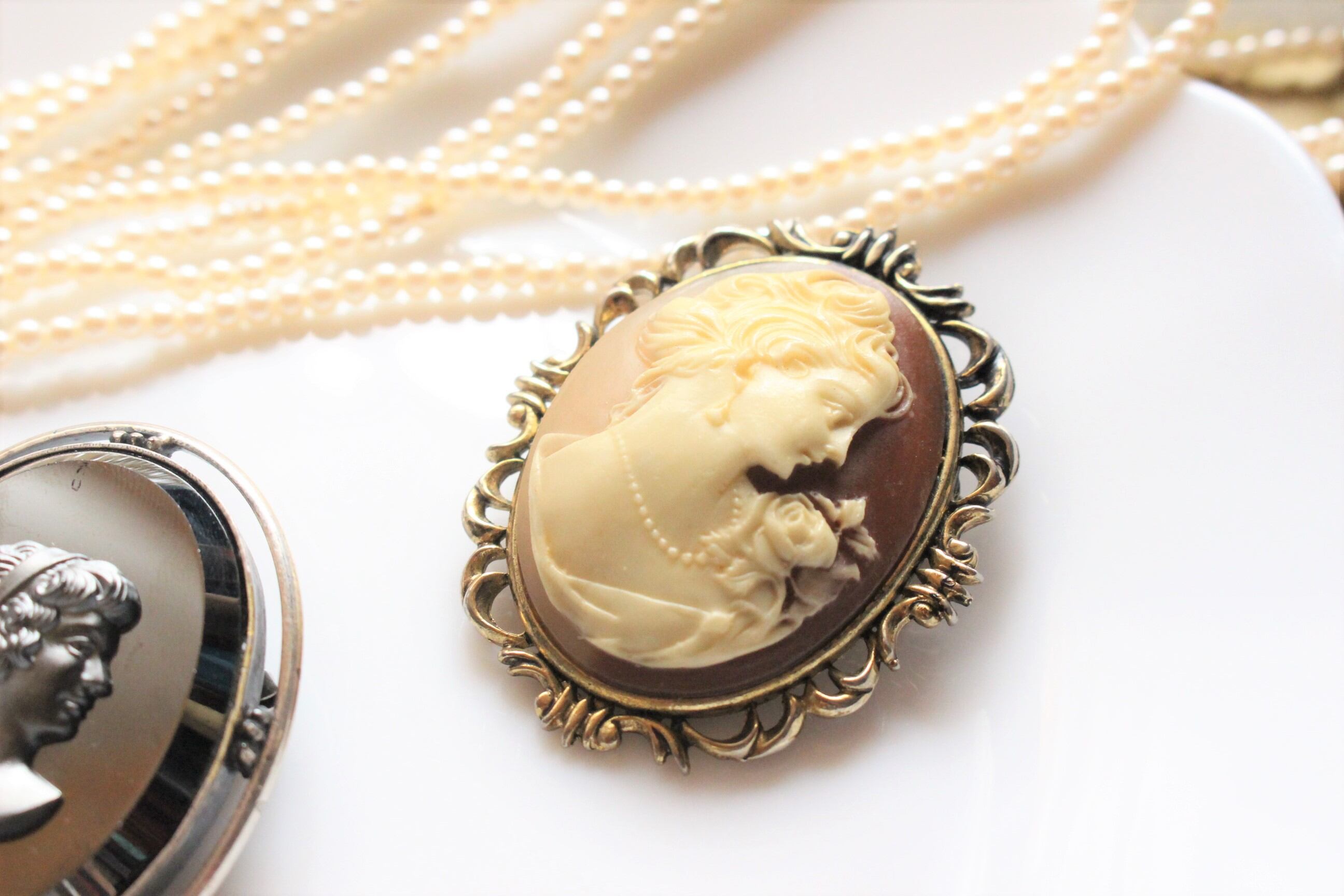 女性の横顔が彫られたアンティーク調のブローチ。