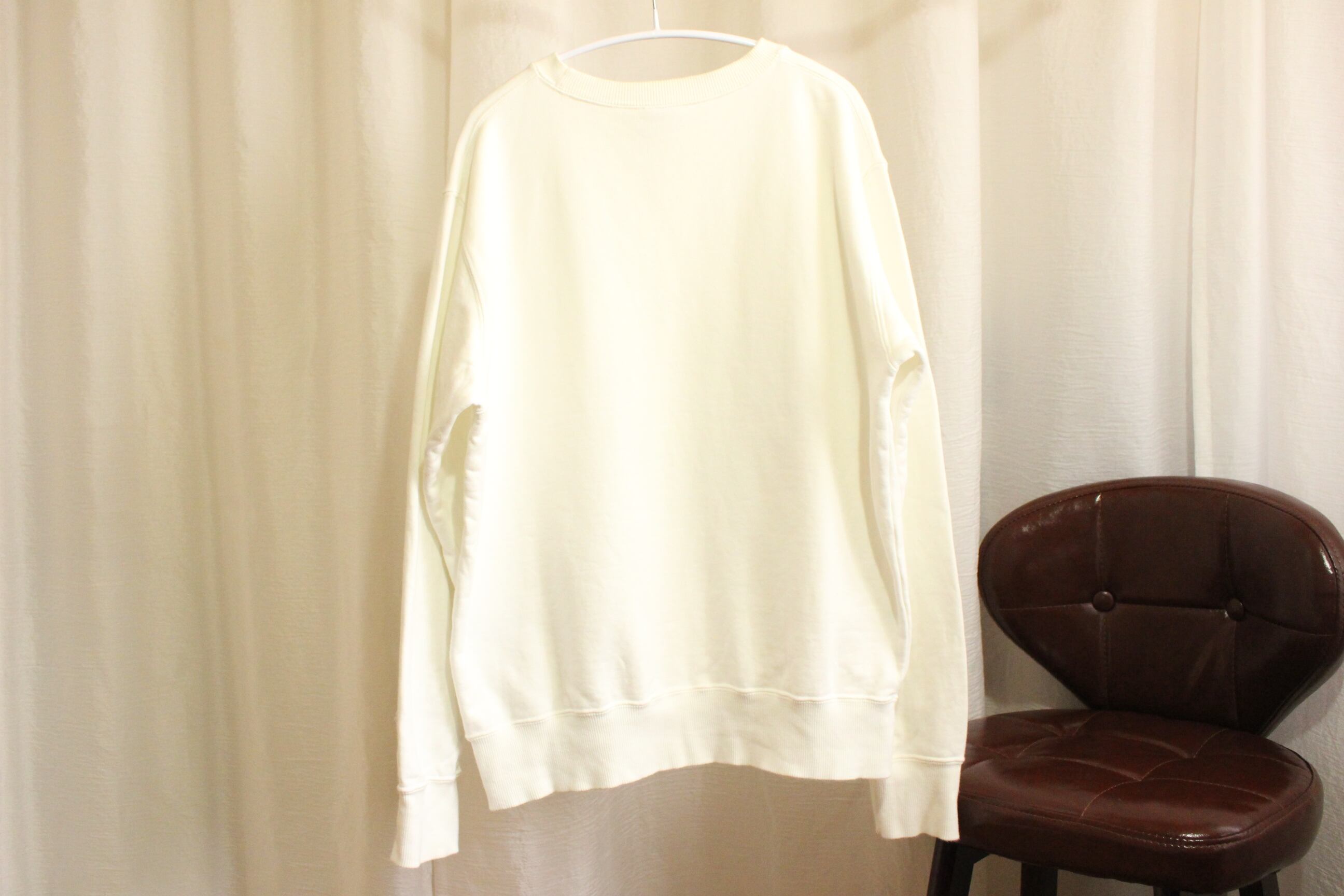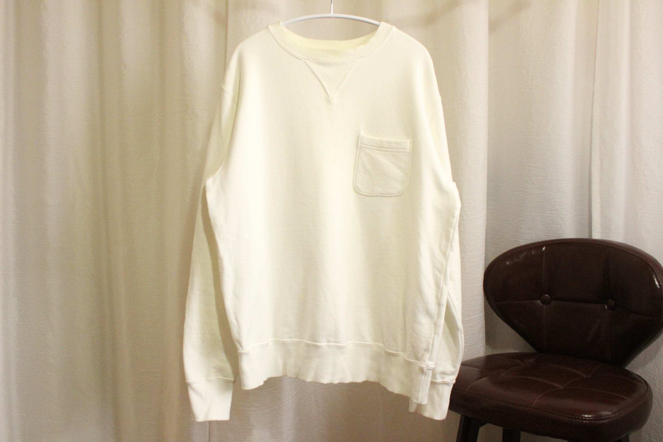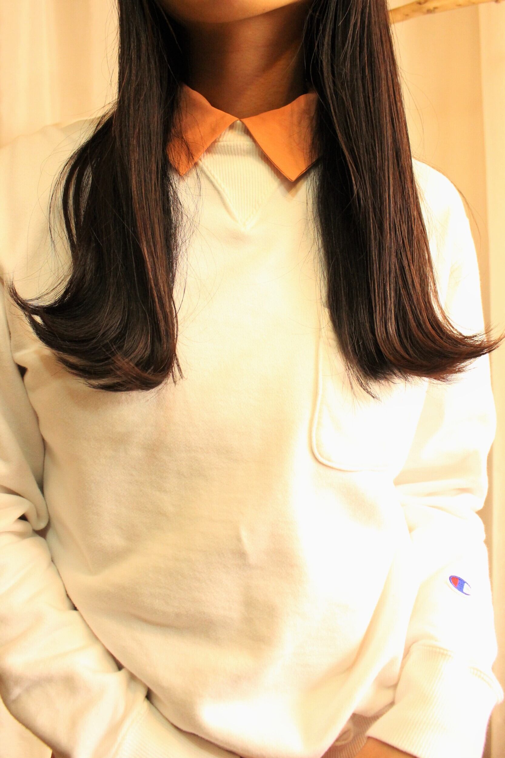 下にシャツやタートルネックを重ね着することでパターンが無限大に広がるトレーナー。