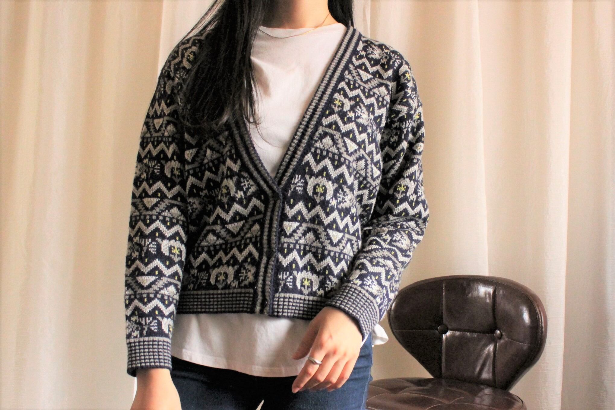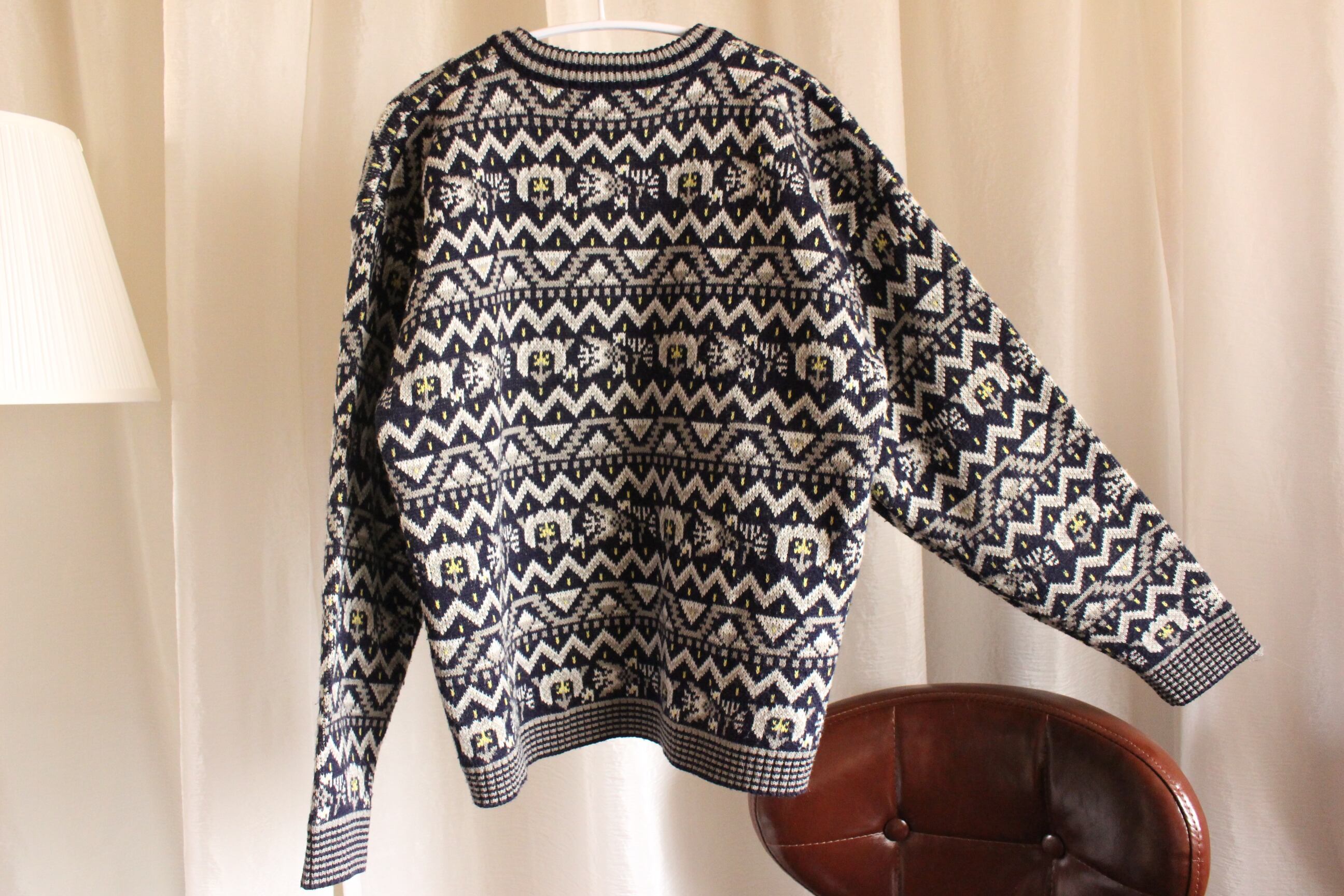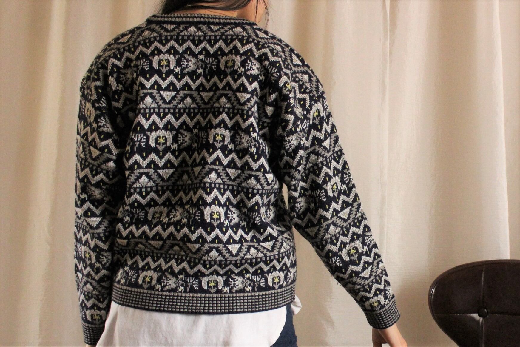 個性的な柄、トライバル柄のボックススシルエットのニット。