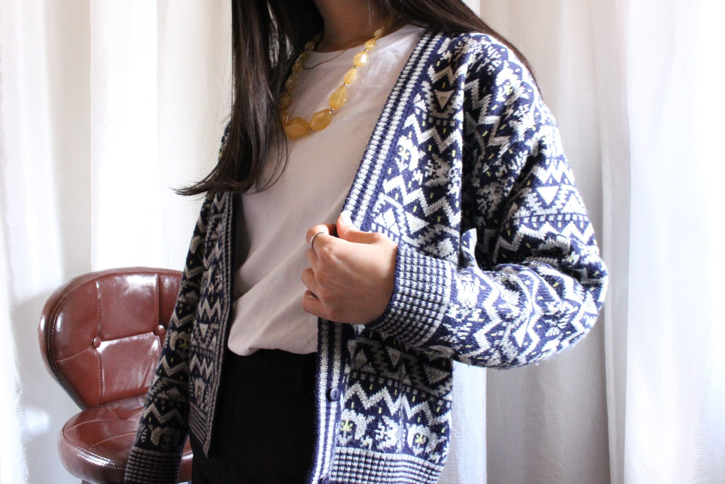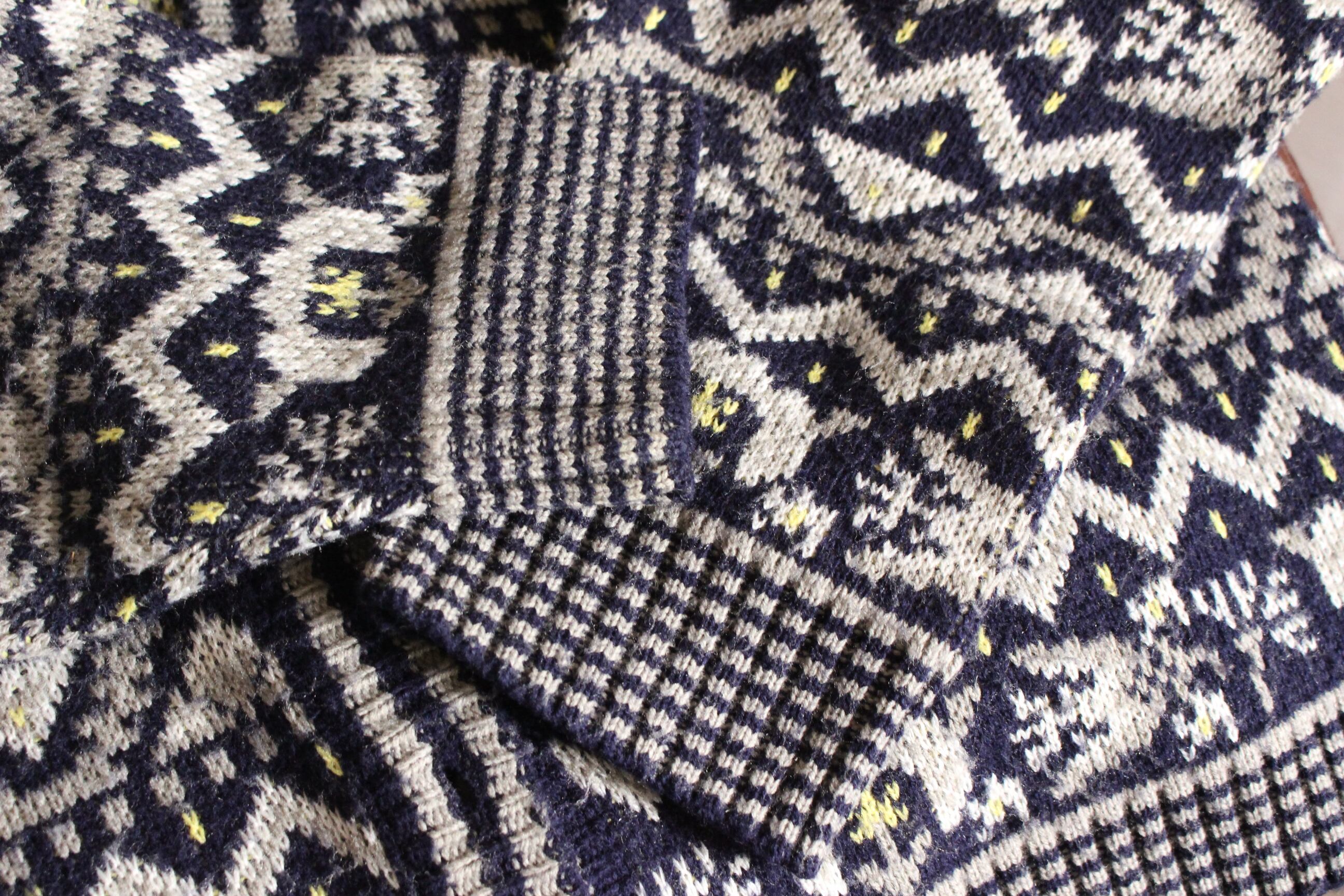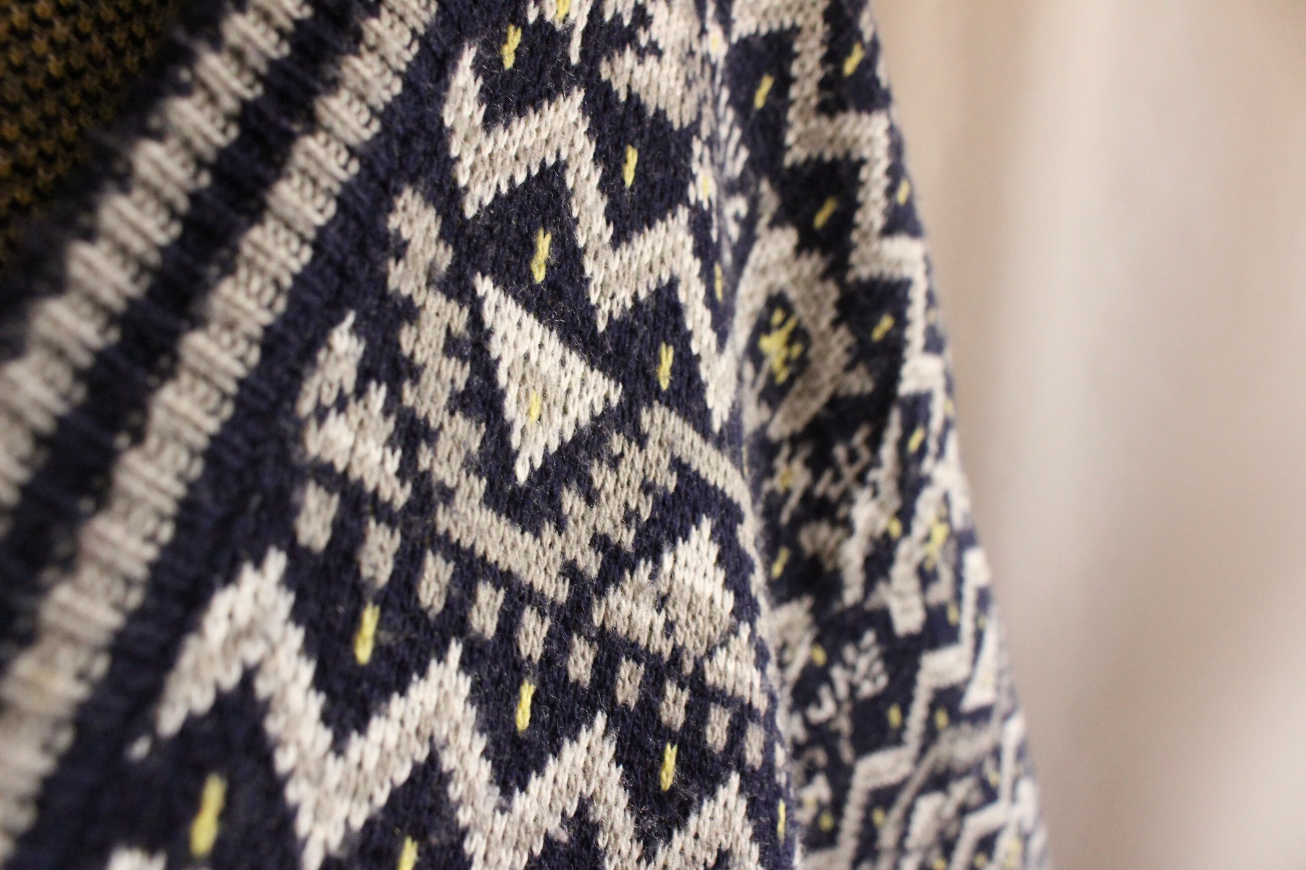 個性的な柄、トライバル柄のボックススシルエットのニット。