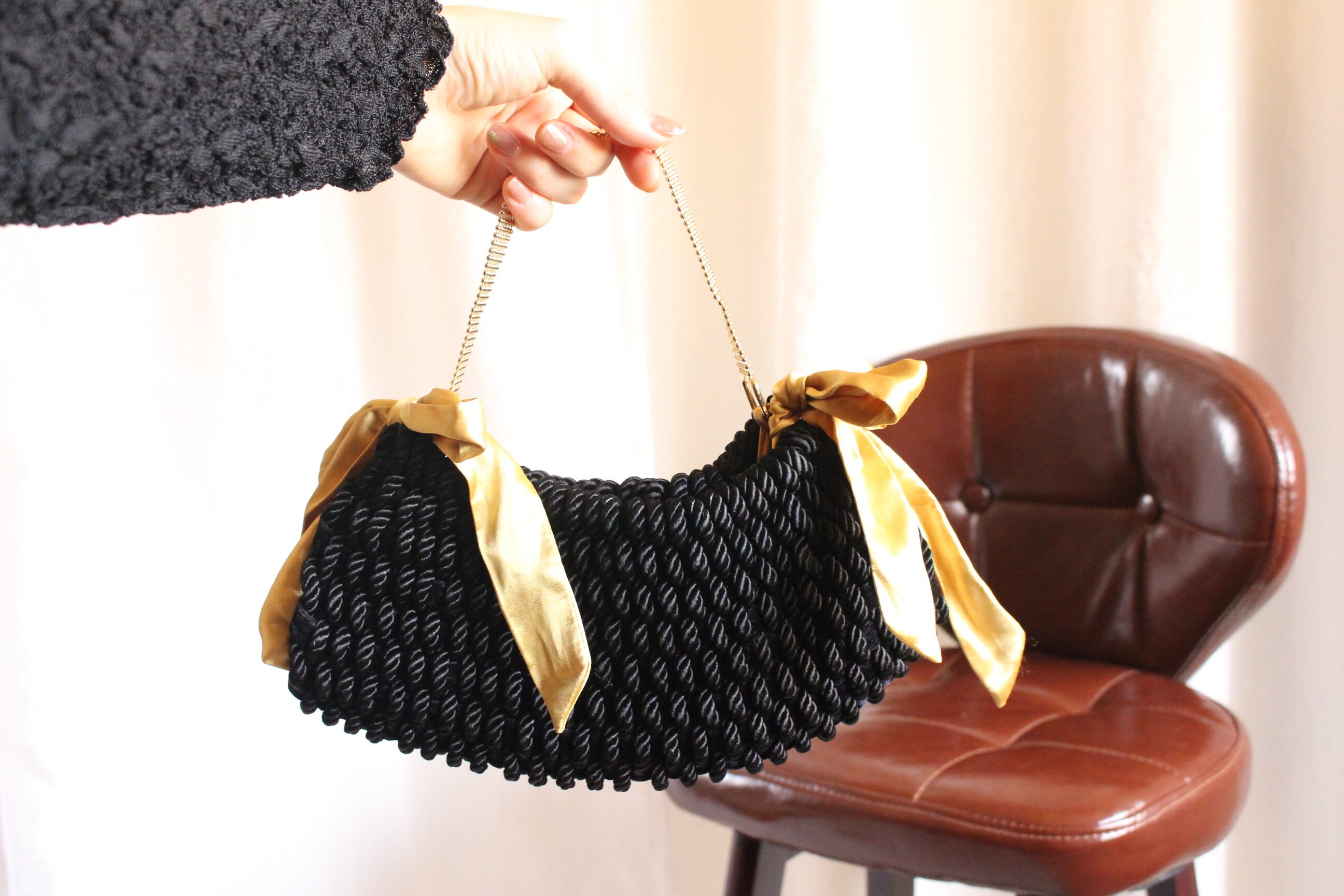 持ち手部分はチェーンデザインなっており、キラキラとゴールドのリボンと相まって華麗な印象。