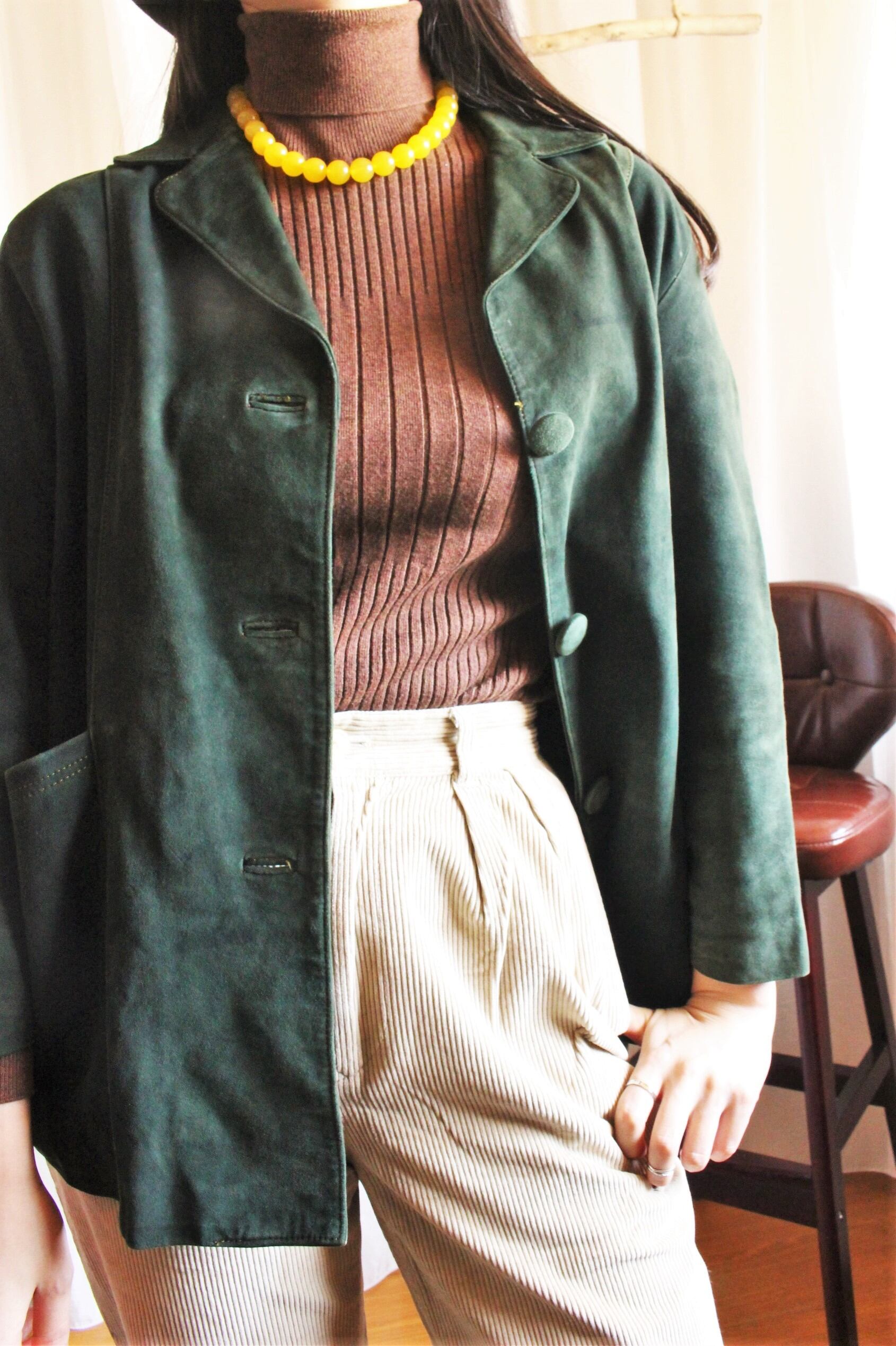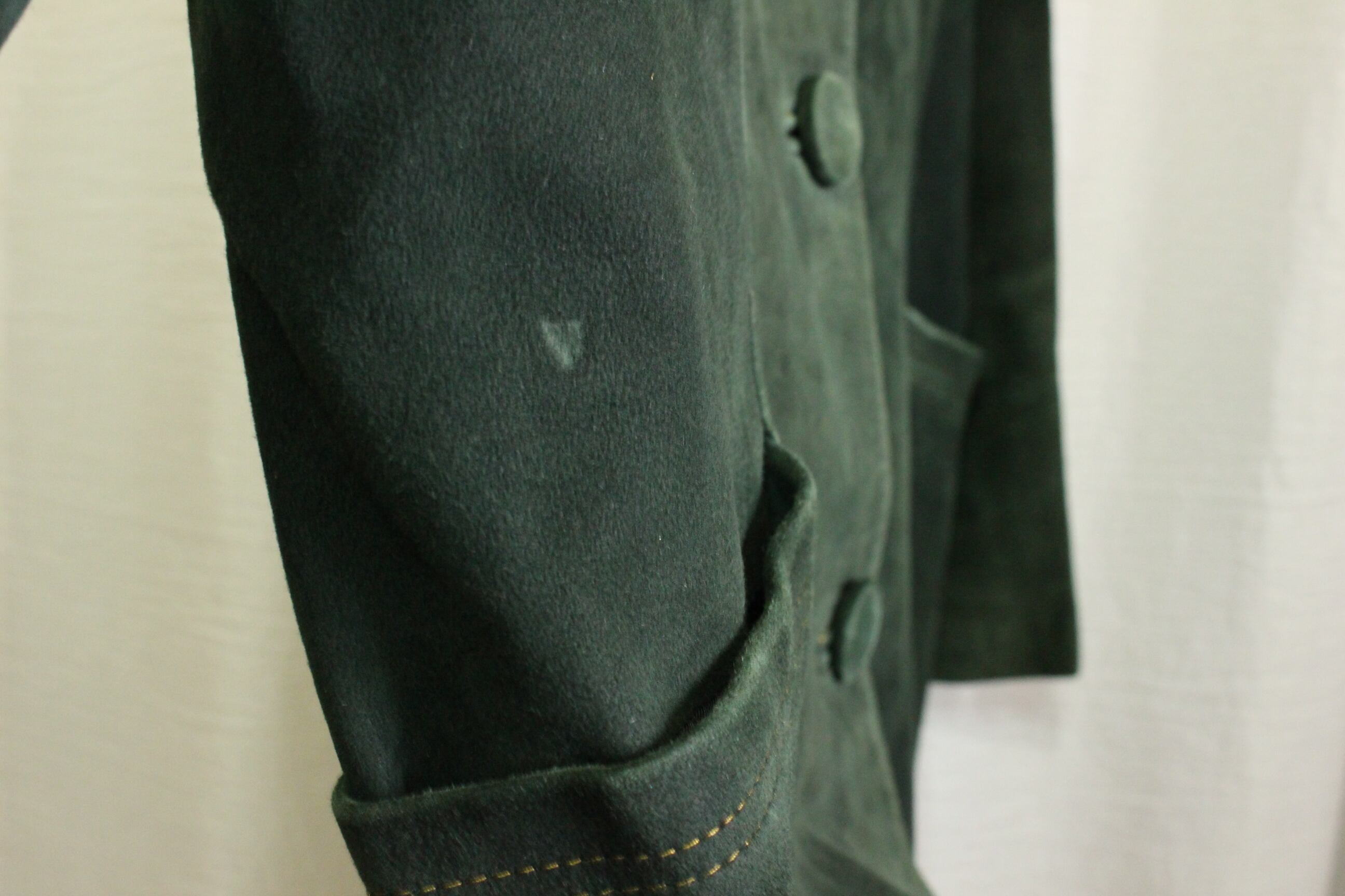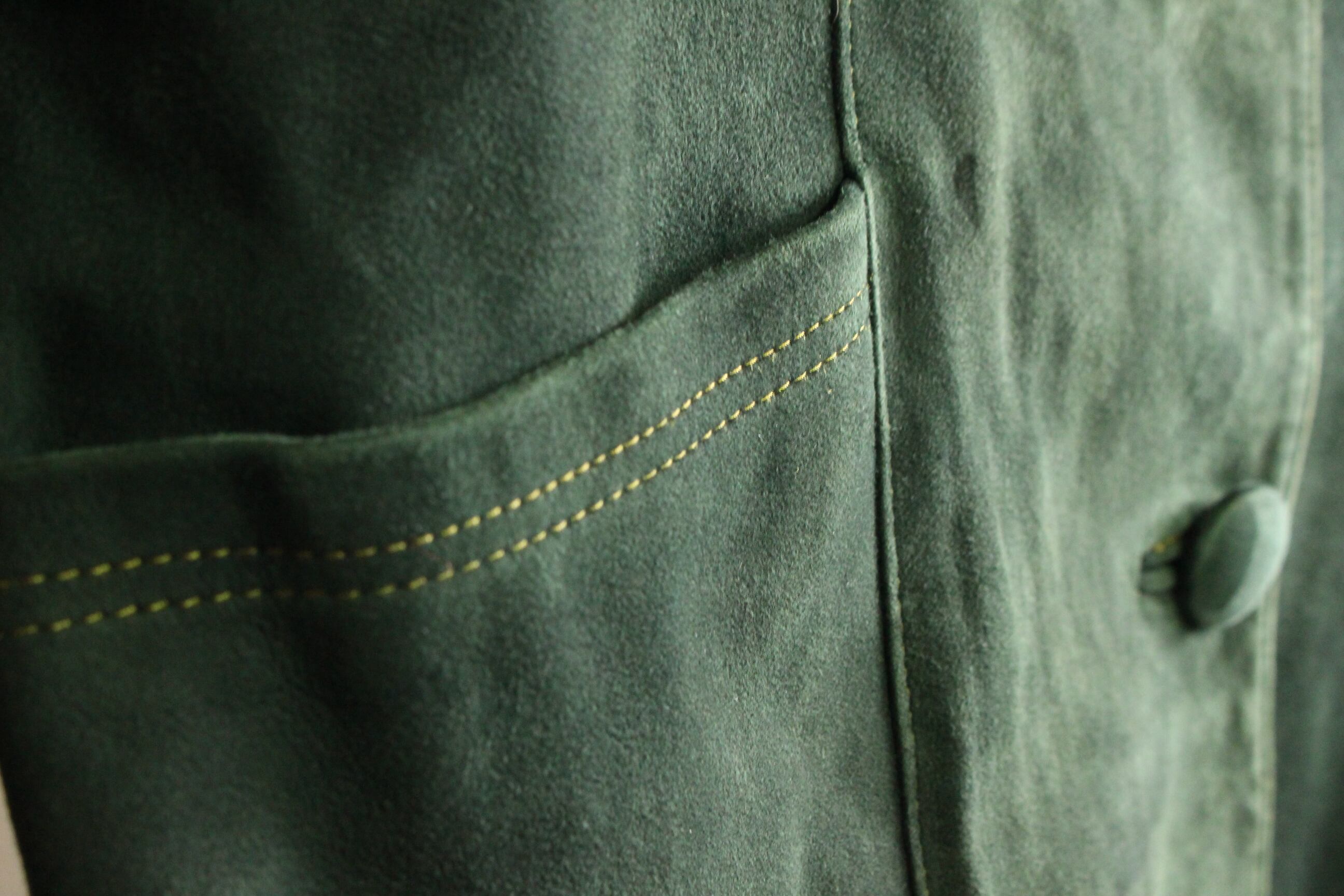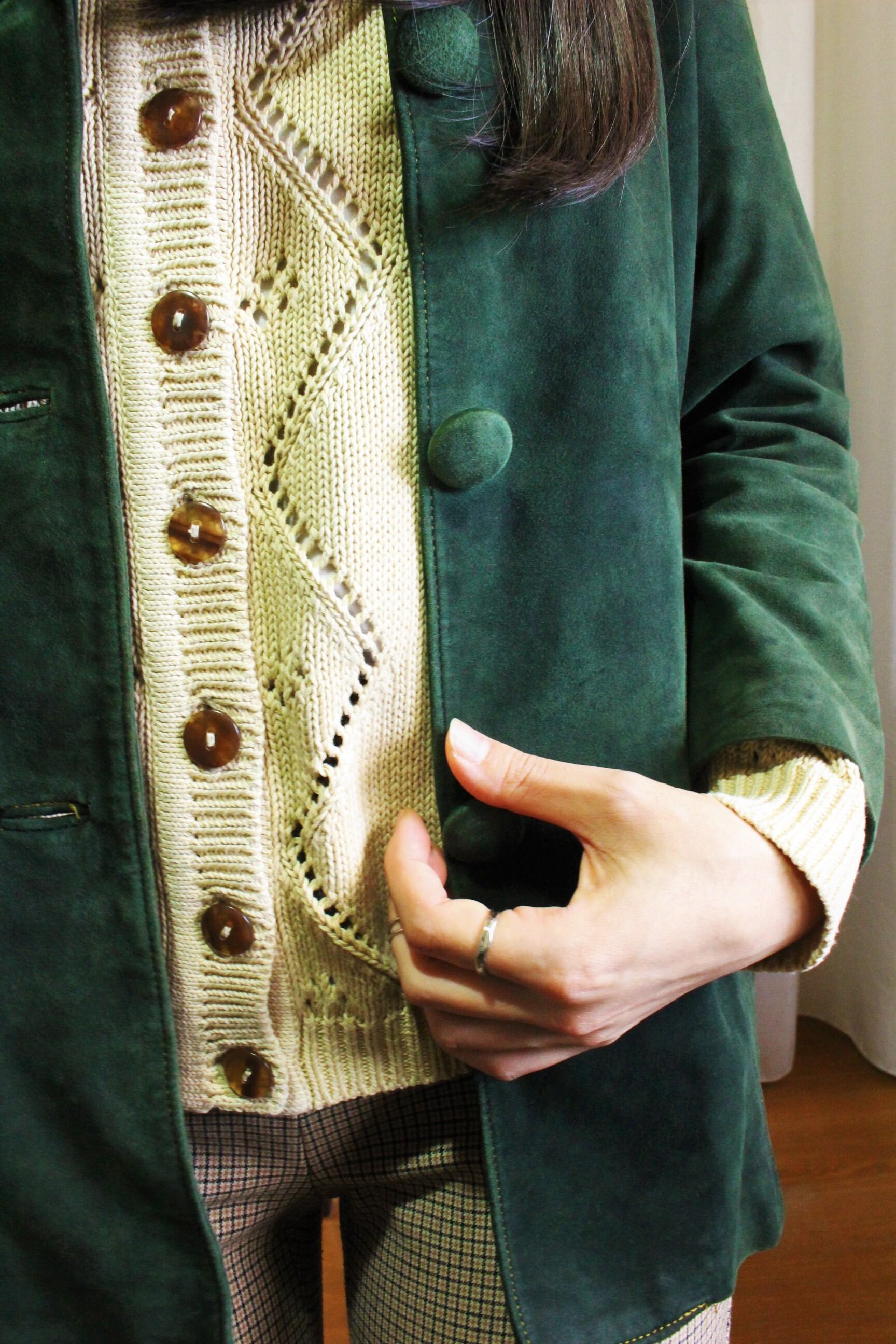 ジャケットと生地と同じスウェードの丸いボタンがとってもキュート。