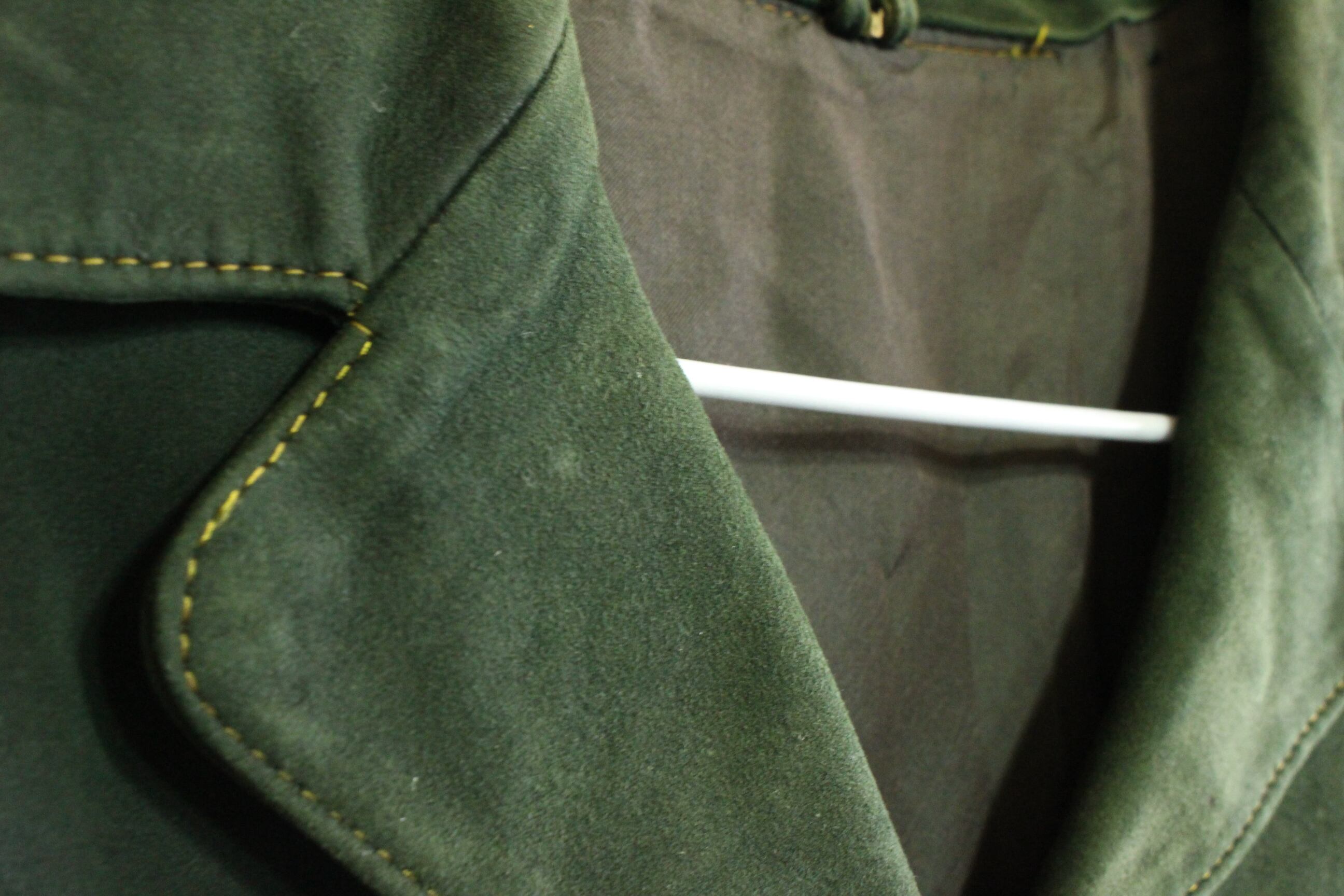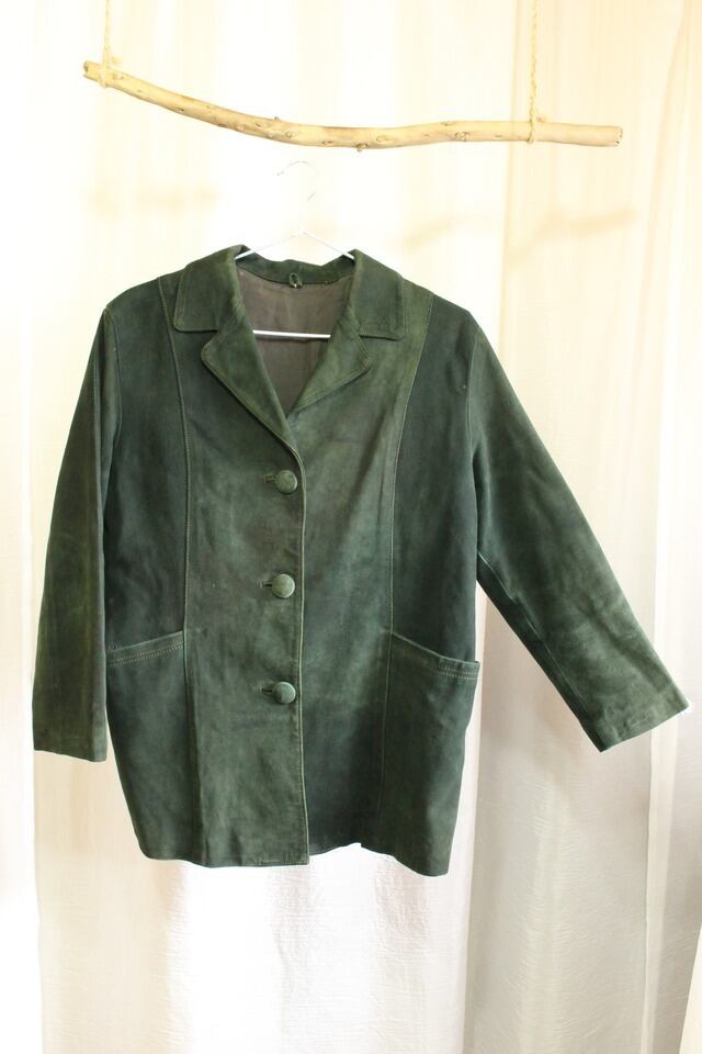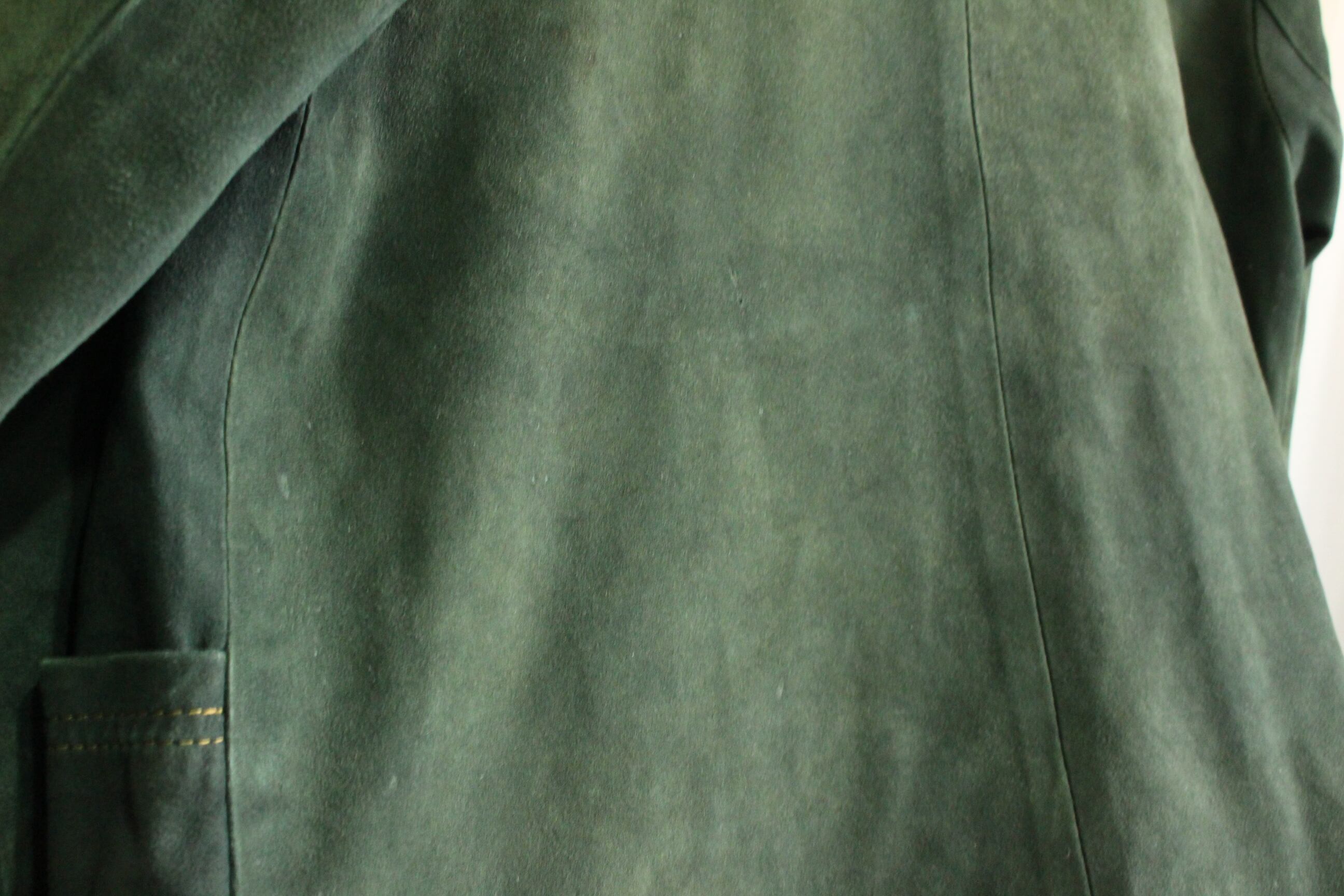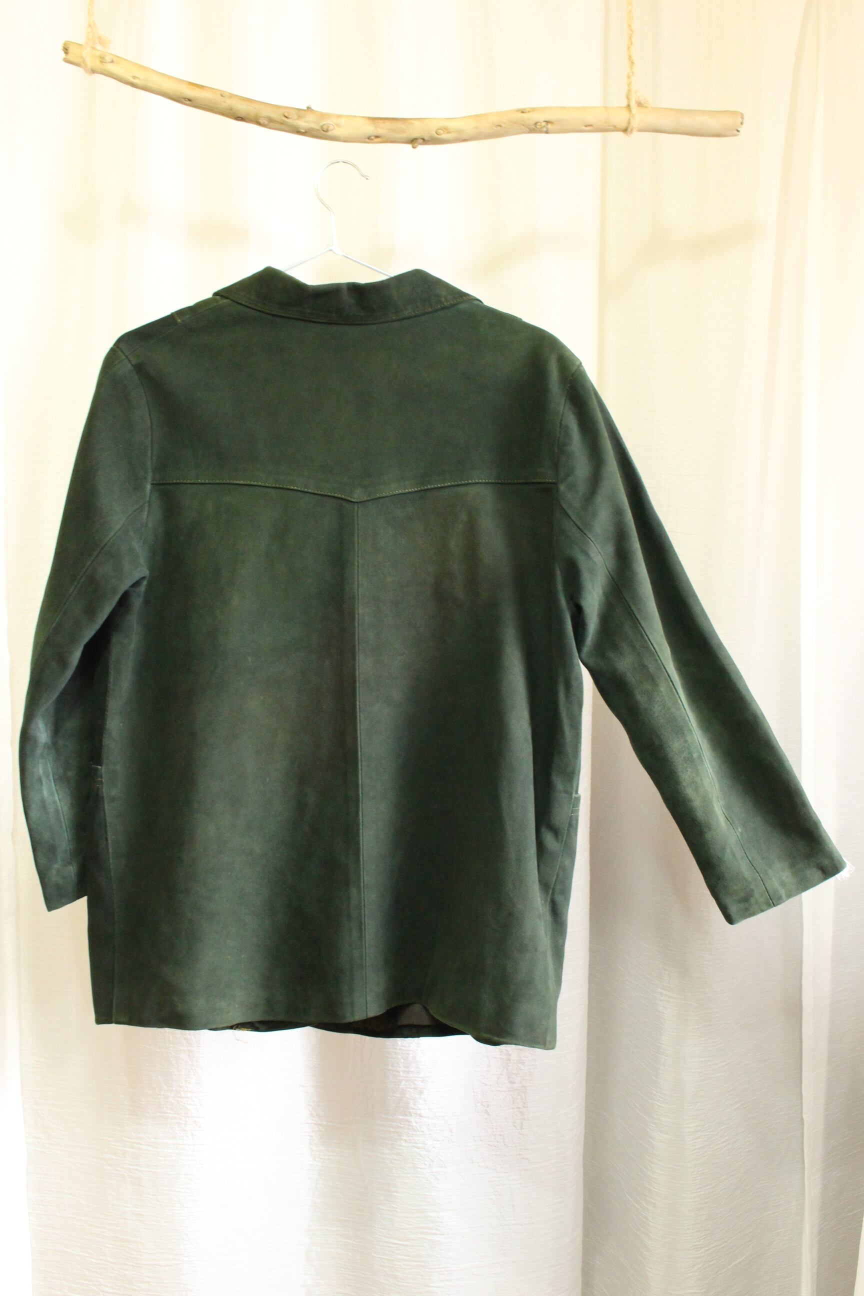 ジャケットと生地と同じスウェードの丸いボタンがとってもキュート。