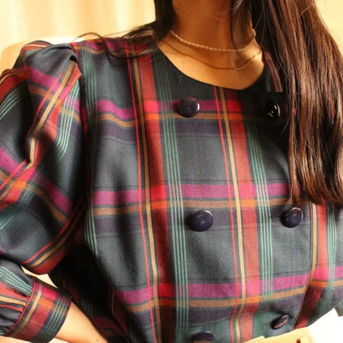 ネイビーベースのマドラスチェック生地で可愛らしさのなかに落ち着いた大人なムードのあるブラウス。