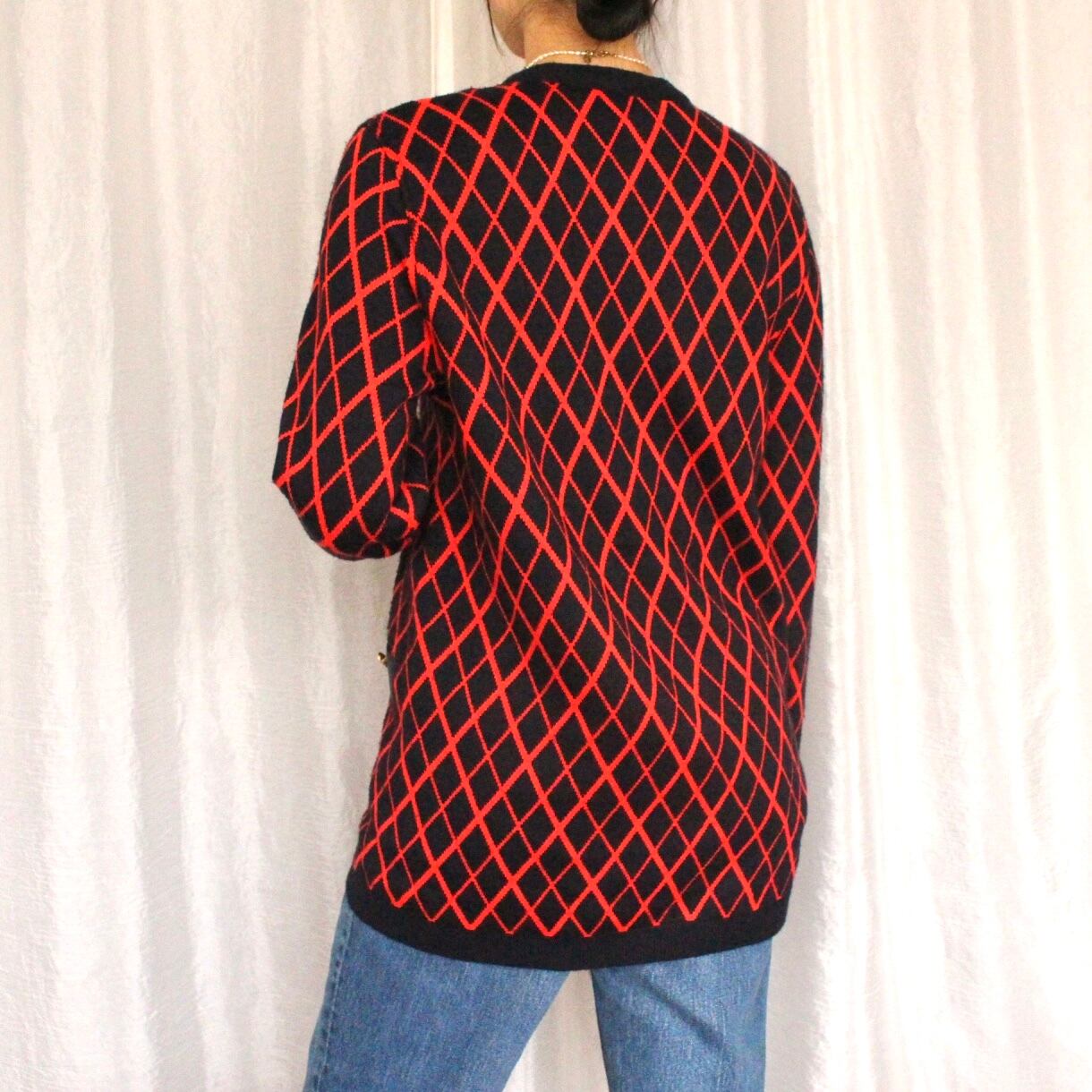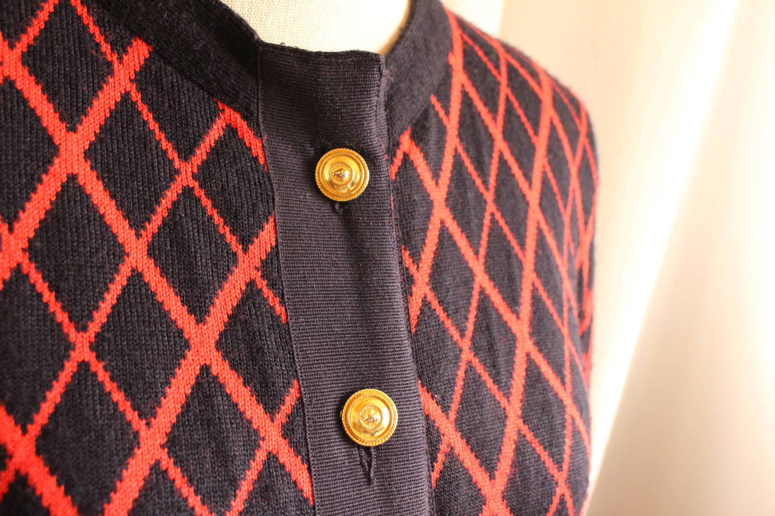 ネイビー×レッドのコントラストにゴールドのボタンが際立つクラシカルなニットカーディガン。