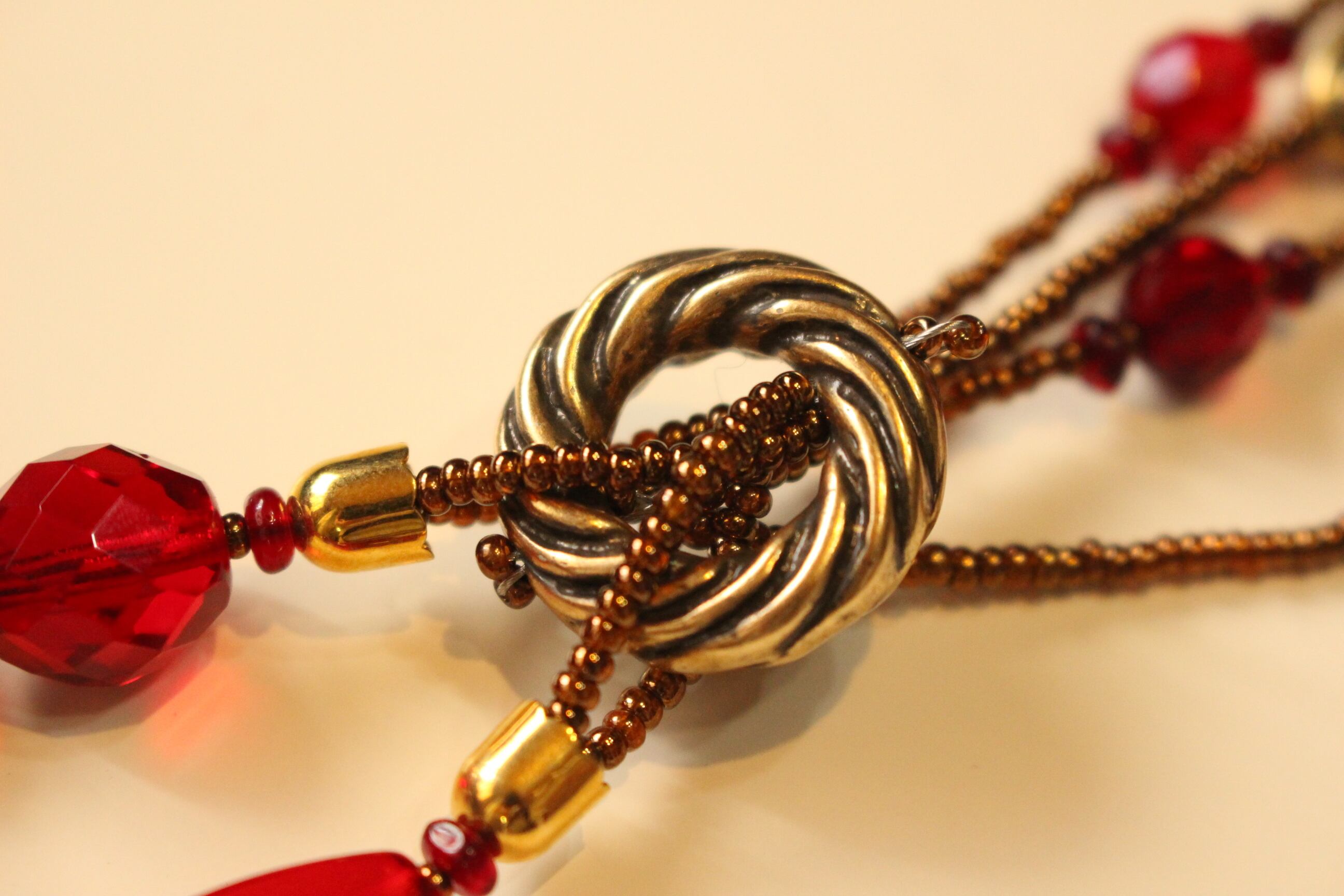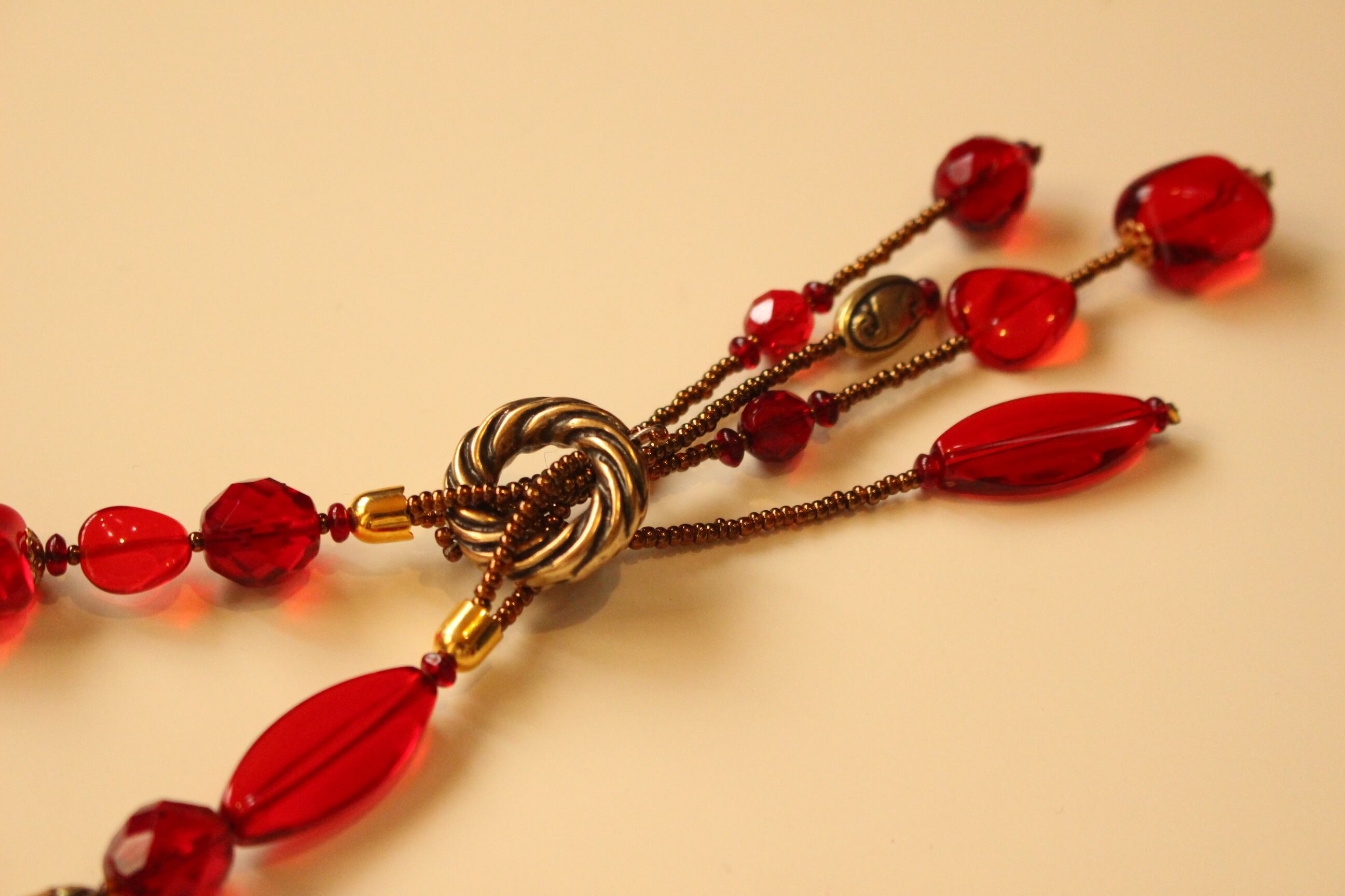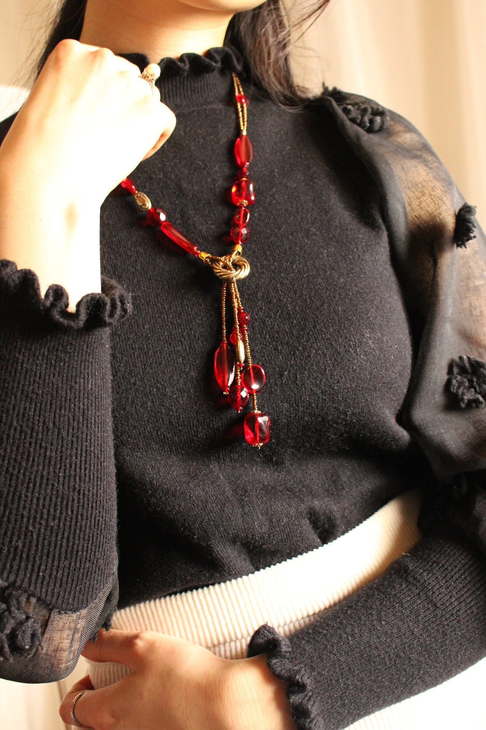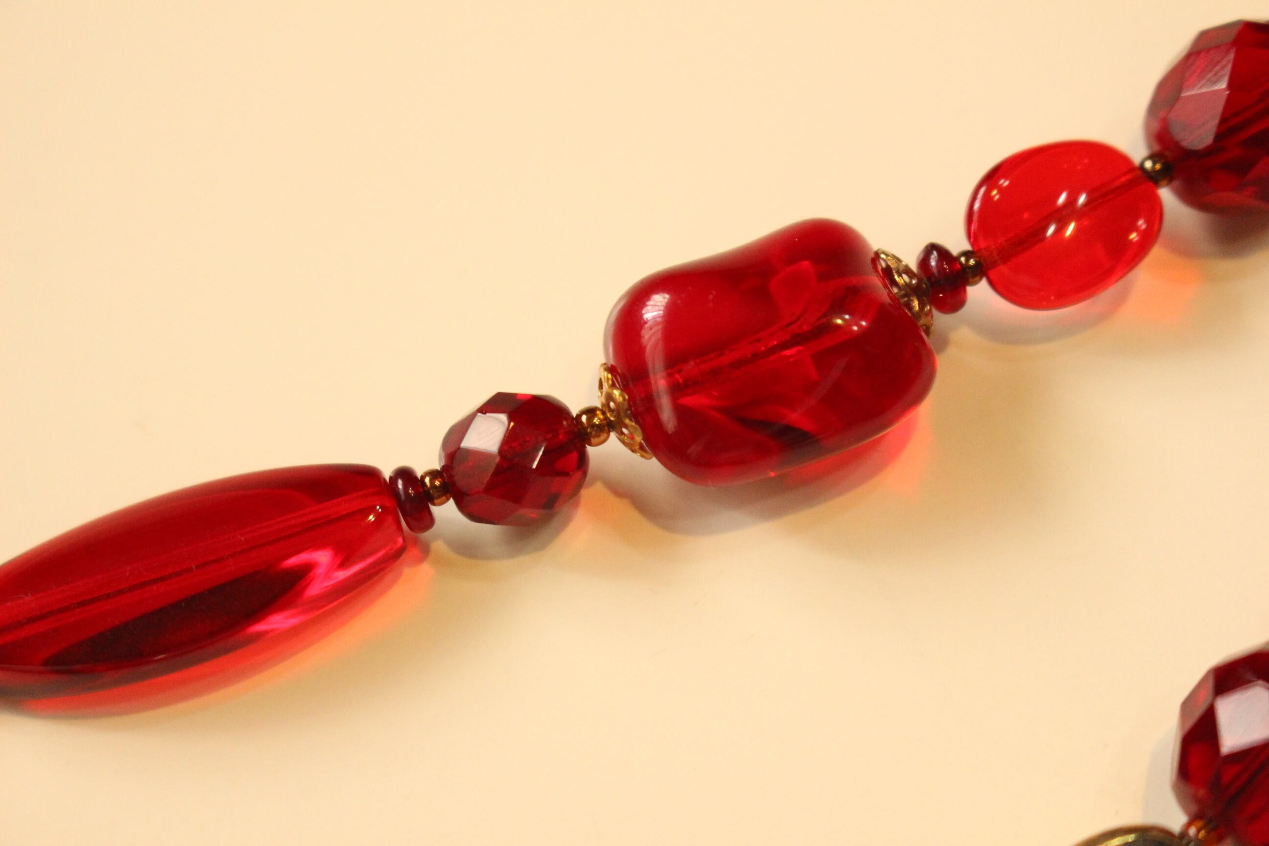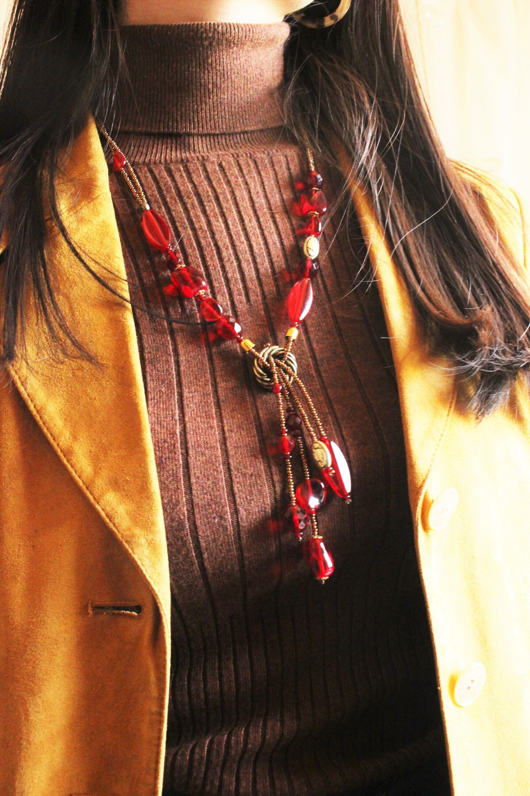 透き通るレッドカラーのビーズにゴールドの組み合わせで、ドラマチックな雰囲気を放つネックレス。