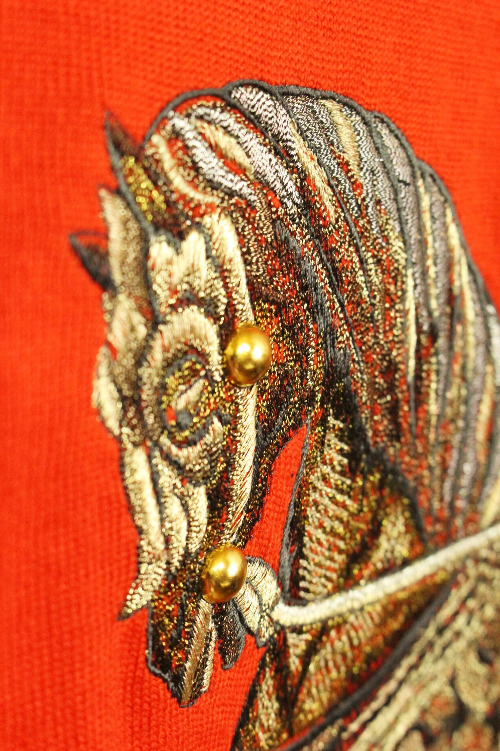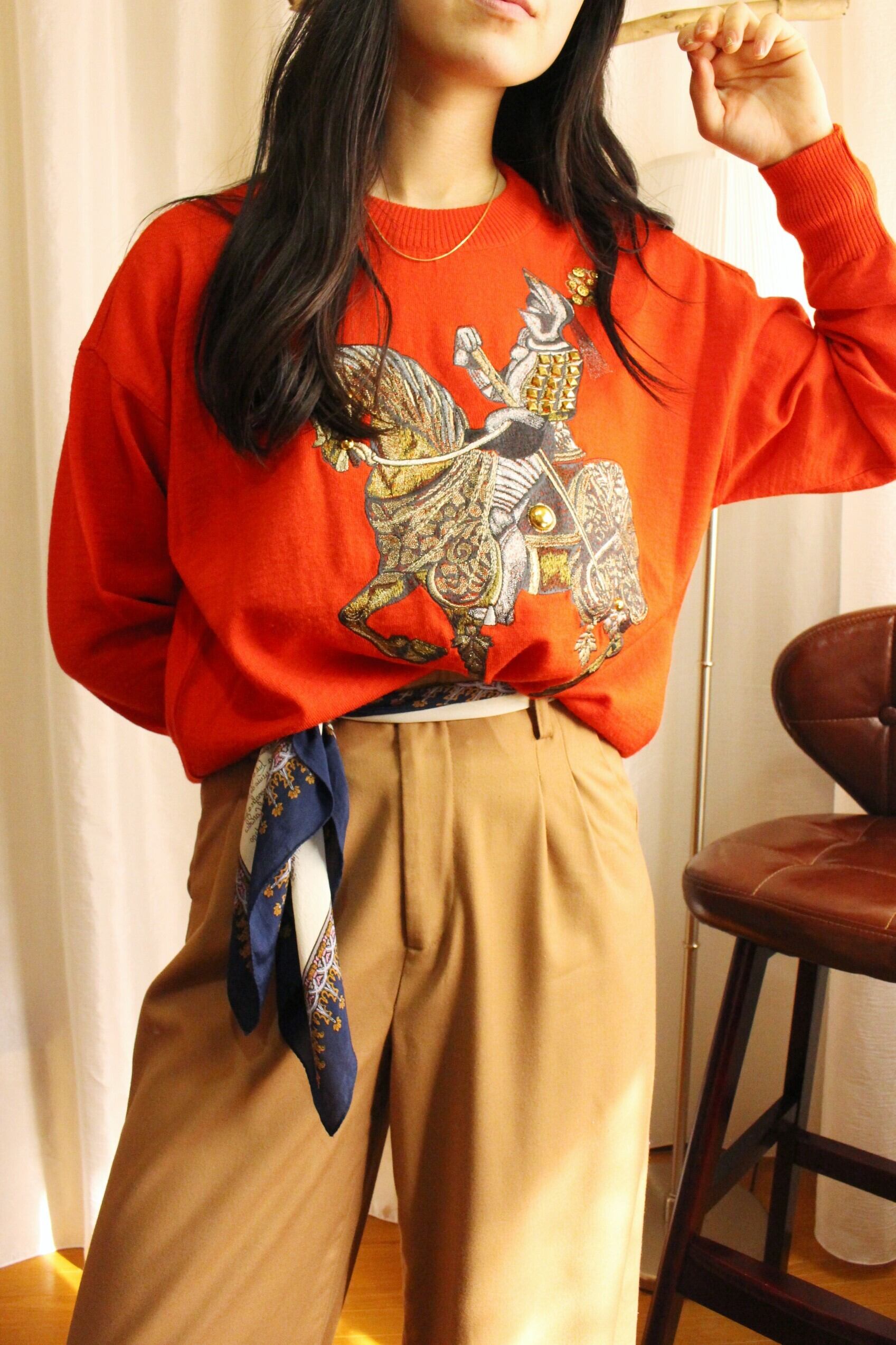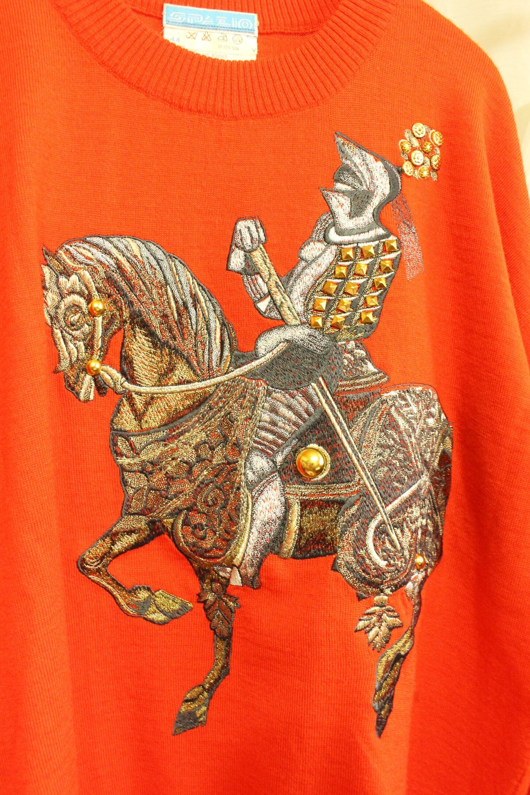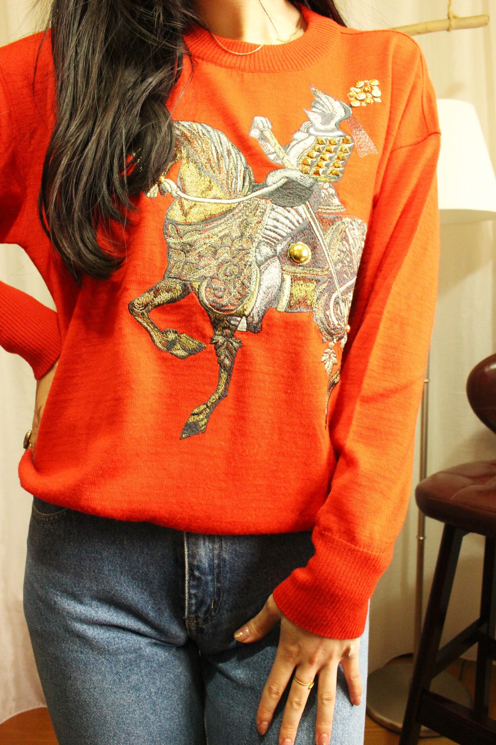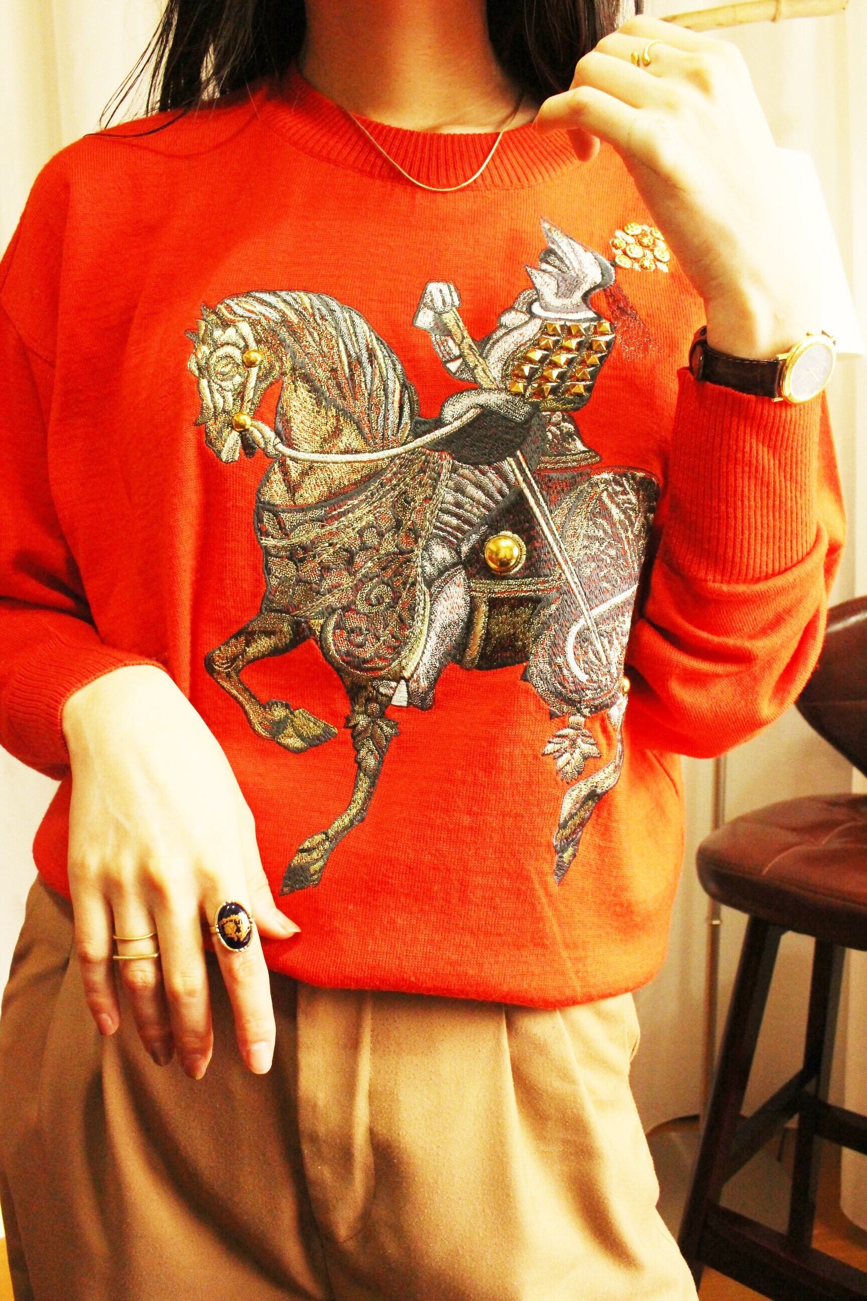 鮮やかな真っ赤なニットに、インパクトのある刺繍デザイン。