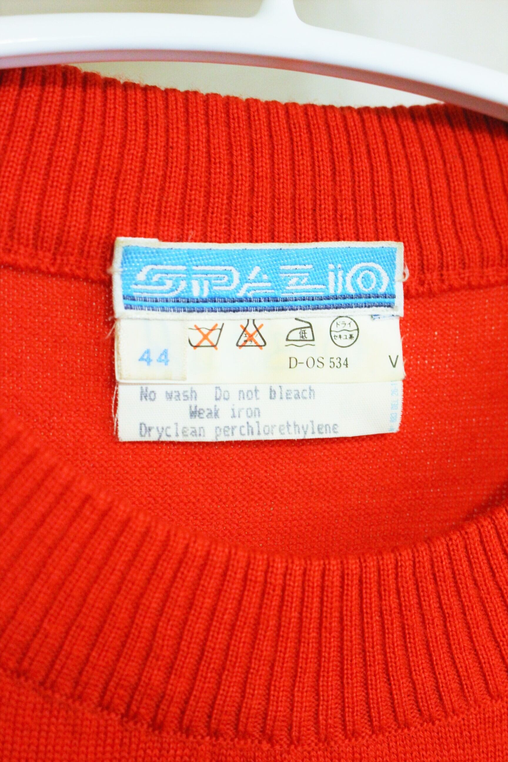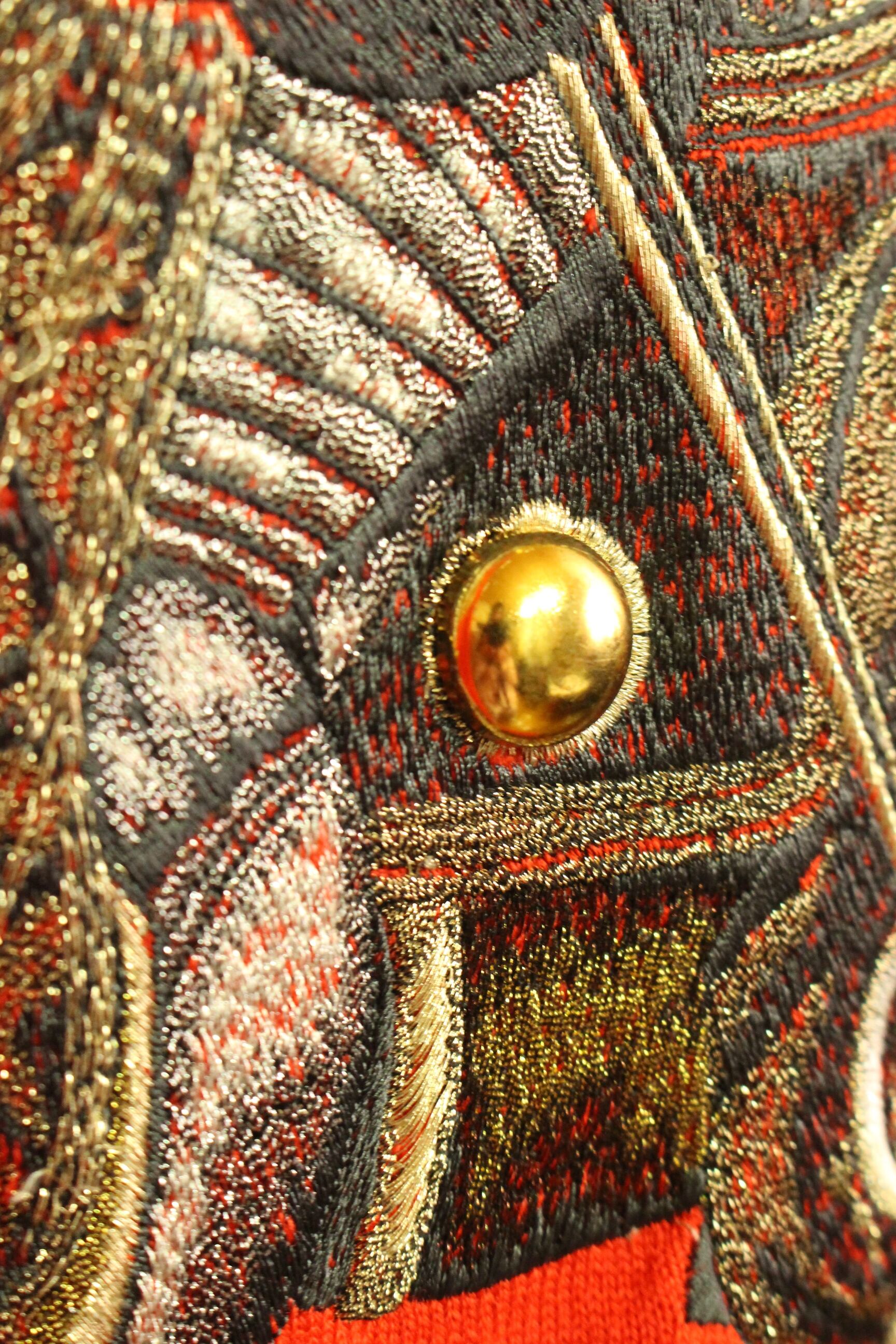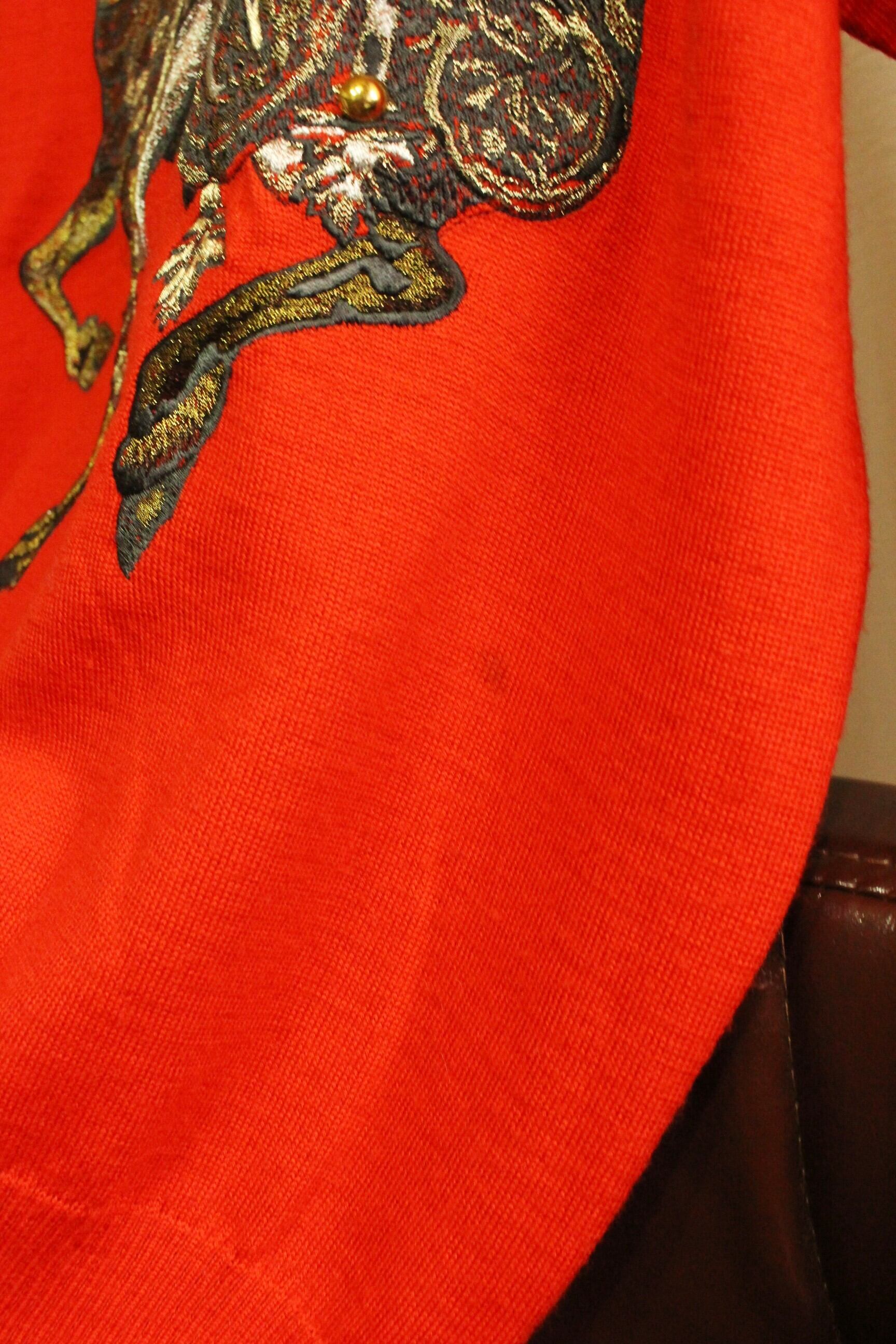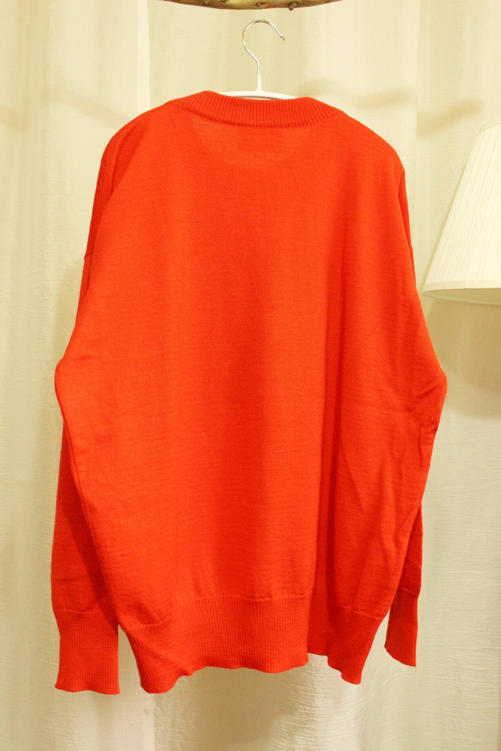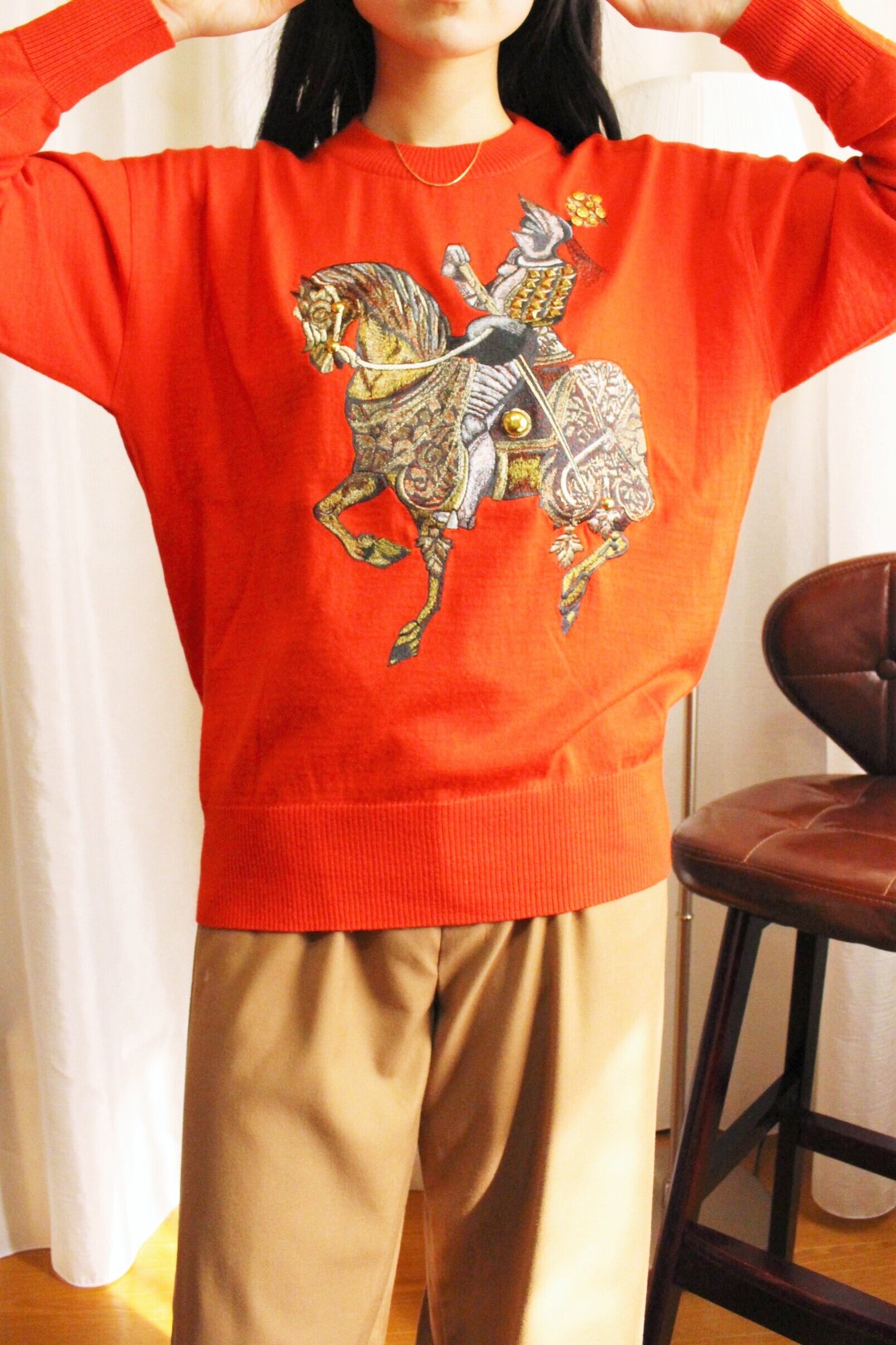 鮮やかな真っ赤なニットに、インパクトのある刺繍デザイン。
