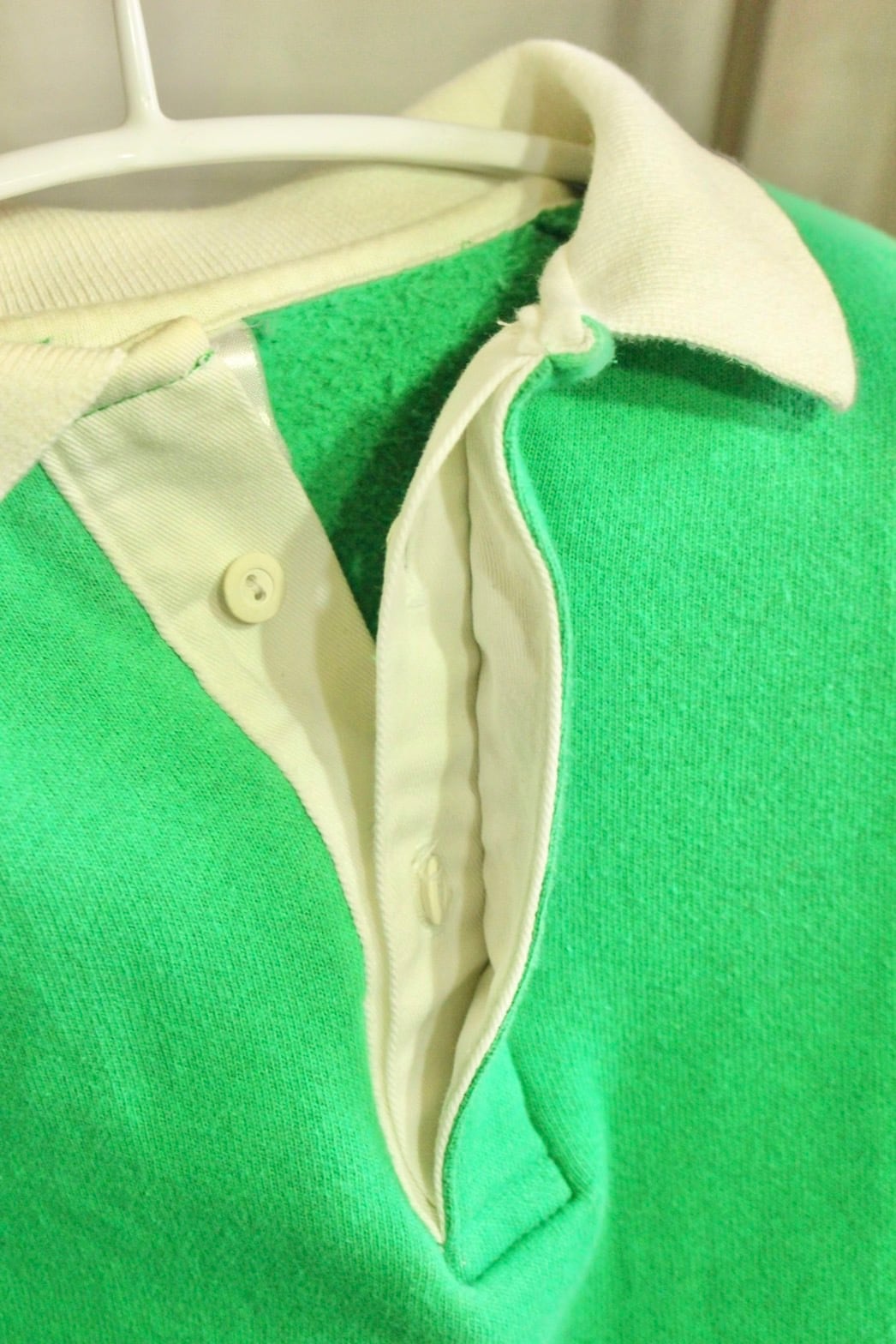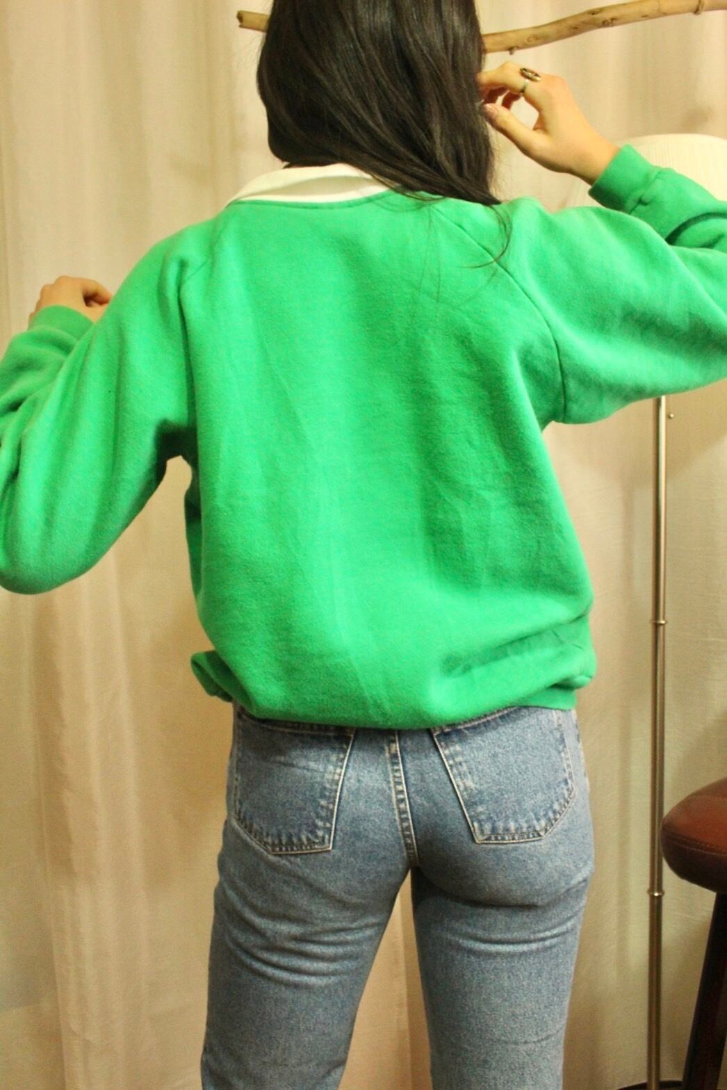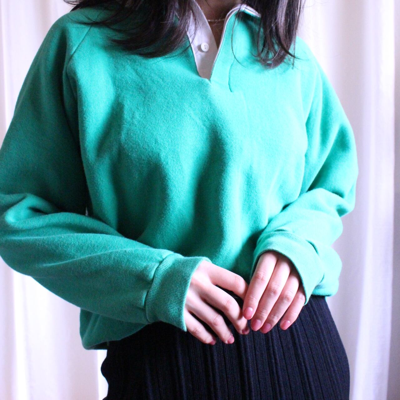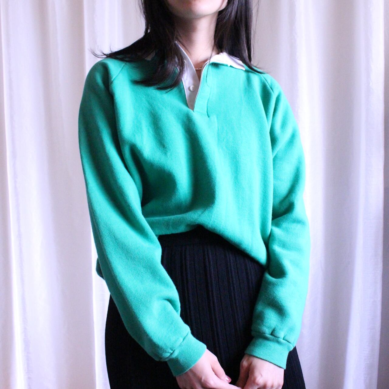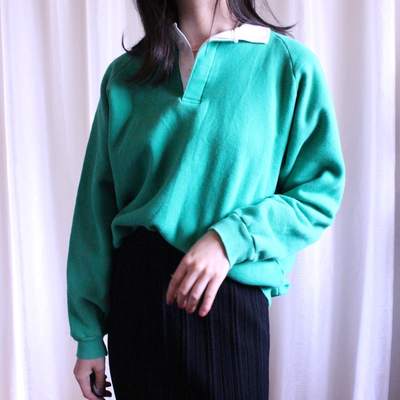 メンズサイズでゆったり着られる旬なグリーントレーナー。