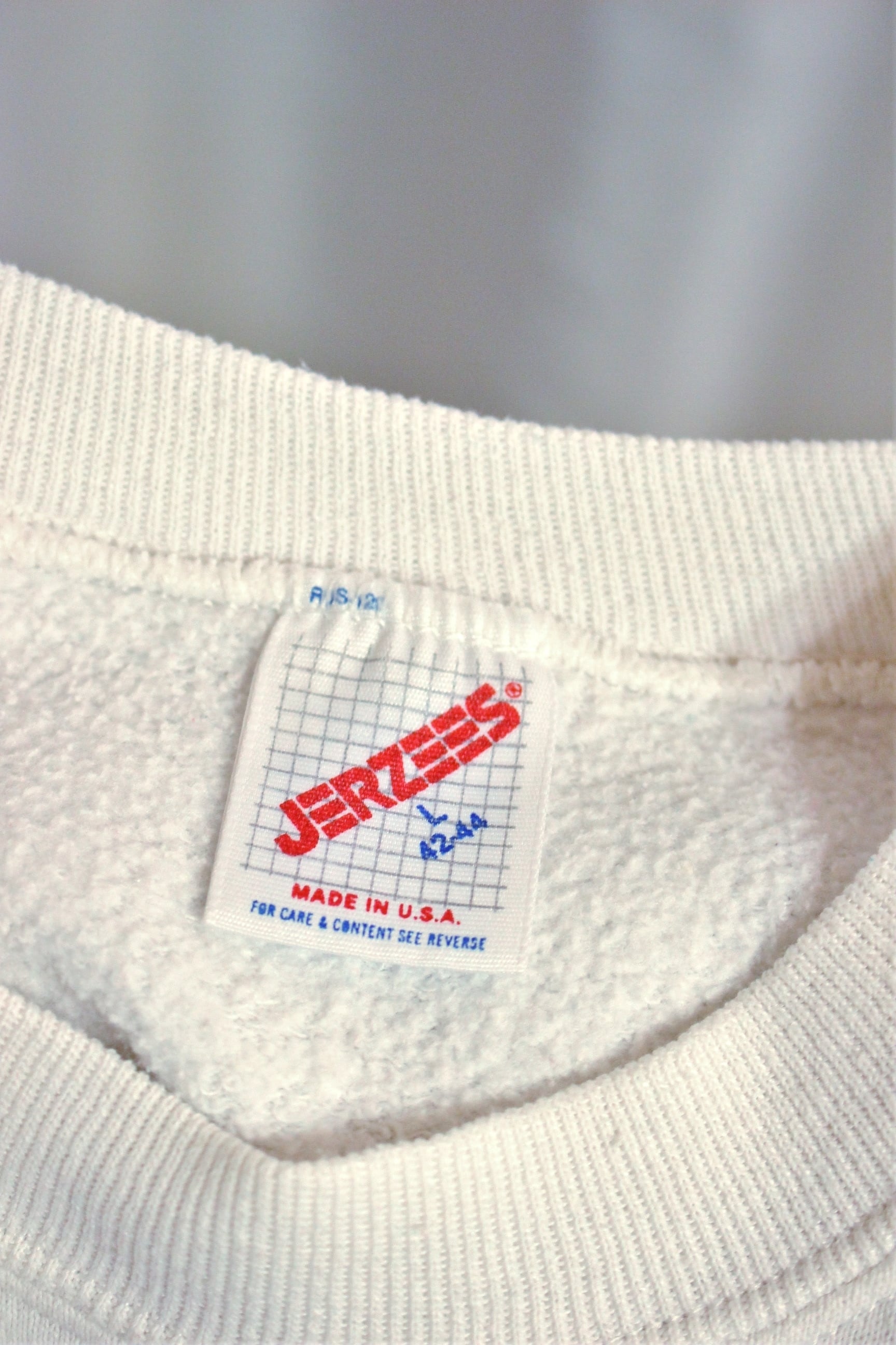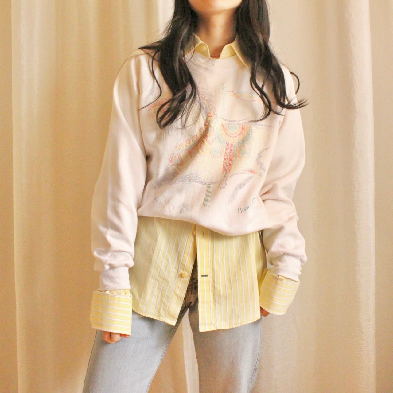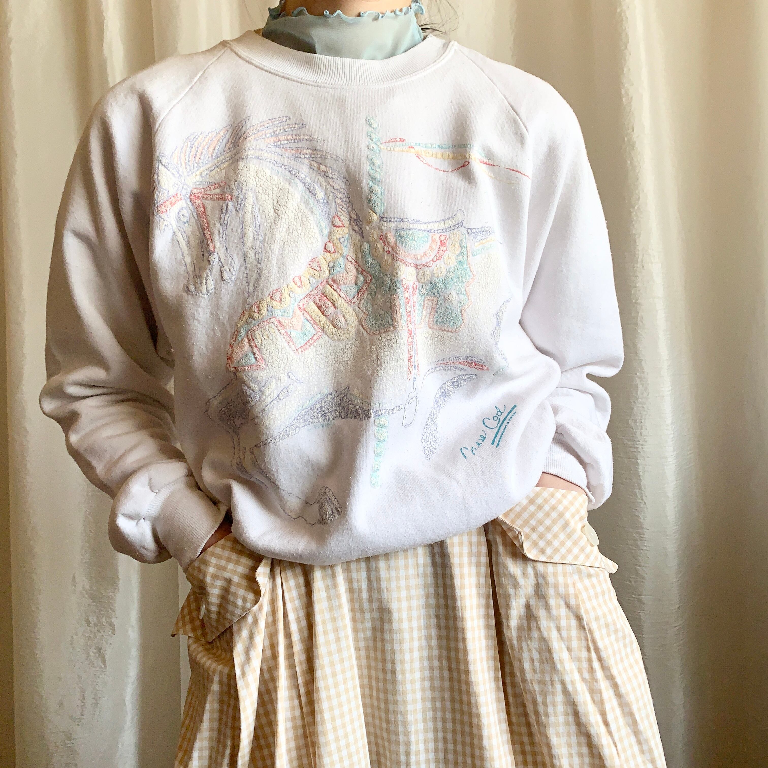 カラフルなカルーセルが描かれたホワイトトレーナー。