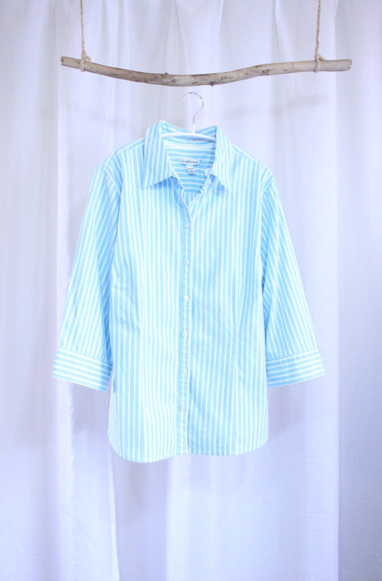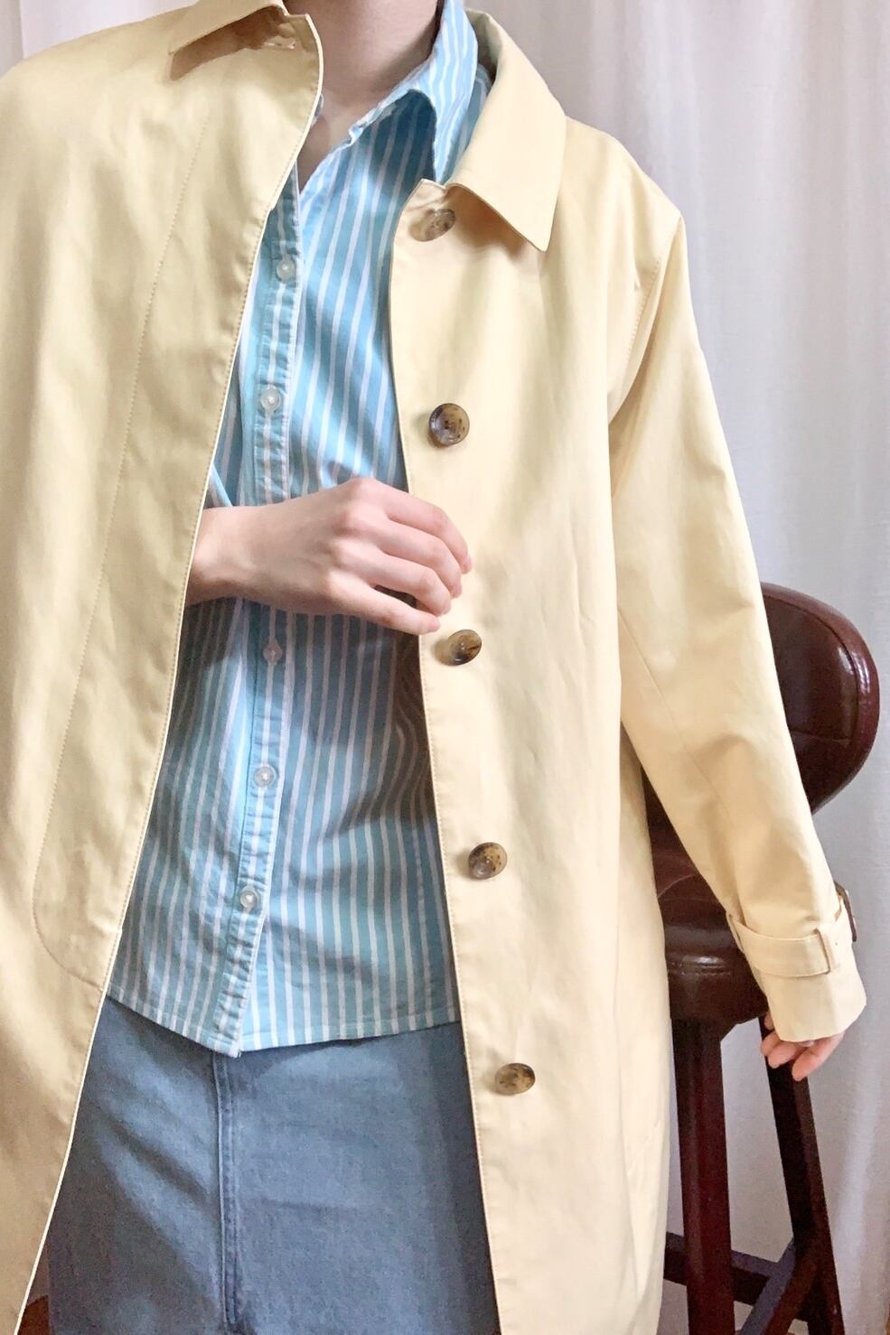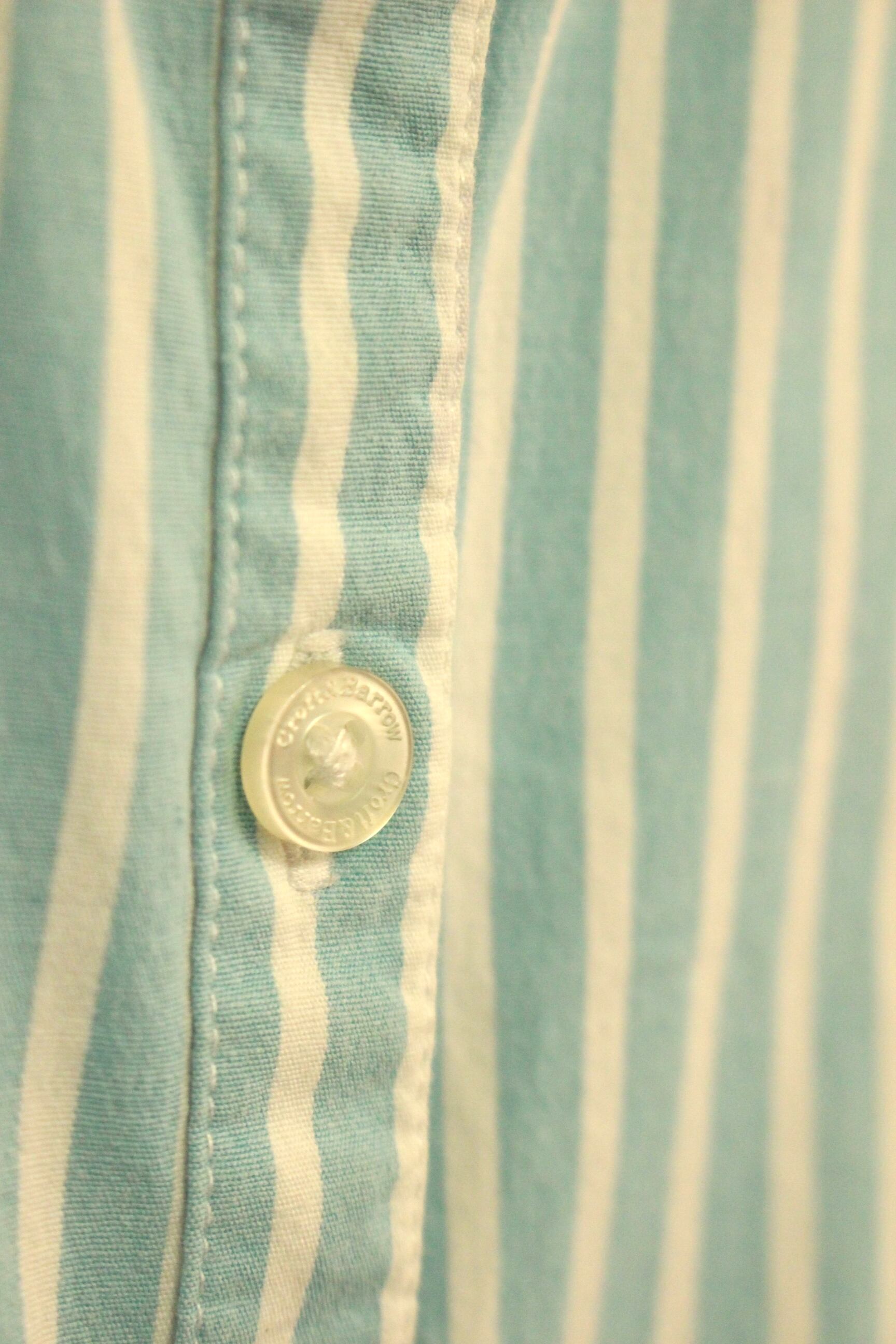 春らしさ全開のパステルブルーのストライプシャツ。