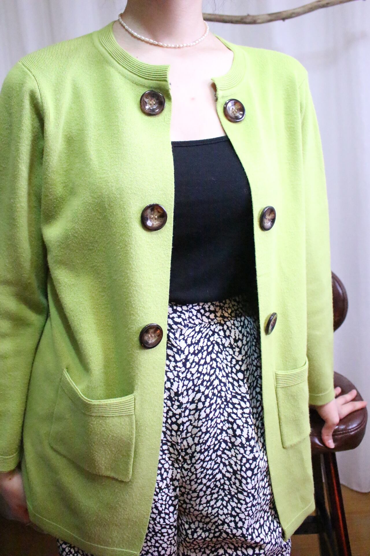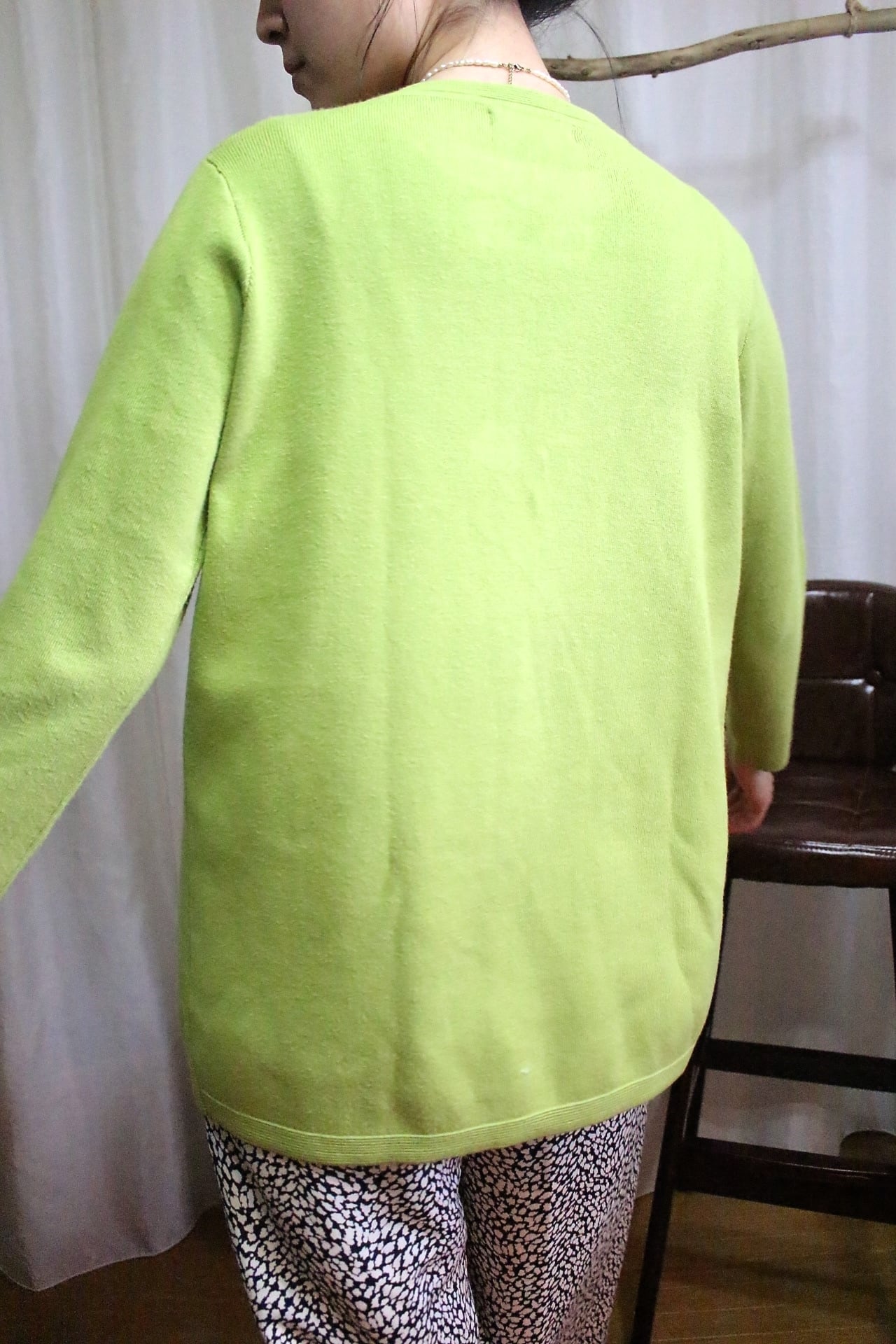 フロントの大きな丸いボタンが印象的なカーディガンニット。