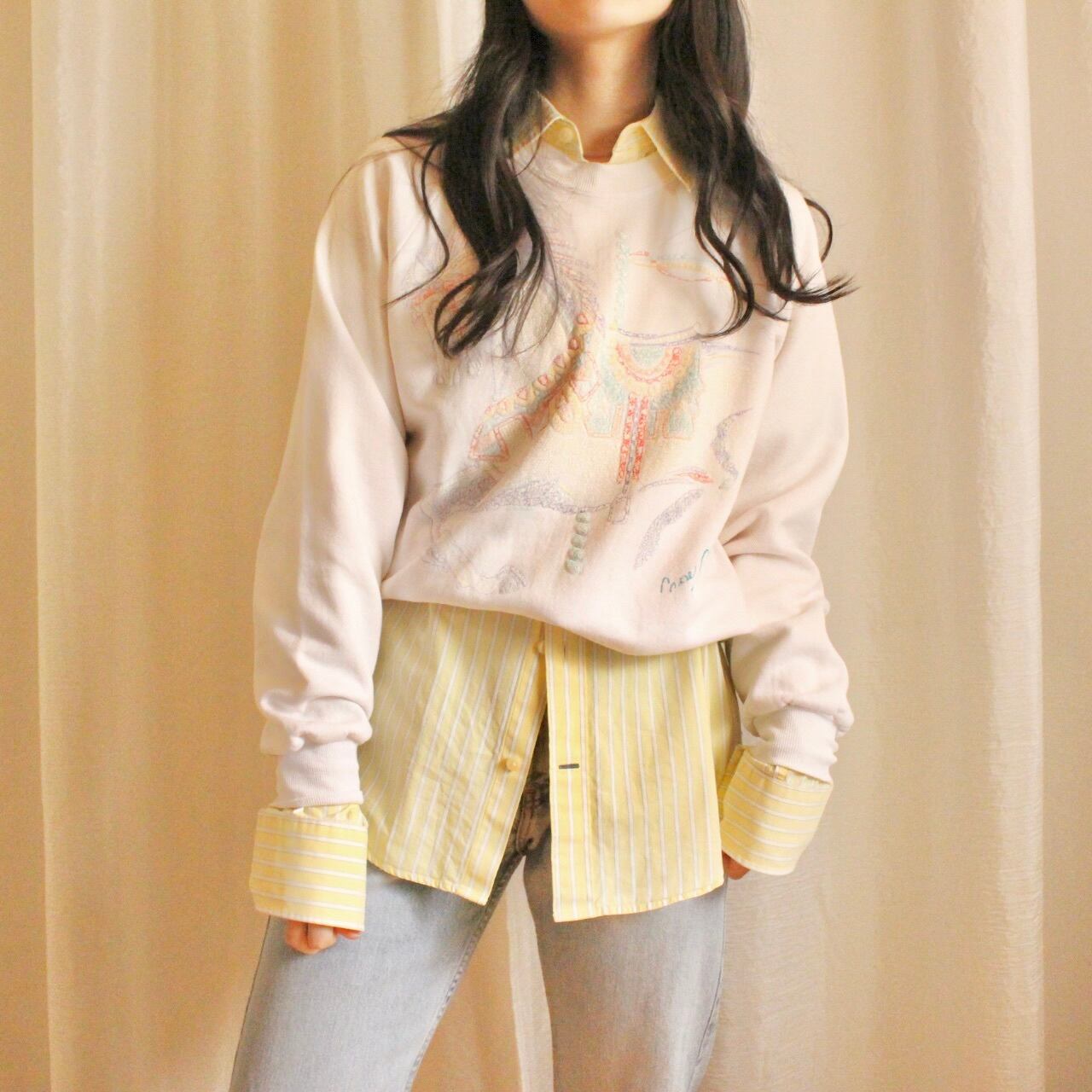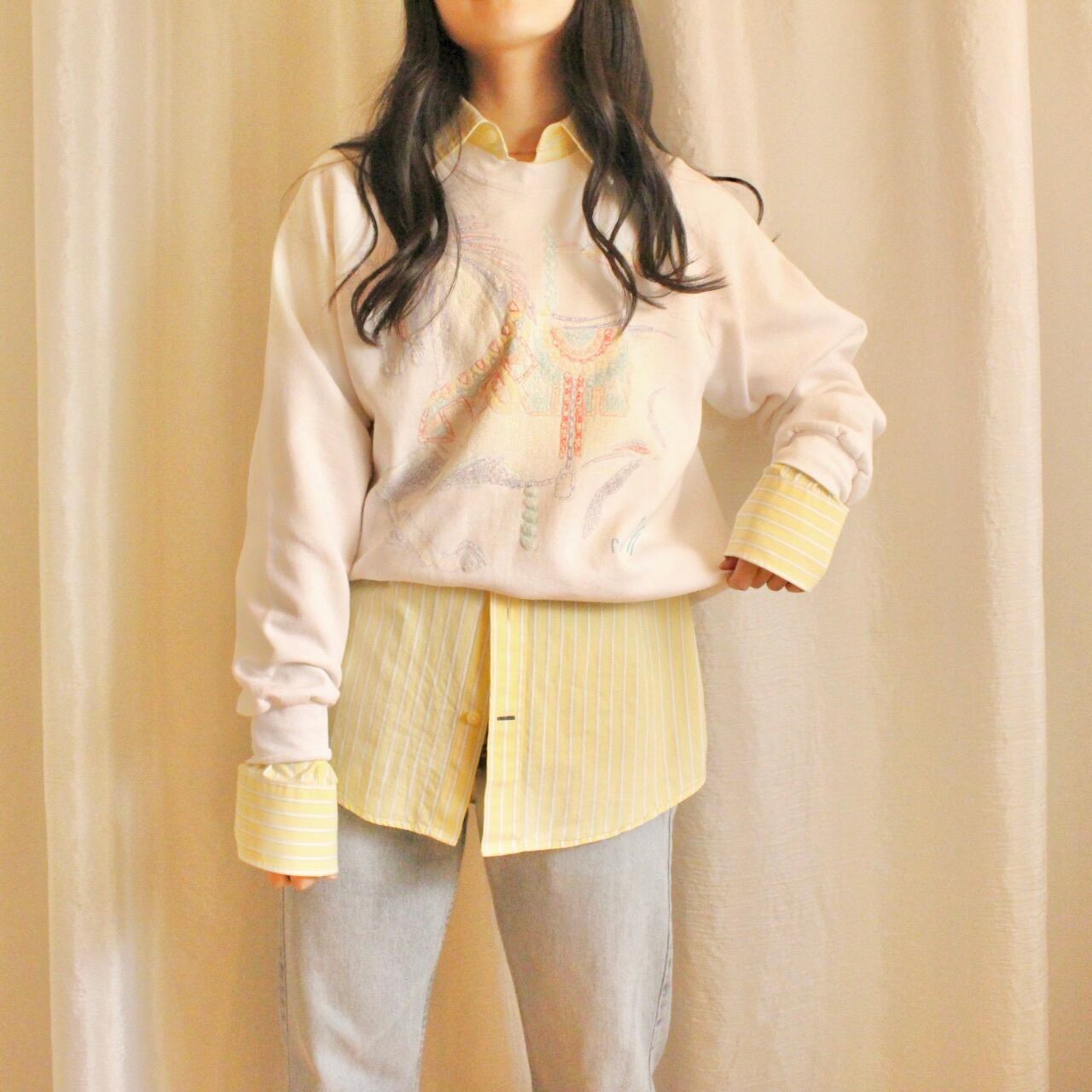 パステルイエローが春らしい柔らかな雰囲気のストライプ模様のシャツ。