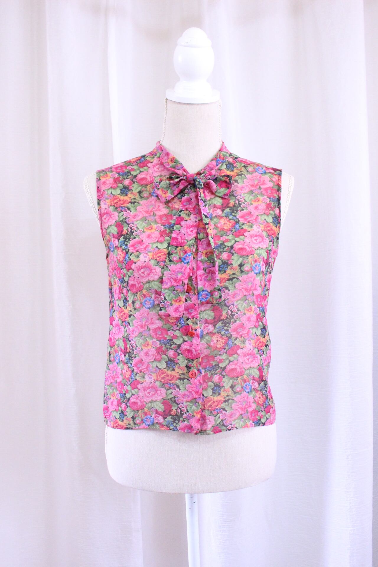 ショッキングピンクベースでとってもカラフルなノースリーブブラウス。