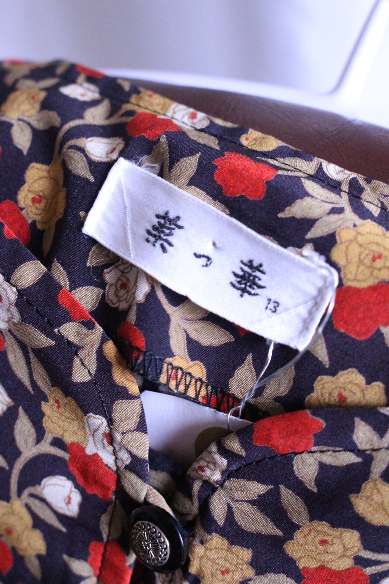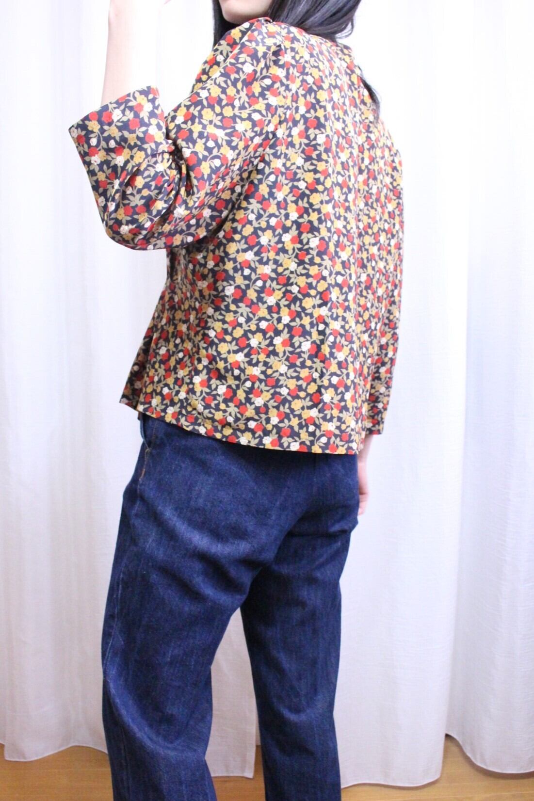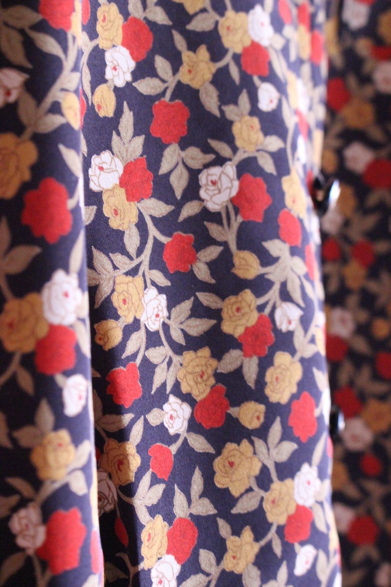 ネイビー地に赤と黄色の小花柄がしっかりと映える、まさに秋らしい一点。