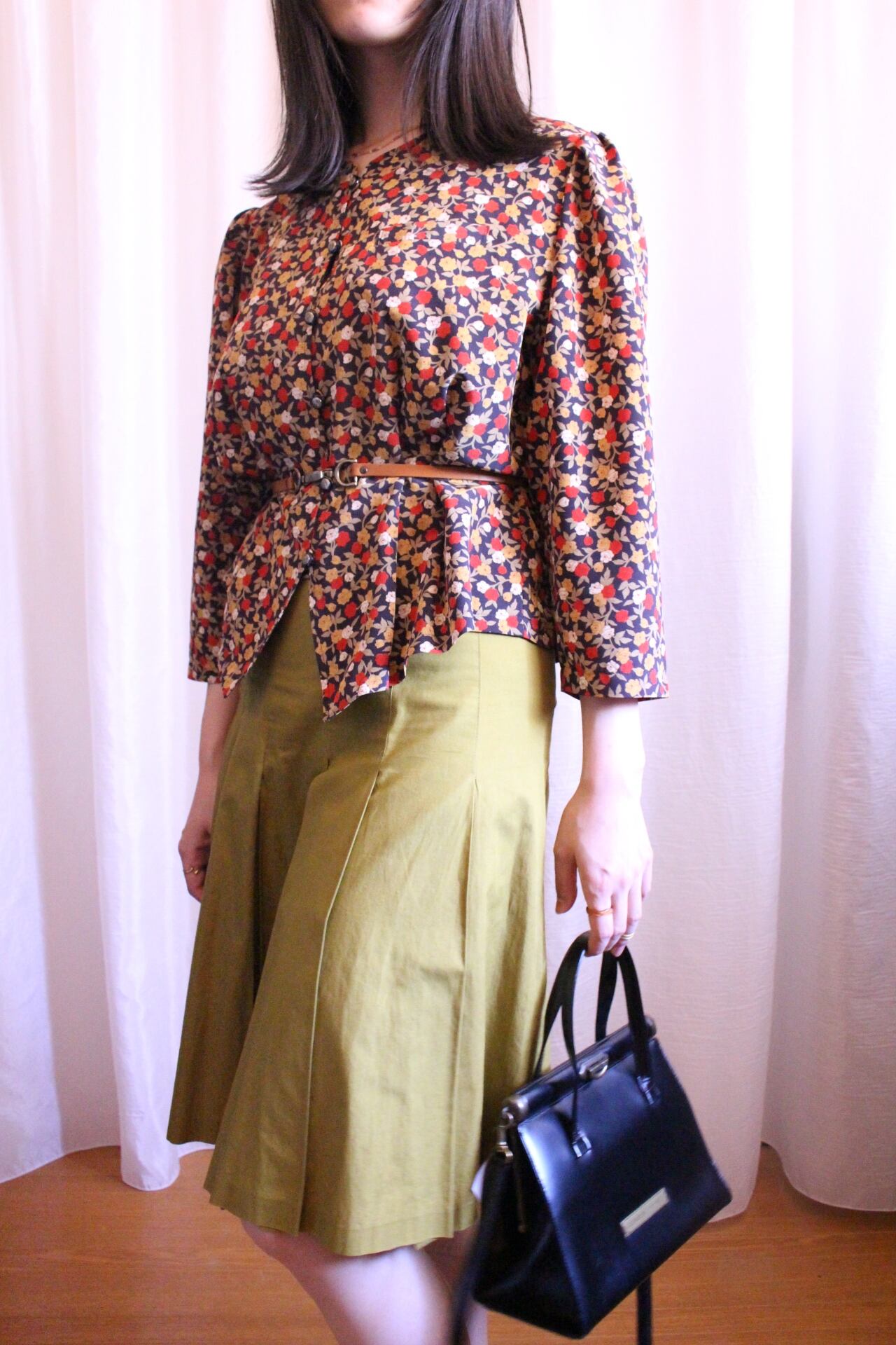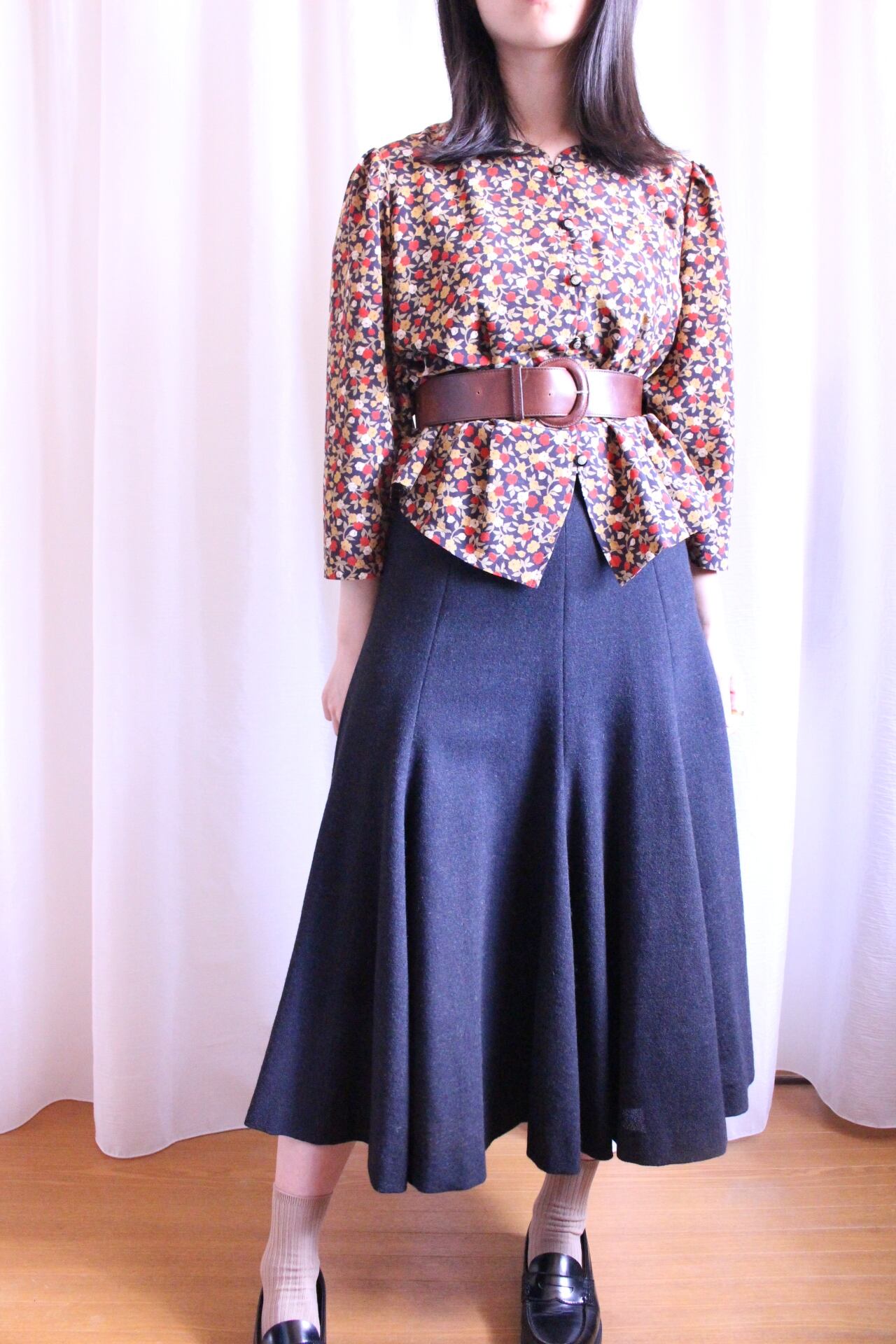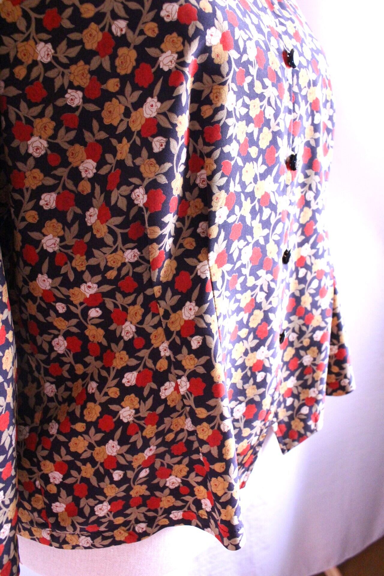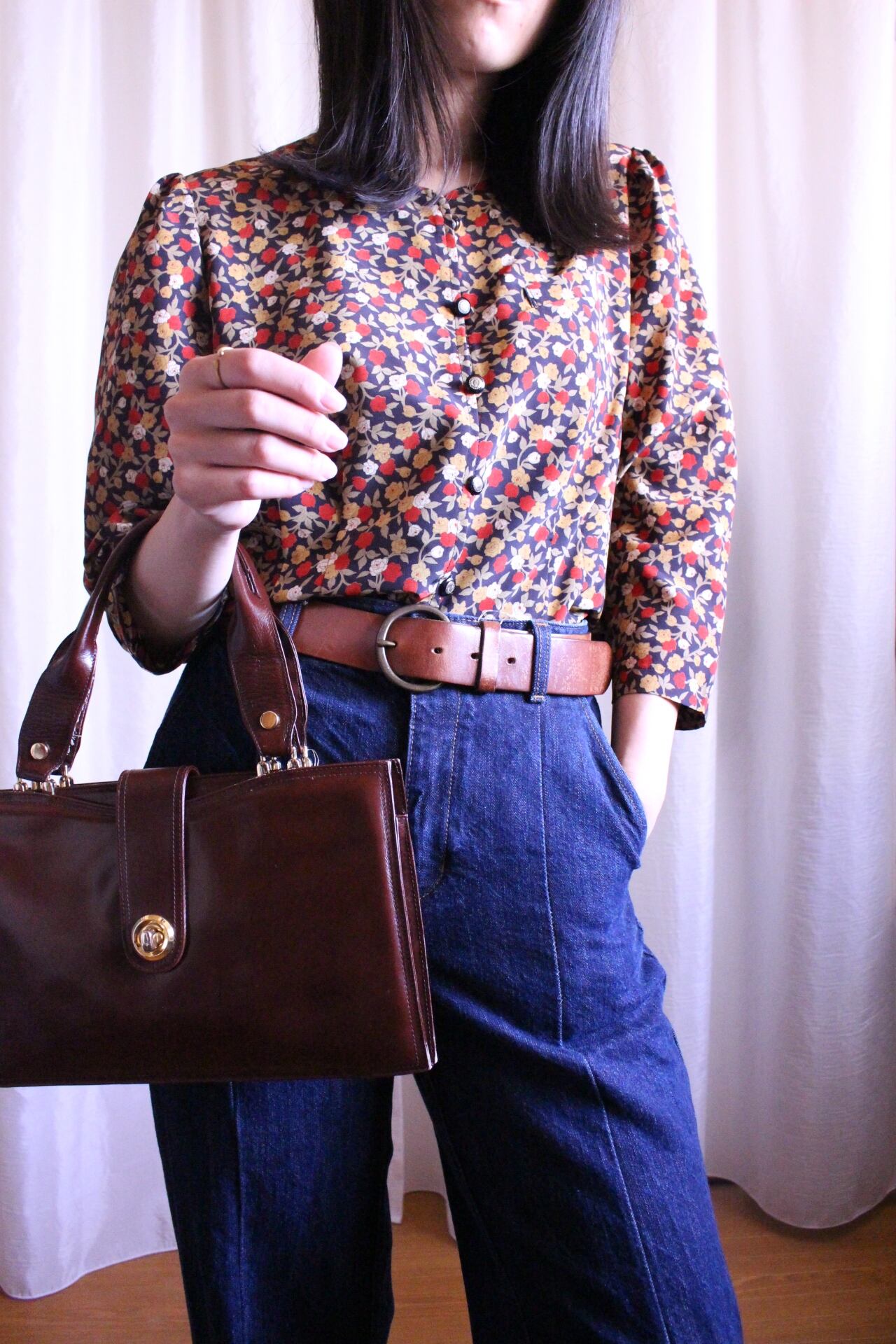 ネイビー地に赤と黄色の小花柄がしっかりと映える、まさに秋らしい一点。