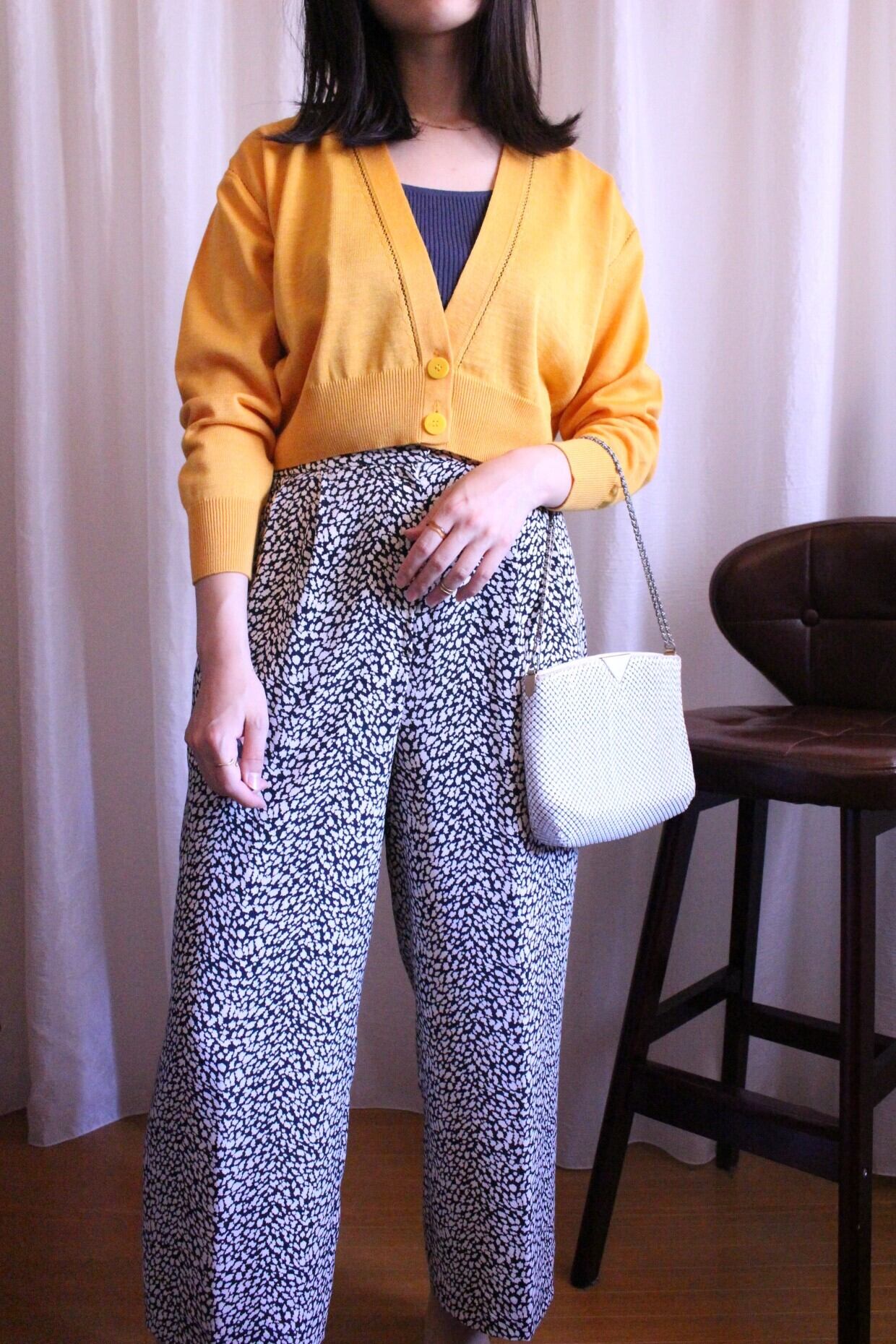 前がざっくりと開くので、インナーの柄を見せて楽しんだり、タートルネックも似合うと思います?