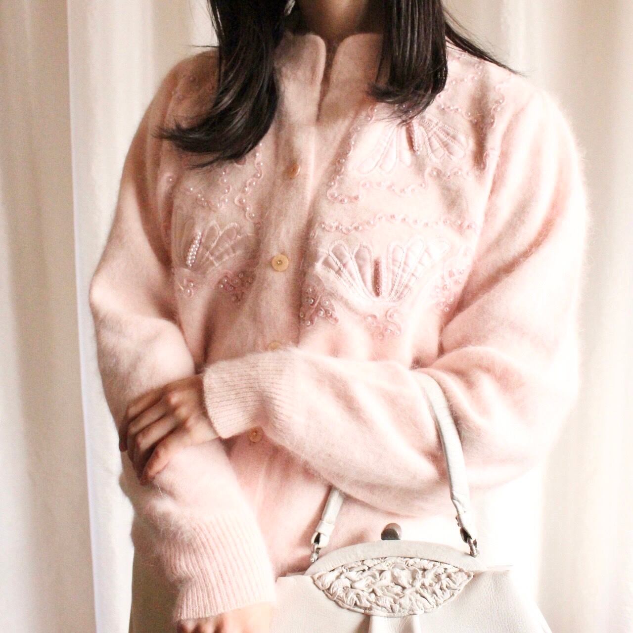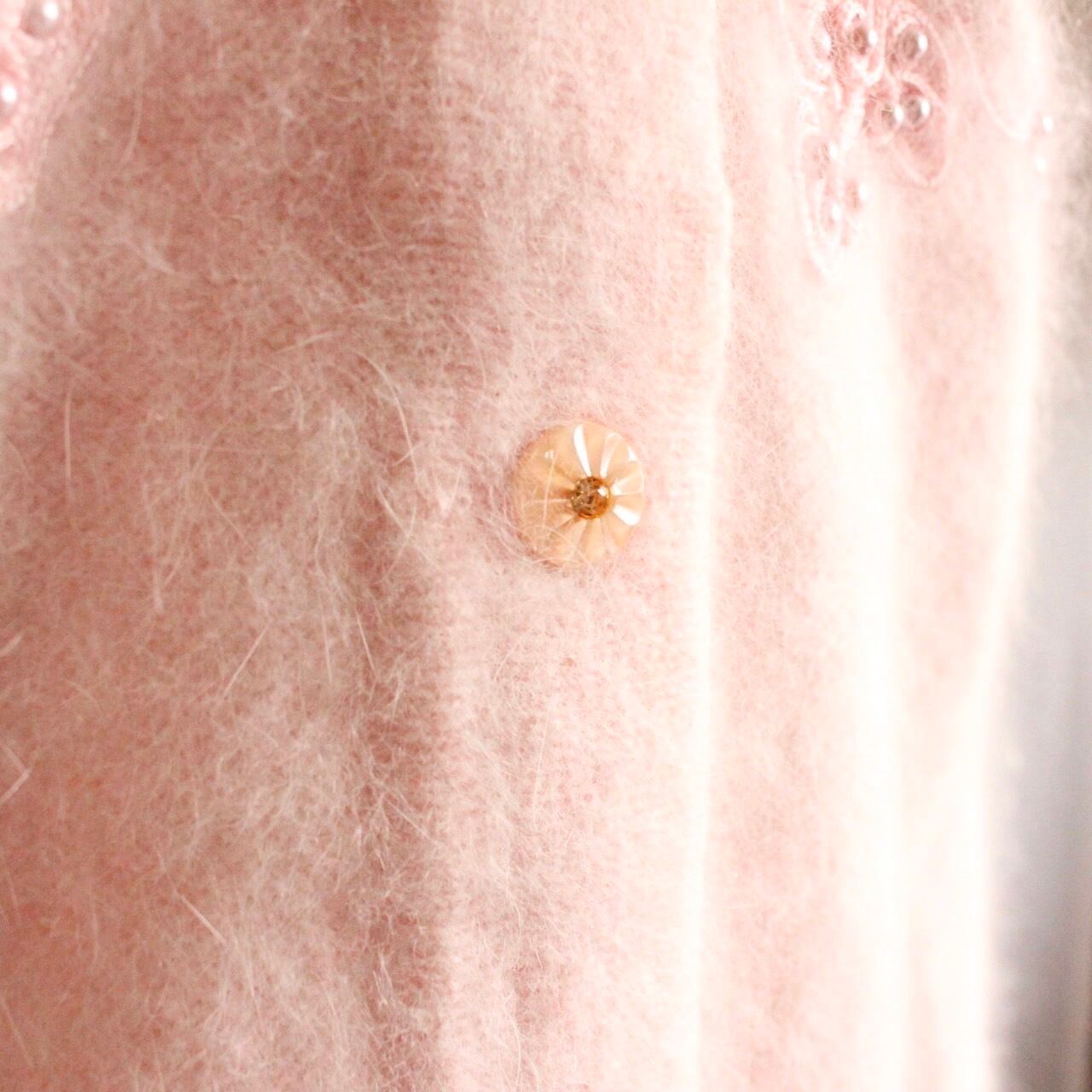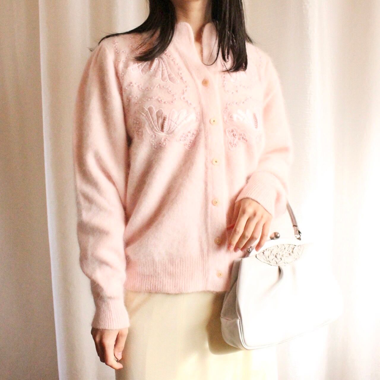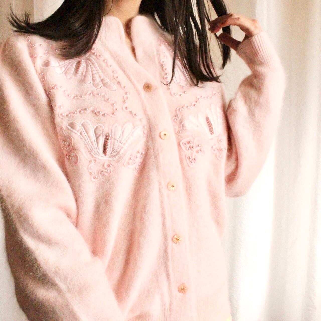 ふわっと肌触りがとっても気持ちの良い、上品なベビーピンクのニットカーディガン。