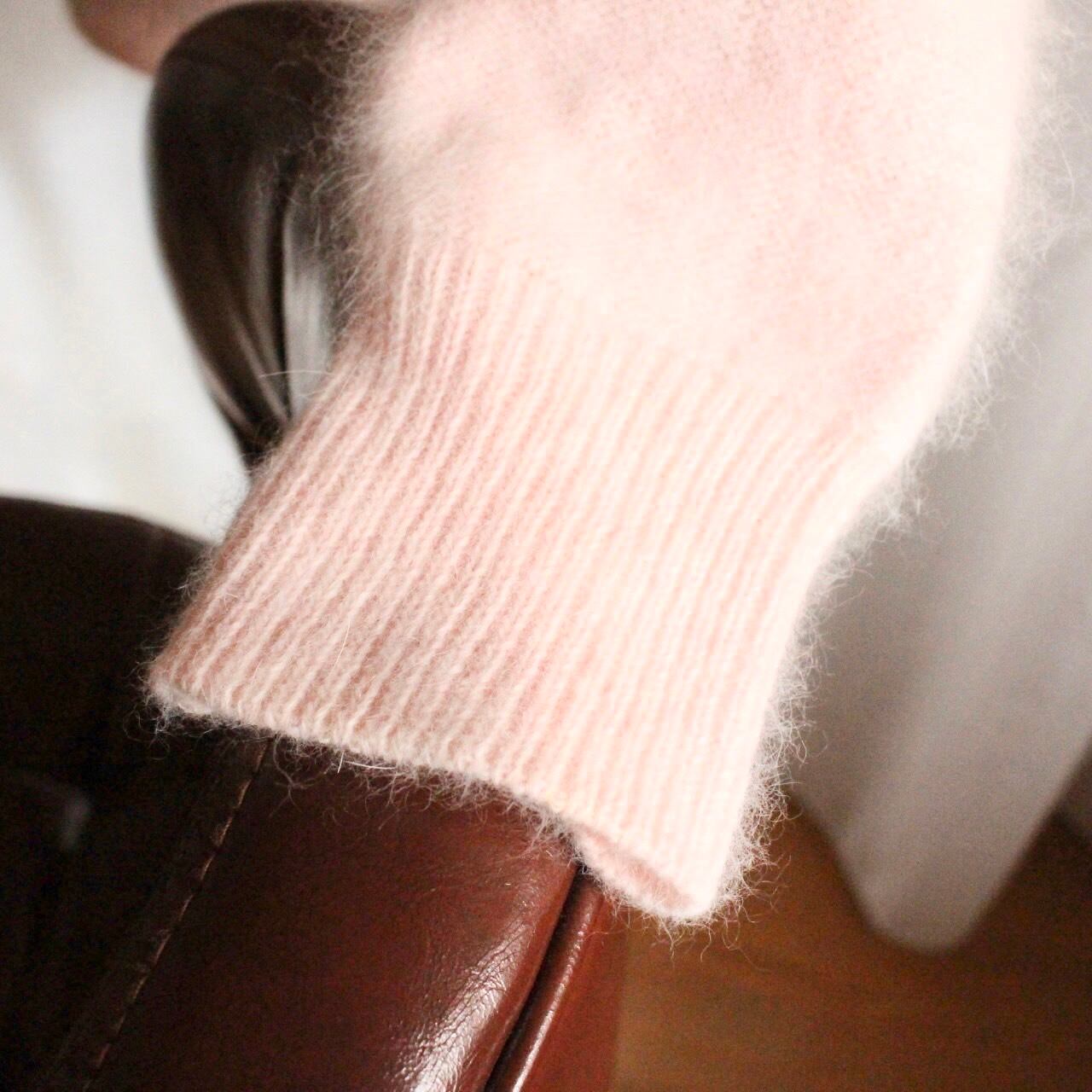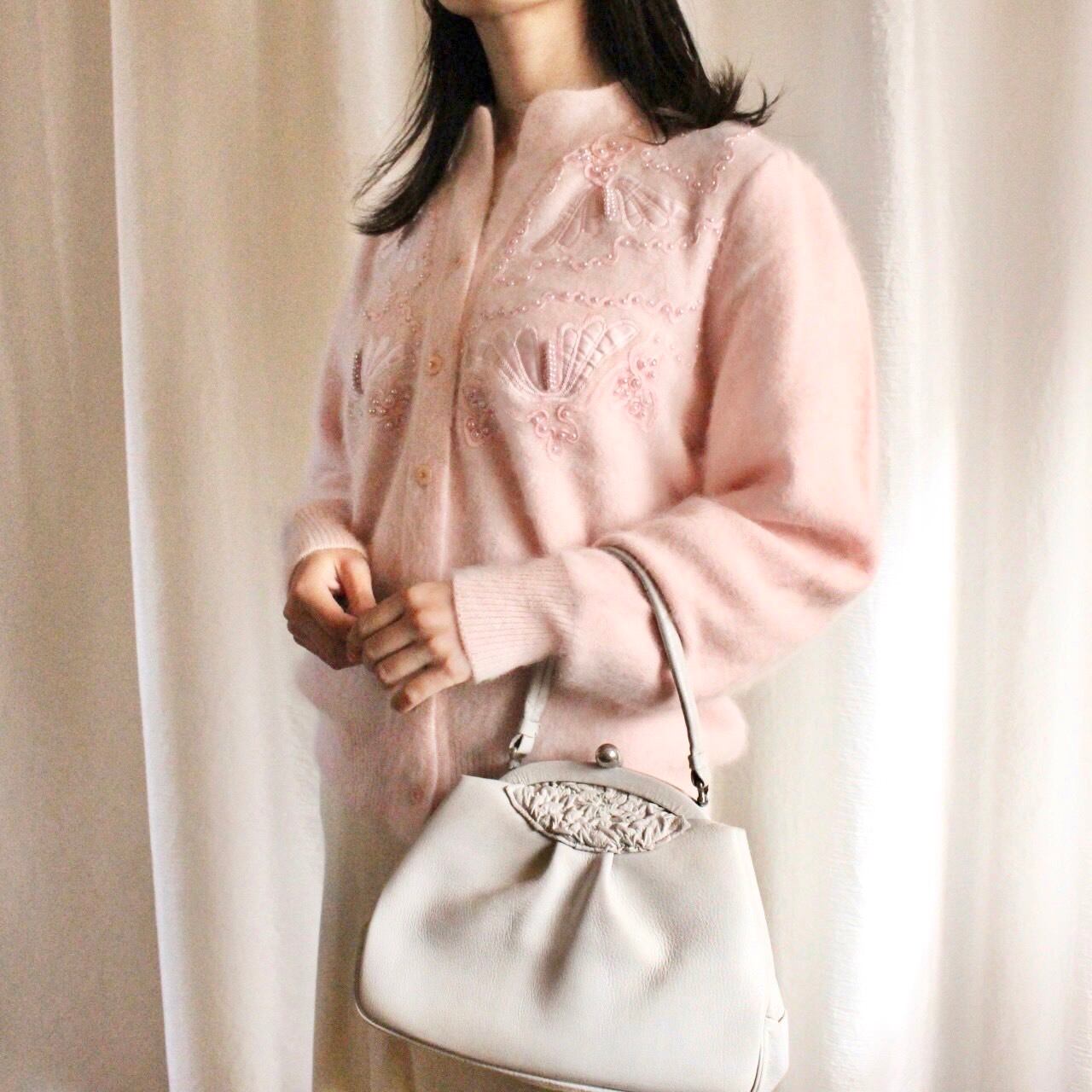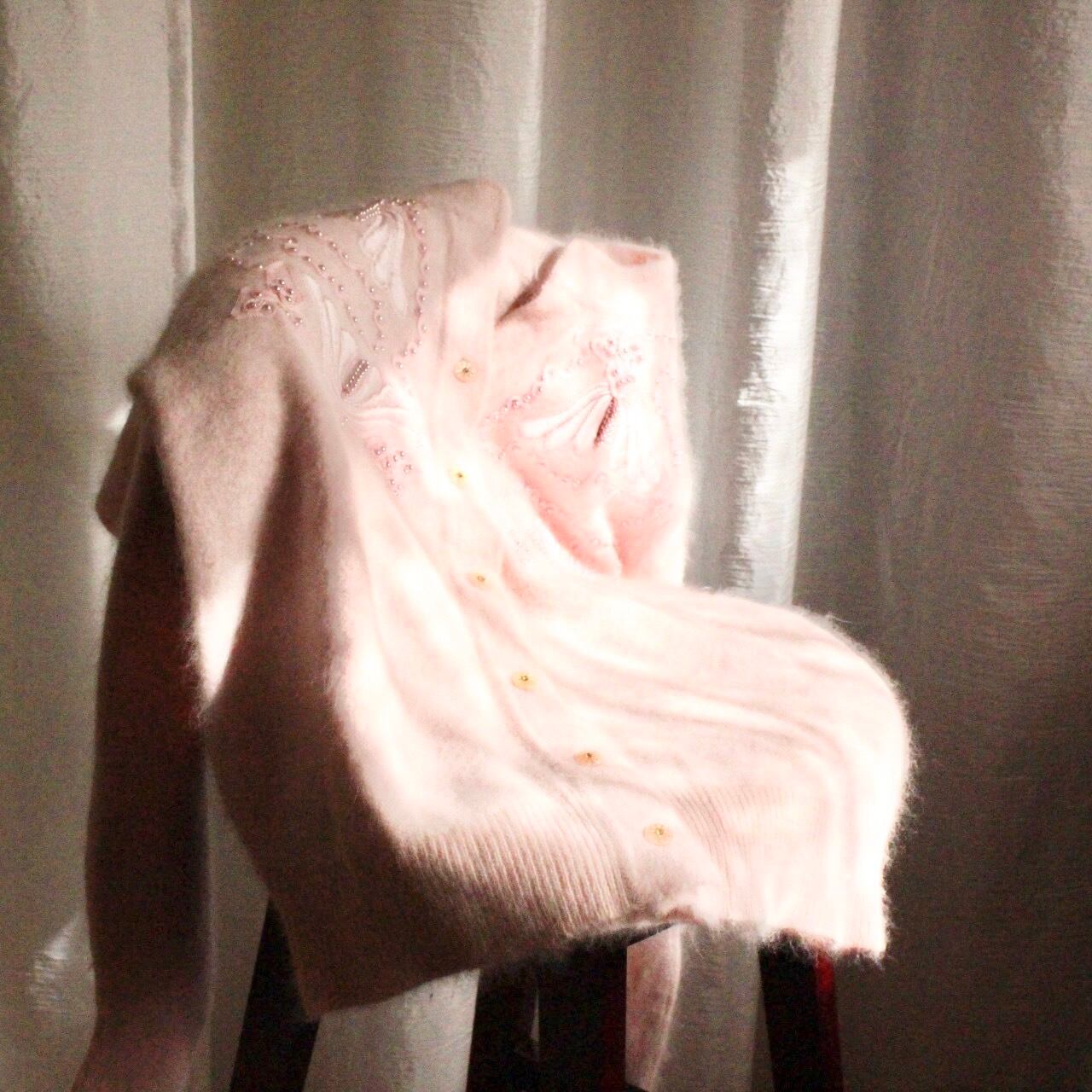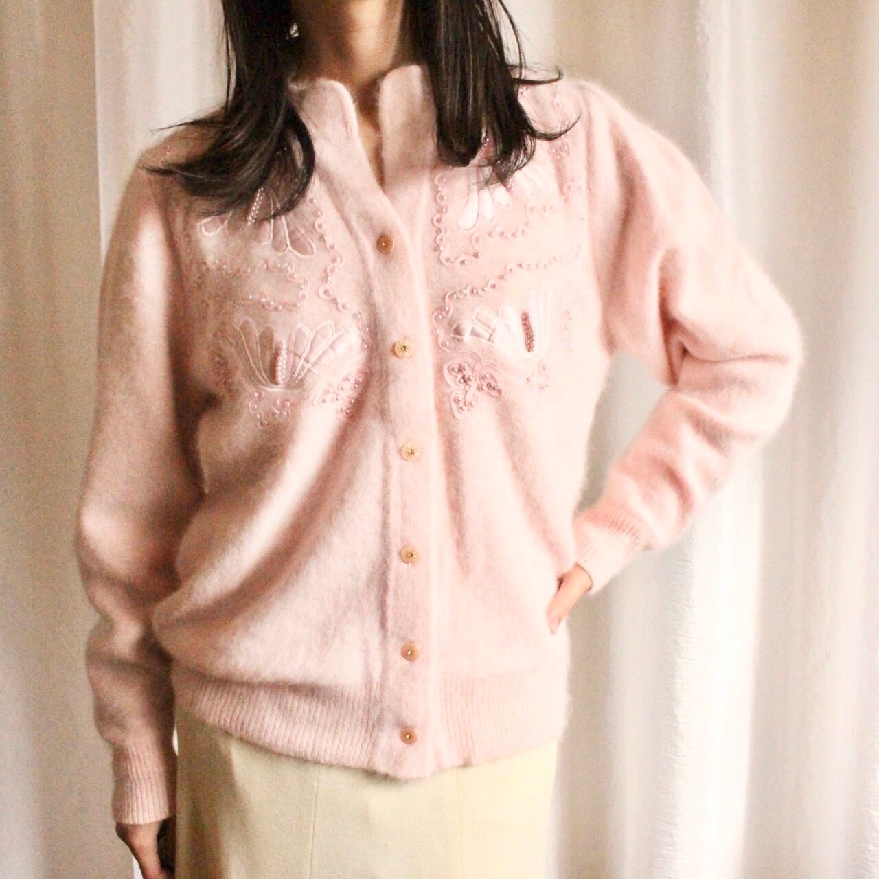 ふわっと肌触りがとっても気持ちの良い、上品なベビーピンクのニットカーディガン。